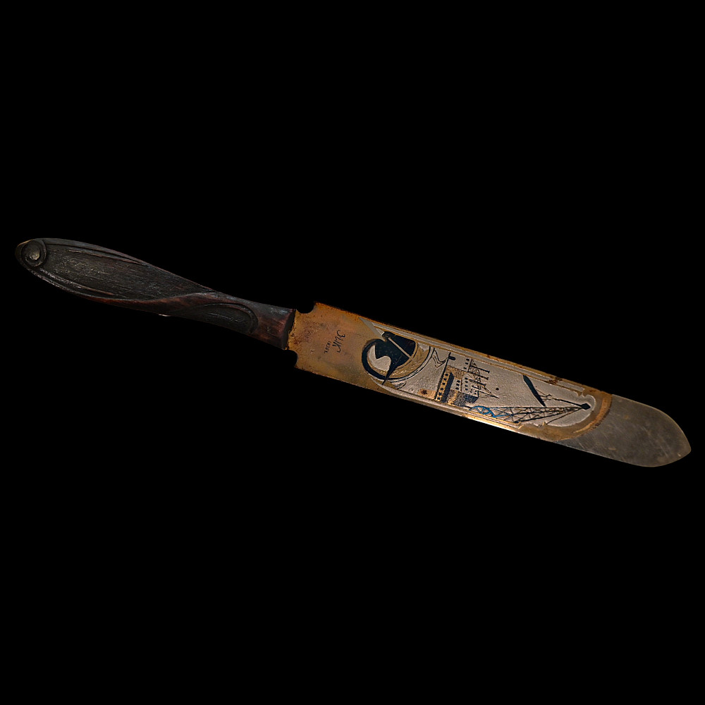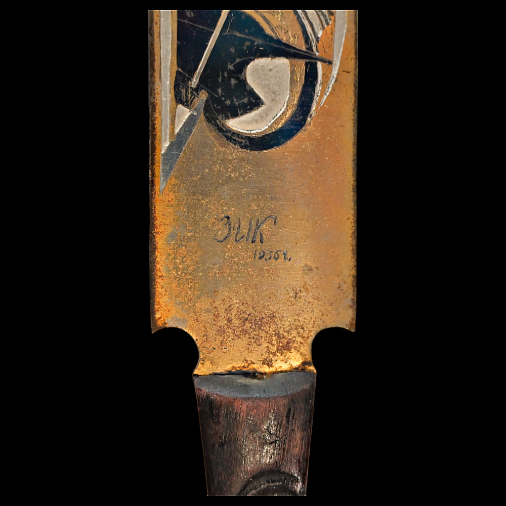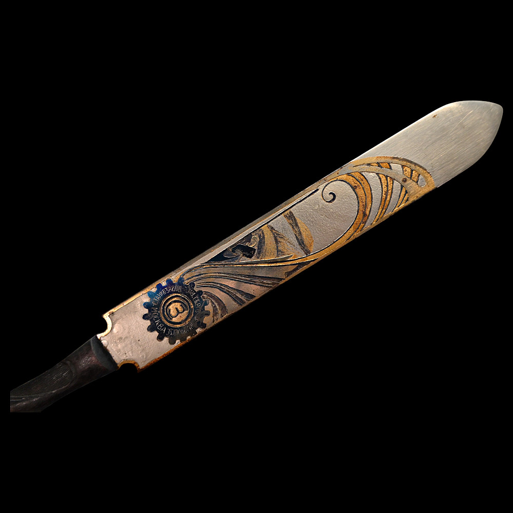 Extra Rare Presentation Paper Knife, blued and gilded, Zlatoust, Russia 1936. The steel blade is decorated on both sides with quilling and decor in the traditional manner of decorating the weapons of the Zlatoust Instrumental Plant. At the base of the blade is the logo and inscription "Stanko Zavod im. Sergo Ordzhenekidze Moscow", on the back of the blade is the inscription "ZIK 1936". Original wooden handle. A wonderful artifact telling about the early period in the history of the Soviet Union. Good condition. Length cm.
