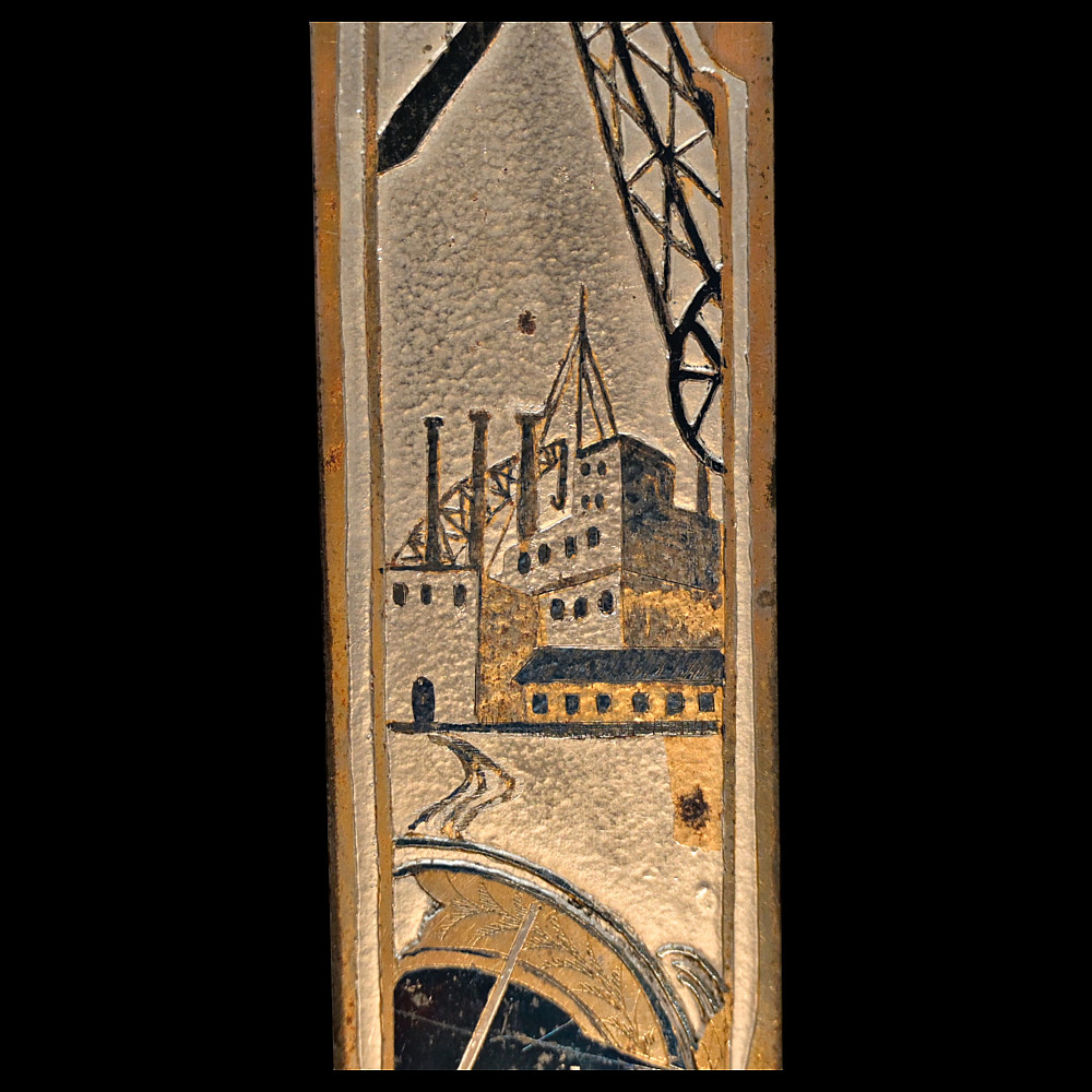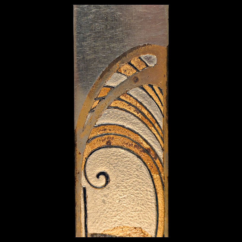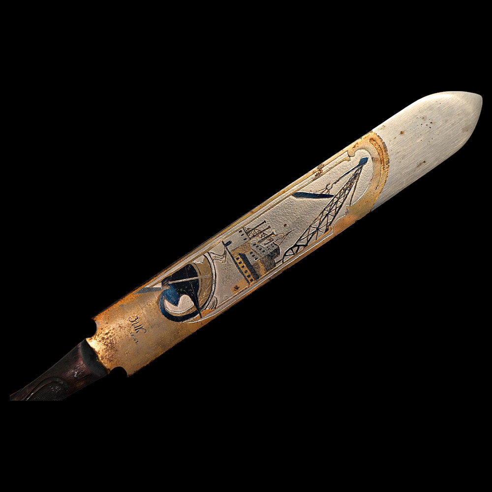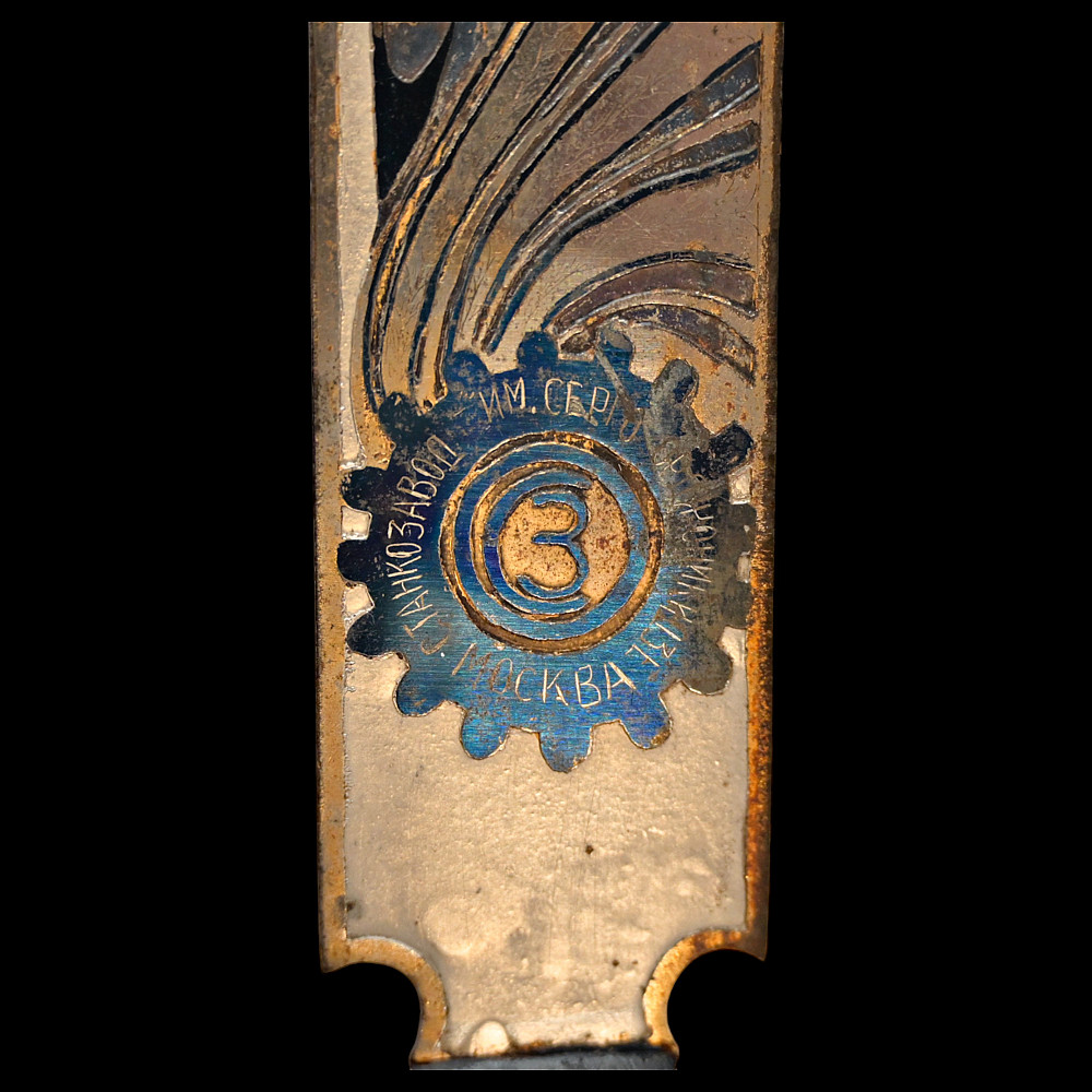 Extra Rare Presentation Paper Knife, blued and gilded, Zlatoust, Russia 1936. The steel blade is decorated on both sides with quilling and decor in the traditional manner of decorating the weapons of the Zlatoust Instrumental Plant. At the base of the blade is the logo and inscription "Stanko Zavod im. Sergo Ordzhenekidze Moscow", on the back of the blade is the inscription "ZIK 1936". Original wooden handle. A wonderful artifact telling about the early period in the history of the Soviet Union. Good condition. Length cm.