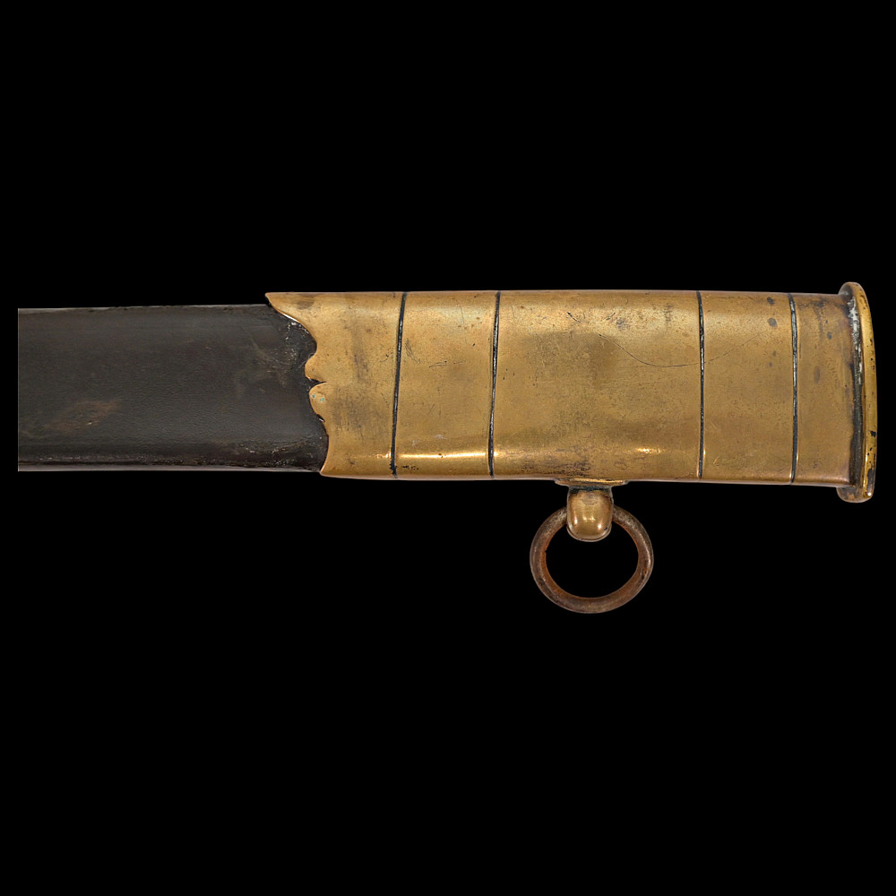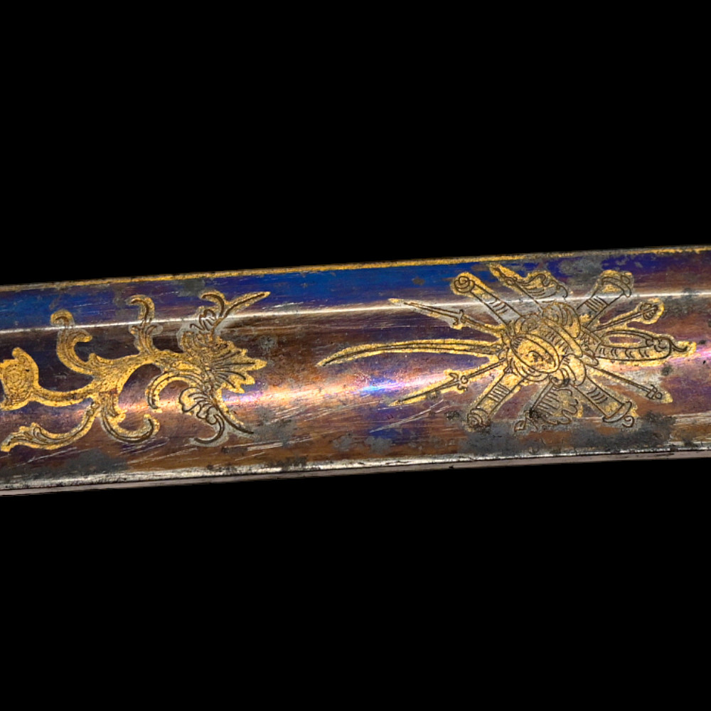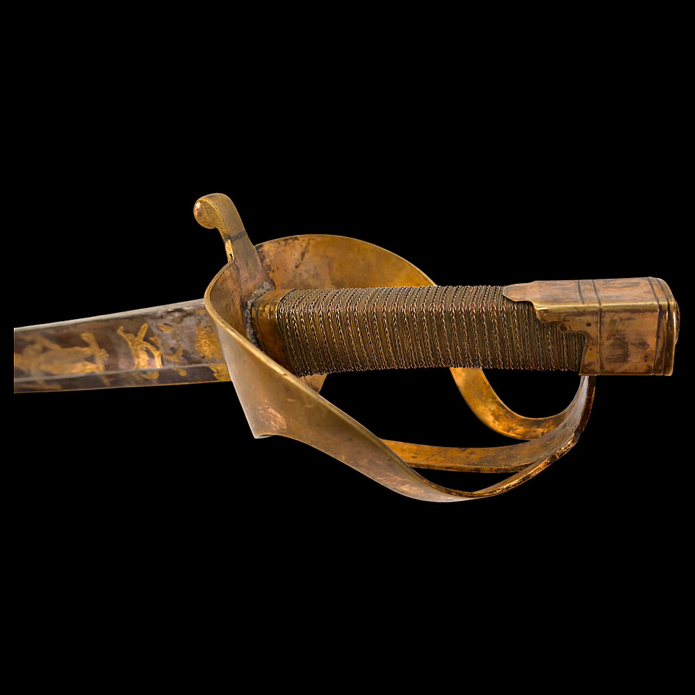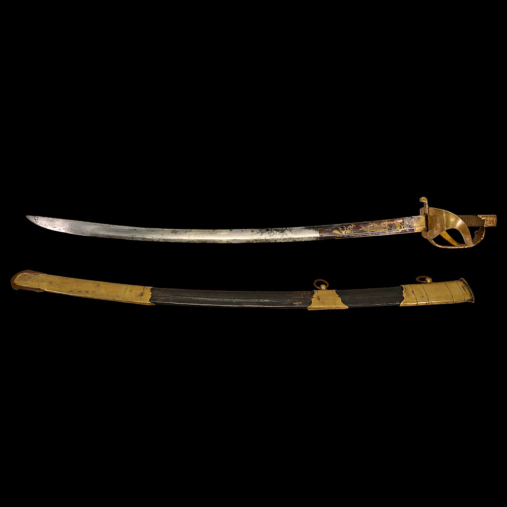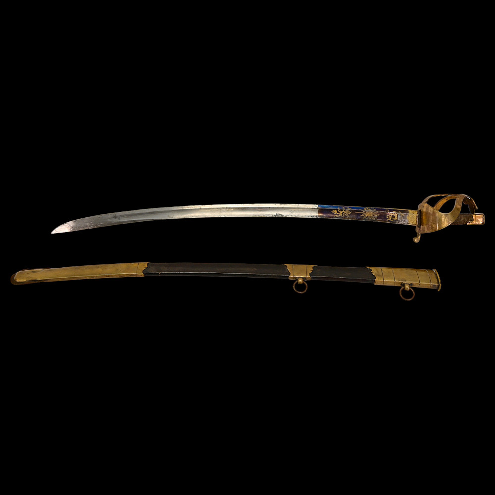 An extra rare Saber of the Representative of the People in the Army or of General Officer, Revolutionary period (c 1792-1793). An exceptionally fine French saber dating to the late 18th century, distinguished by its gilded and blued decorations and elegant proportions. The curved single-edged blade with wide fuller features richly preserved blue-and-gilt panels, finely etched with trophies of arms, floral scrolls, and classical motifs, typical of high-ranking officer’s presentation weapons from the Revolutionary period. The brass, gold-plated hilt includes a three-bar guard, a quillon with rounded finial, and a four-sided pommel. The grip is wire-bound with twisted copper wire over a wooden base. Accompanied by its original scabbard, composed of brass fittings and black leather covering, with two suspension rings. This saber exemplifies the refined taste and craftsmanship of French military weaponry at the turn of the 19th century, representing both a functional combat weapon and a symbol of prestige. Often attributed to representatives of the people, this model of saber also appears in portraits of general officers. A superb and rare example of a late-18th-century French saber with blued and gilt decorations. Condition: Very good, with traces of gilding and bluing well preserved; minor age-related wear; scabbard complete. Length: approx. 100 cm.