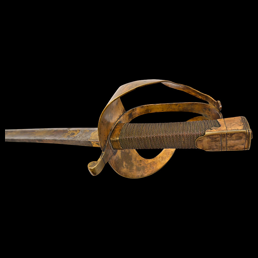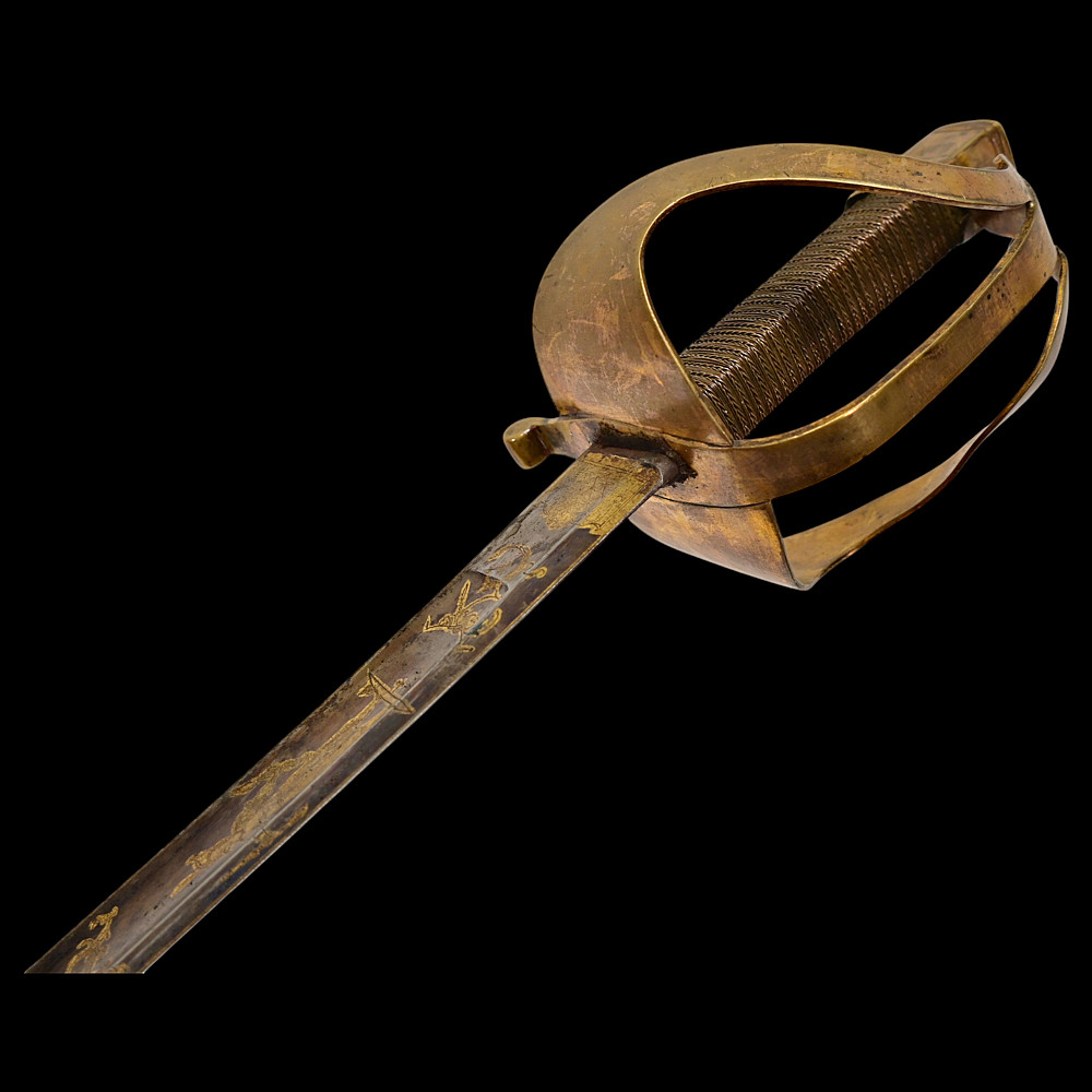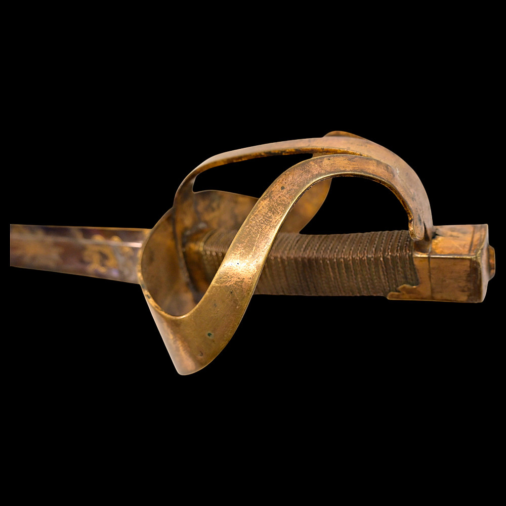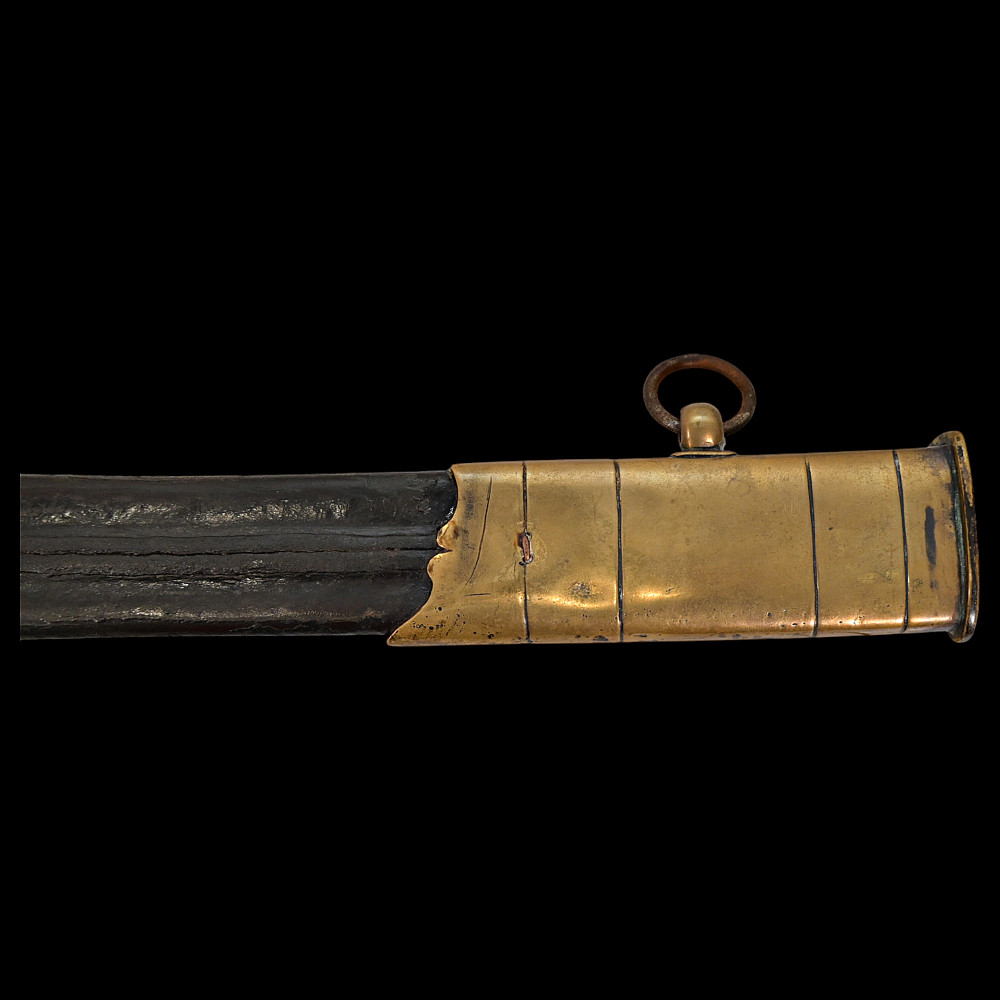 An extra rare Saber of the Representative of the People in the Army or of General Officer, Revolutionary period (c 1792-1793). An exceptionally fine French saber dating to the late 18th century, distinguished by its gilded and blued decorations and elegant proportions. The curved single-edged blade with wide fuller features richly preserved blue-and-gilt panels, finely etched with trophies of arms, floral scrolls, and classical motifs, typical of high-ranking officer’s presentation weapons from the Revolutionary period. The brass, gold-plated hilt includes a three-bar guard, a quillon with rounded finial, and a four-sided pommel. The grip is wire-bound with twisted copper wire over a wooden base. Accompanied by its original scabbard, composed of brass fittings and black leather covering, with two suspension rings. This saber exemplifies the refined taste and craftsmanship of French military weaponry at the turn of the 19th century, representing both a functional combat weapon and a symbol of prestige. Often attributed to representatives of the people, this model of saber also appears in portraits of general officers. A superb and rare example of a late-18th-century French saber with blued and gilt decorations. Condition: Very good, with traces of gilding and bluing well preserved; minor age-related wear; scabbard complete. Length: approx. 100 cm.