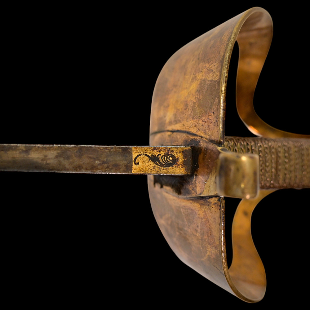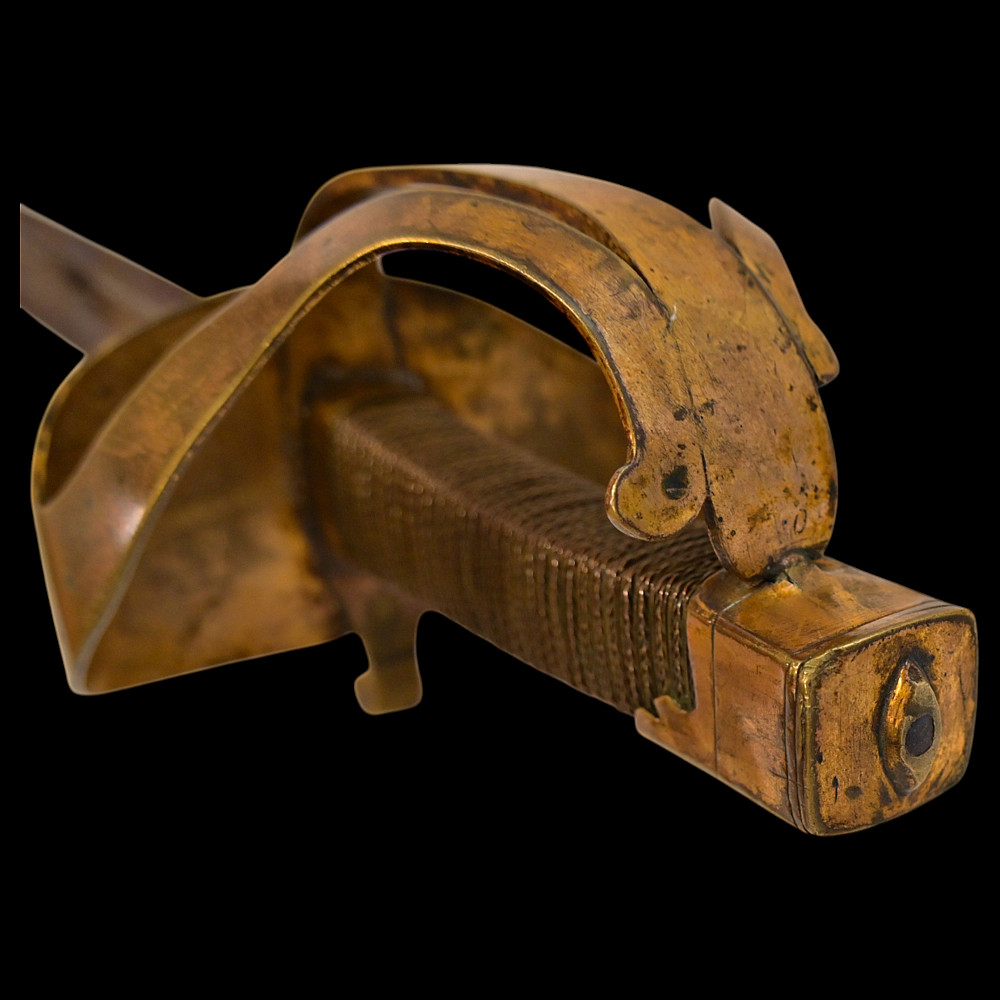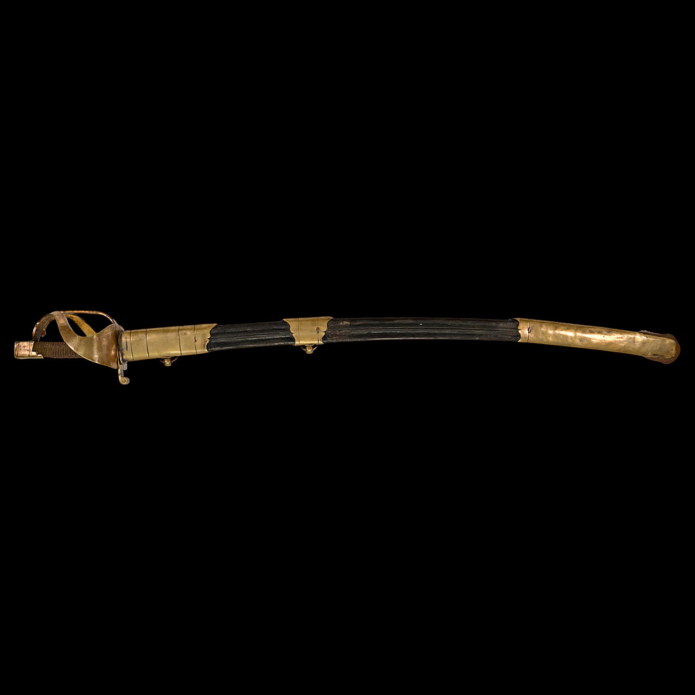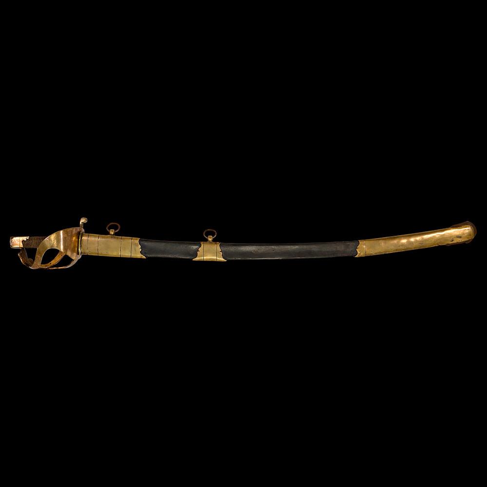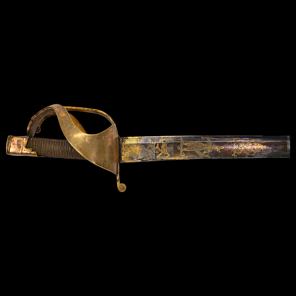 An extra rare Saber of the Representative of the People in the Army or of General Officer, Revolutionary period (c 1792-1793). An exceptionally fine French saber dating to the late 18th century, distinguished by its gilded and blued decorations and elegant proportions. The curved single-edged blade with wide fuller features richly preserved blue-and-gilt panels, finely etched with trophies of arms, floral scrolls, and classical motifs, typical of high-ranking officer’s presentation weapons from the Revolutionary period. The brass, gold-plated hilt includes a three-bar guard, a quillon with rounded finial, and a four-sided pommel. The grip is wire-bound with twisted copper wire over a wooden base. Accompanied by its original scabbard, composed of brass fittings and black leather covering, with two suspension rings. This saber exemplifies the refined taste and craftsmanship of French military weaponry at the turn of the 19th century, representing both a functional combat weapon and a symbol of prestige. Often attributed to representatives of the people, this model of saber also appears in portraits of general officers. A superb and rare example of a late-18th-century French saber with blued and gilt decorations. Condition: Very good, with traces of gilding and bluing well preserved; minor age-related wear; scabbard complete. Length: approx. 100 cm.