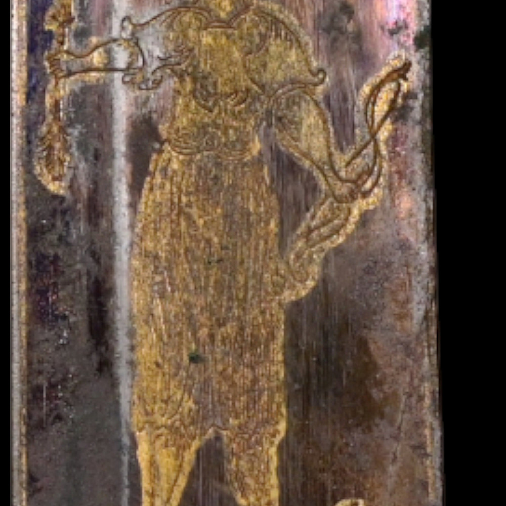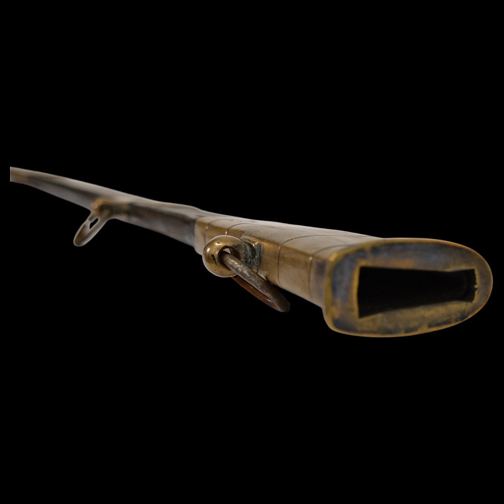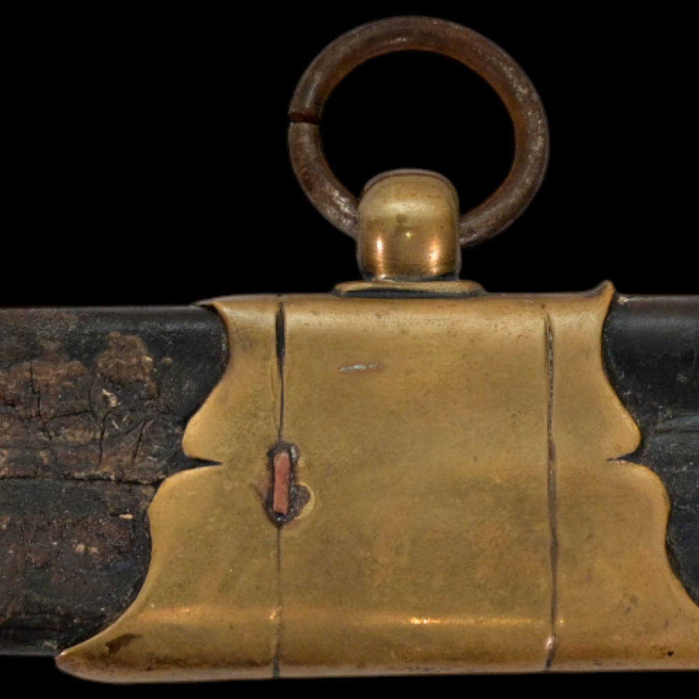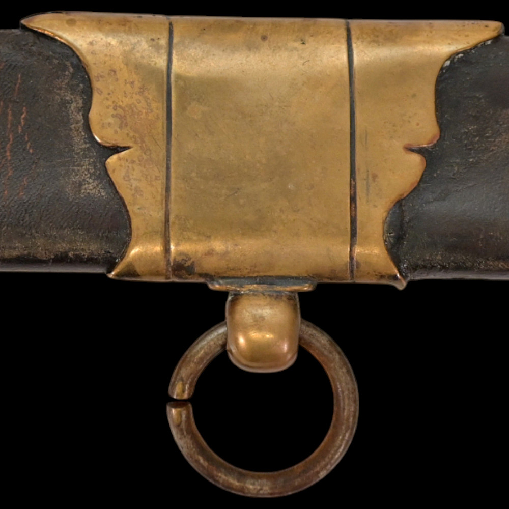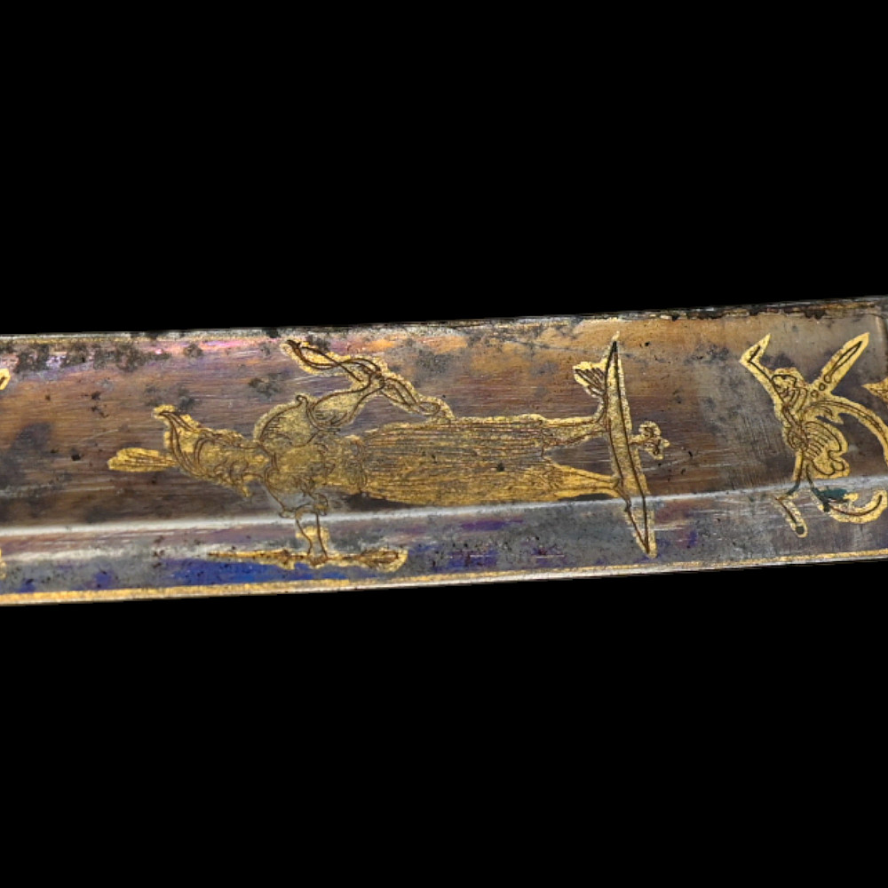 An extra rare Saber of the Representative of the People in the Army or of General Officer, Revolutionary period (c 1792-1793). An exceptionally fine French saber dating to the late 18th century, distinguished by its gilded and blued decorations and elegant proportions. The curved single-edged blade with wide fuller features richly preserved blue-and-gilt panels, finely etched with trophies of arms, floral scrolls, and classical motifs, typical of high-ranking officer’s presentation weapons from the Revolutionary period. The brass, gold-plated hilt includes a three-bar guard, a quillon with rounded finial, and a four-sided pommel. The grip is wire-bound with twisted copper wire over a wooden base. Accompanied by its original scabbard, composed of brass fittings and black leather covering, with two suspension rings. This saber exemplifies the refined taste and craftsmanship of French military weaponry at the turn of the 19th century, representing both a functional combat weapon and a symbol of prestige. Often attributed to representatives of the people, this model of saber also appears in portraits of general officers. A superb and rare example of a late-18th-century French saber with blued and gilt decorations. Condition: Very good, with traces of gilding and bluing well preserved; minor age-related wear; scabbard complete. Length: approx. 100 cm.