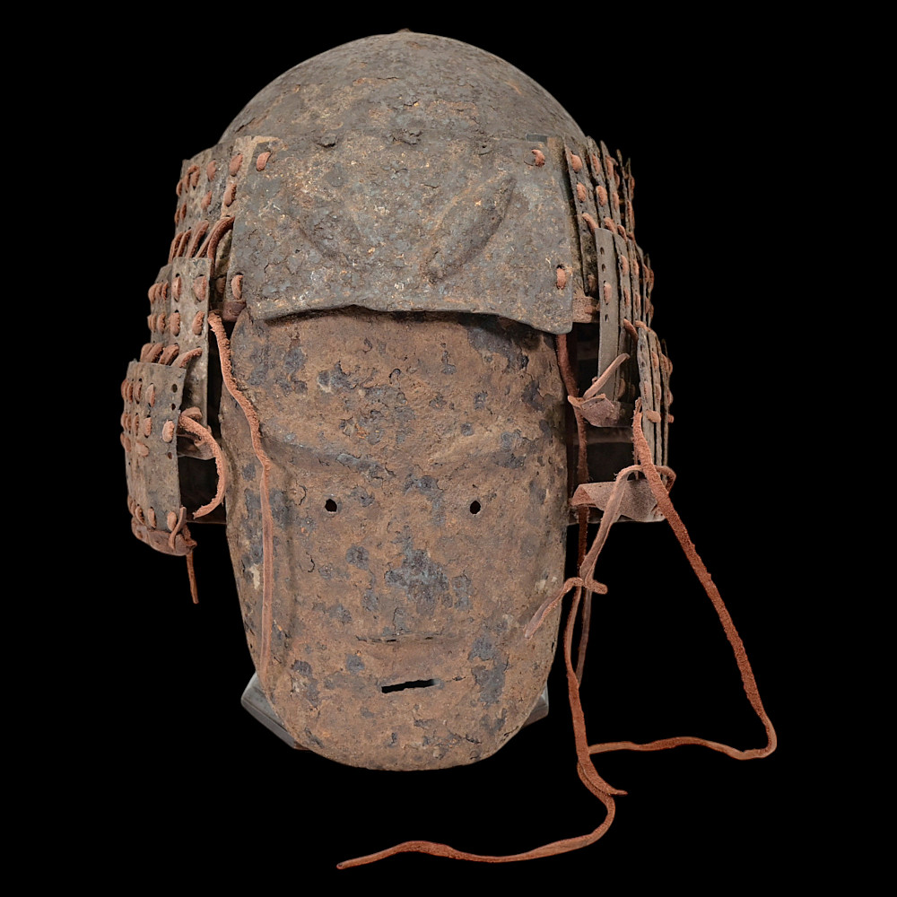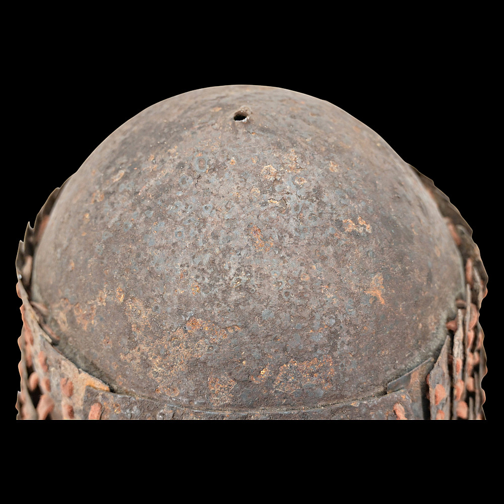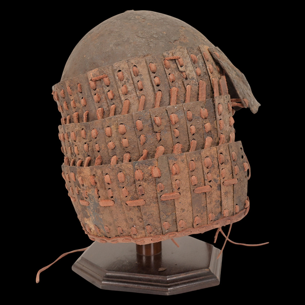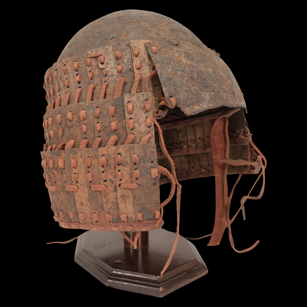 Extremely Rare Iron Helmet with Mask, Jurchen Jin Dynasty, Northern China, 12th–13th Century. An exceptional and exceedingly rare example of an early Jin dynasty (1115–1234) iron helmet with an integral face mask, attributed to the Jurchen tribes of Northern China. Constructed from forged iron plates, fastened together with rivets and lacings of reddish-brown leather (Leather laces, modern reconstruction), this helmet features overlapping lamellar plates forming the neck guard and sides. The front bears a sculpted, stylized iron mask with human facial features — deep eye sockets, a pronounced brow, and a narrow slit for the mouth — intended to inspire fear in the enemy while protecting the warrior’s face. Such helmets are exceptionally scarce; they represent the transitional stage between early steppe lamellar armor and later Mongol-influenced helmets of the Yuan period. A museum-worthy relic of early medieval East Asian warfare—powerful, haunting, and of remarkable rarity. Good condition for his age. Mask size: approximately 23 x 16 cm. Helmet height without mask: approximately 27 cm.
