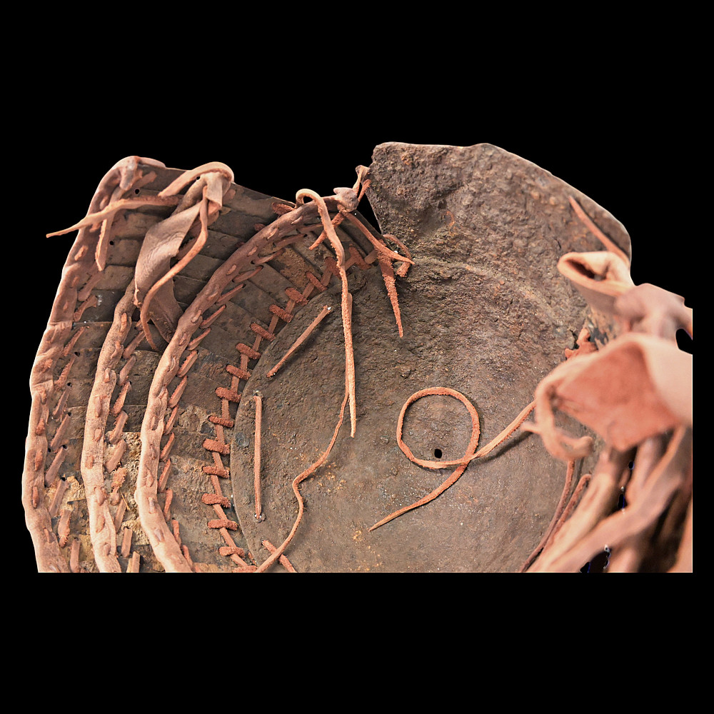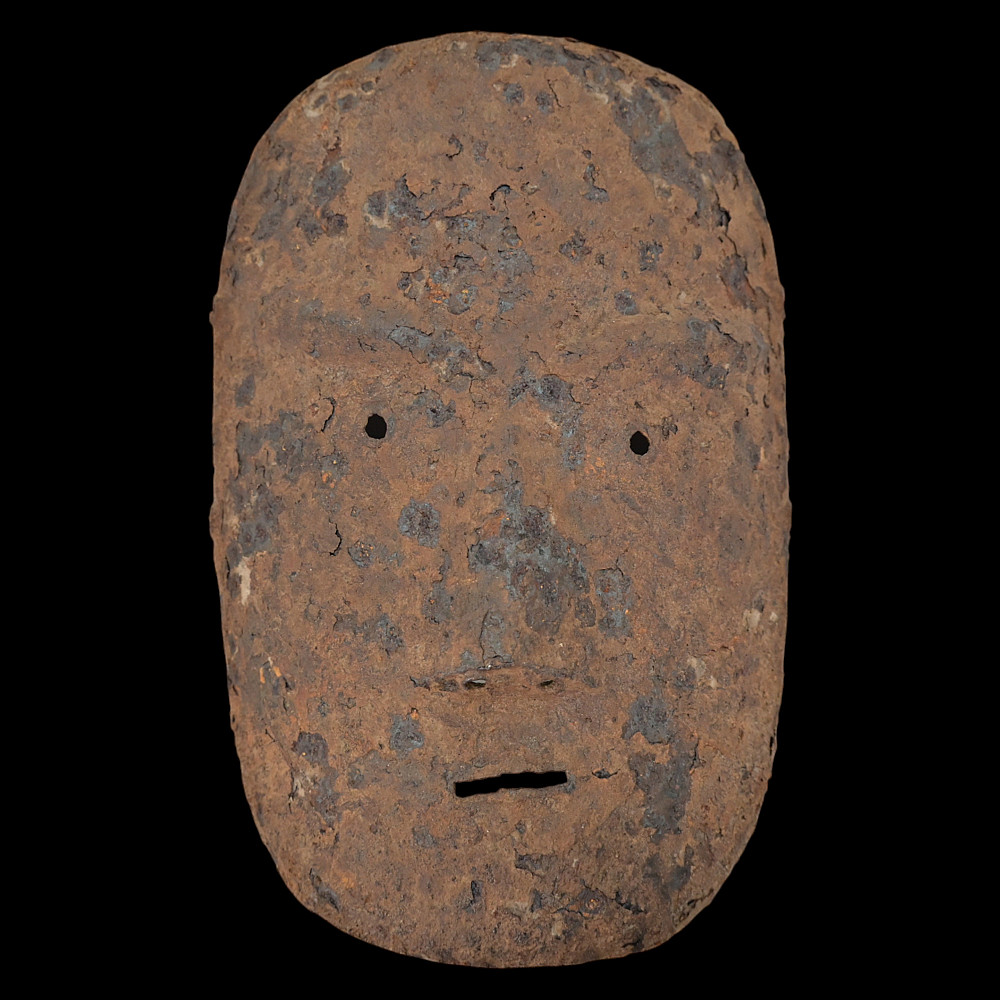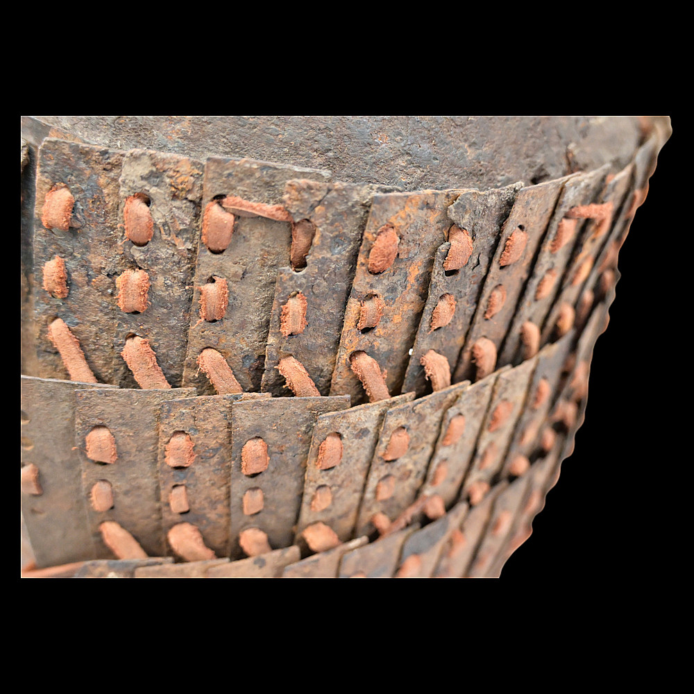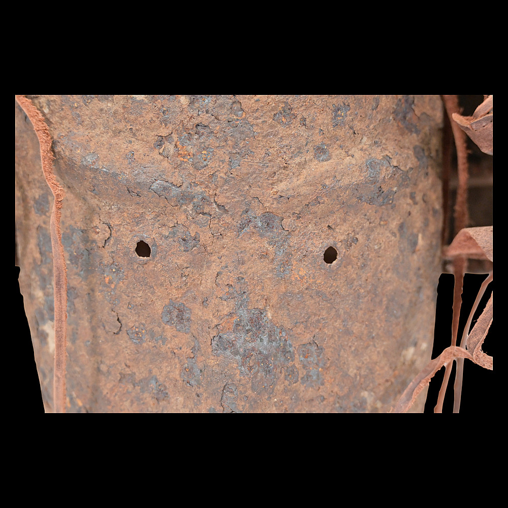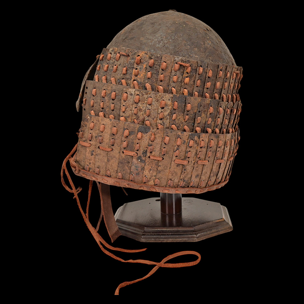 Extremely Rare Iron Helmet with Mask, Jurchen Jin Dynasty, Northern China, 12th–13th Century. An exceptional and exceedingly rare example of an early Jin dynasty (1115–1234) iron helmet with an integral face mask, attributed to the Jurchen tribes of Northern China. Constructed from forged iron plates, fastened together with rivets and lacings of reddish-brown leather (Leather laces, modern reconstruction), this helmet features overlapping lamellar plates forming the neck guard and sides. The front bears a sculpted, stylized iron mask with human facial features — deep eye sockets, a pronounced brow, and a narrow slit for the mouth — intended to inspire fear in the enemy while protecting the warrior’s face. Such helmets are exceptionally scarce; they represent the transitional stage between early steppe lamellar armor and later Mongol-influenced helmets of the Yuan period. A museum-worthy relic of early medieval East Asian warfare—powerful, haunting, and of remarkable rarity. Good condition for his age. Mask size: approximately 23 x 16 cm. Helmet height without mask: approximately 27 cm.