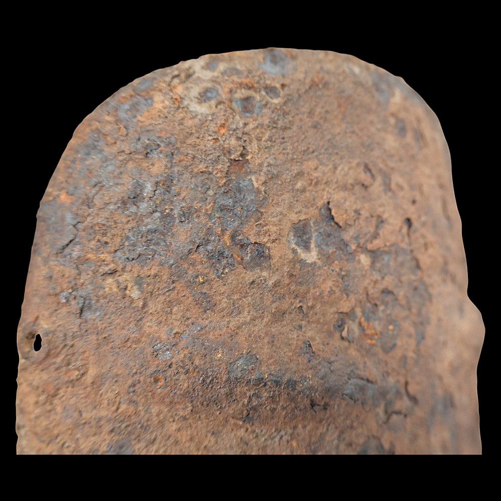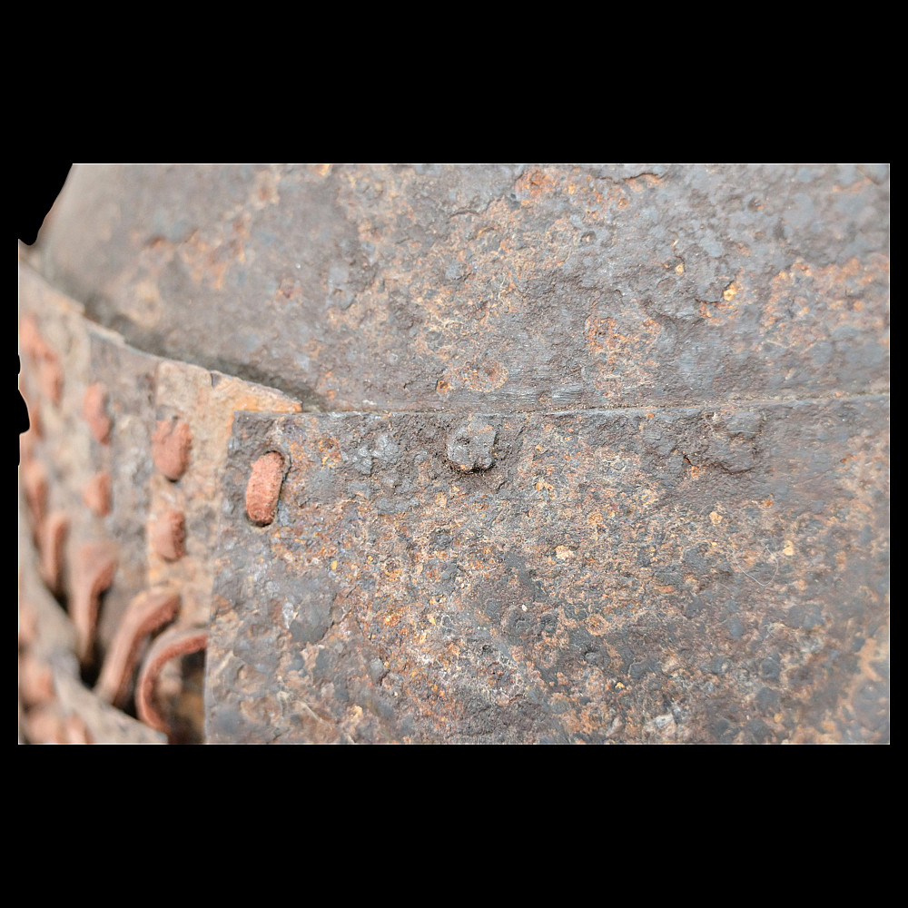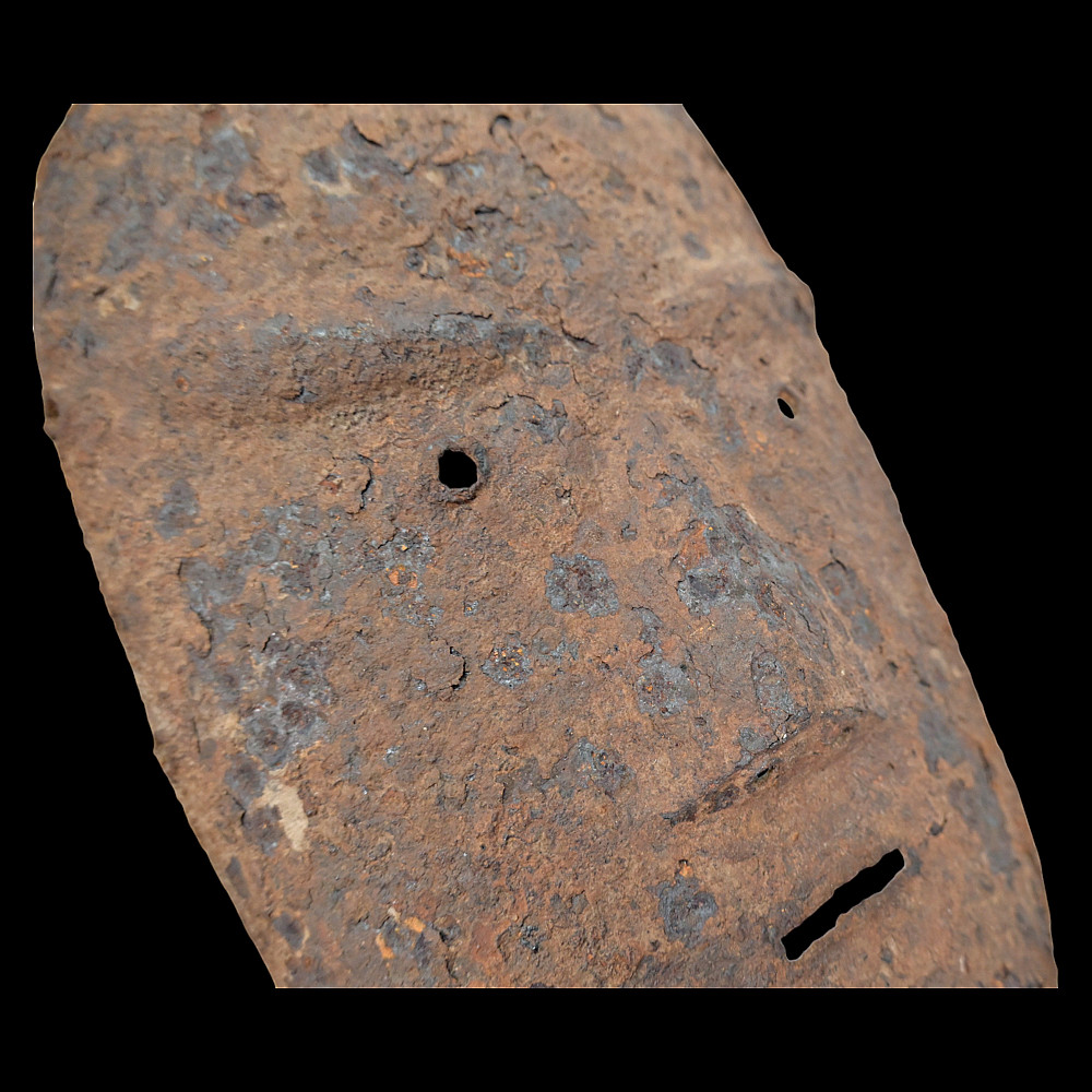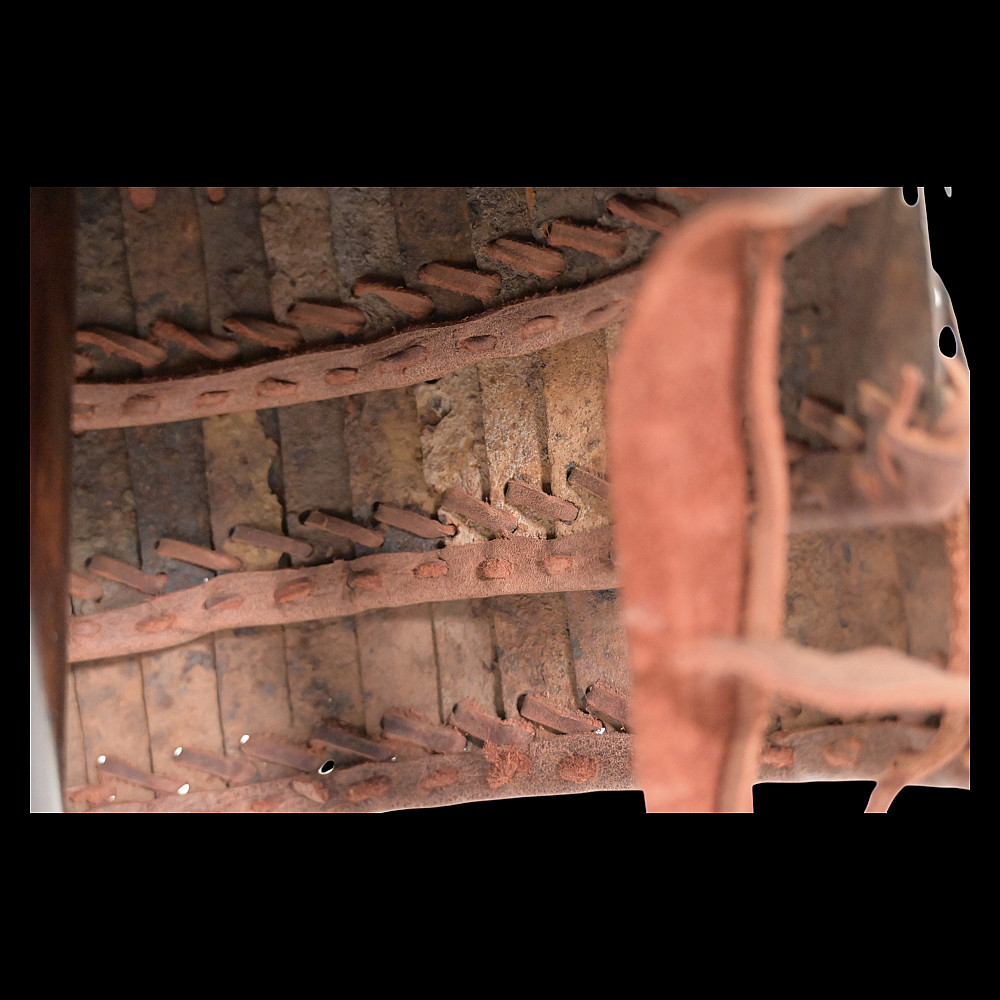 Extremely Rare Iron Helmet with Mask, Jurchen Jin Dynasty, Northern China, 12th–13th Century. An exceptional and exceedingly rare example of an early Jin dynasty (1115–1234) iron helmet with an integral face mask, attributed to the Jurchen tribes of Northern China. Constructed from forged iron plates, fastened together with rivets and lacings of reddish-brown leather (Leather laces, modern reconstruction), this helmet features overlapping lamellar plates forming the neck guard and sides. The front bears a sculpted, stylized iron mask with human facial features — deep eye sockets, a pronounced brow, and a narrow slit for the mouth — intended to inspire fear in the enemy while protecting the warrior’s face. Such helmets are exceptionally scarce; they represent the transitional stage between early steppe lamellar armor and later Mongol-influenced helmets of the Yuan period. A museum-worthy relic of early medieval East Asian warfare—powerful, haunting, and of remarkable rarity. Good condition for his age. Mask size: approximately 23 x 16 cm. Helmet height without mask: approximately 27 cm.