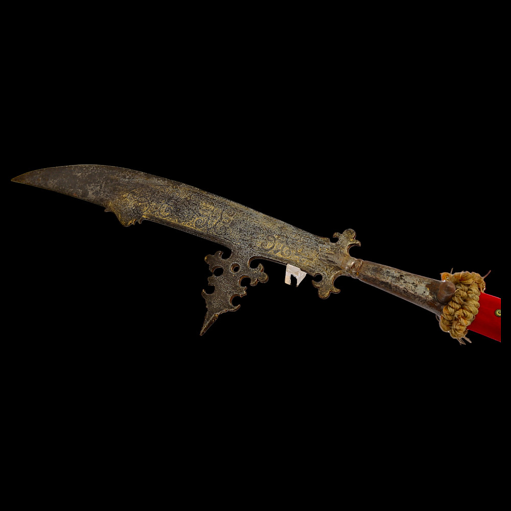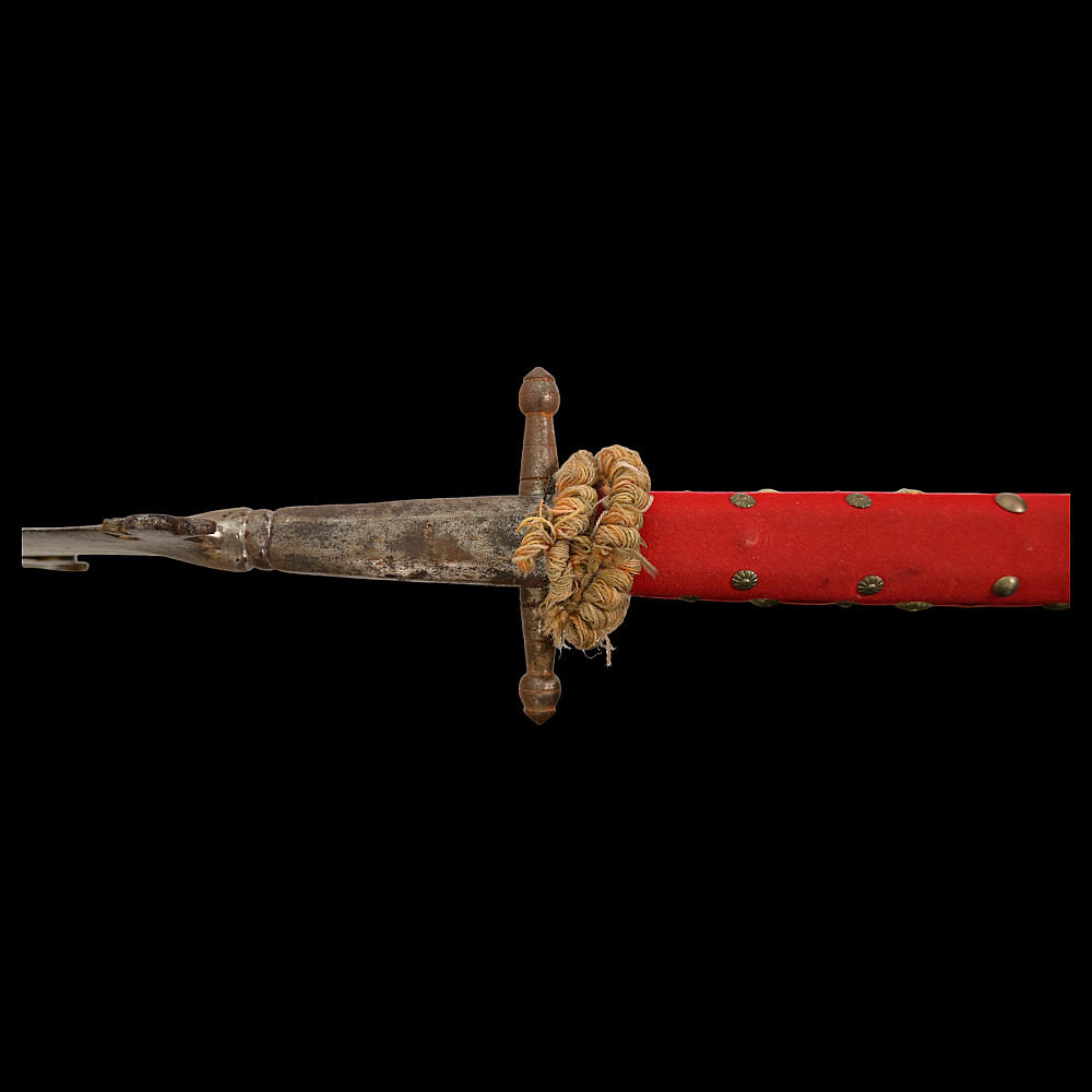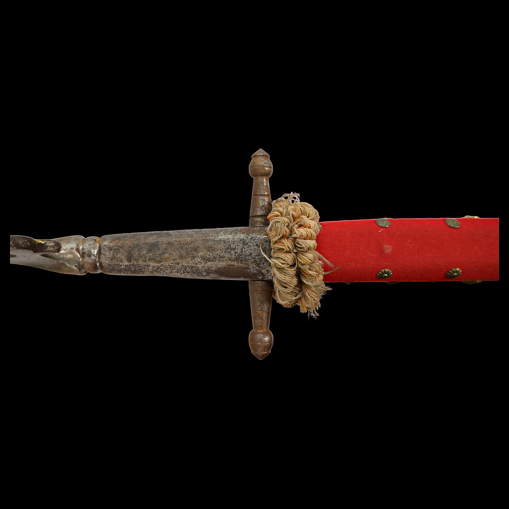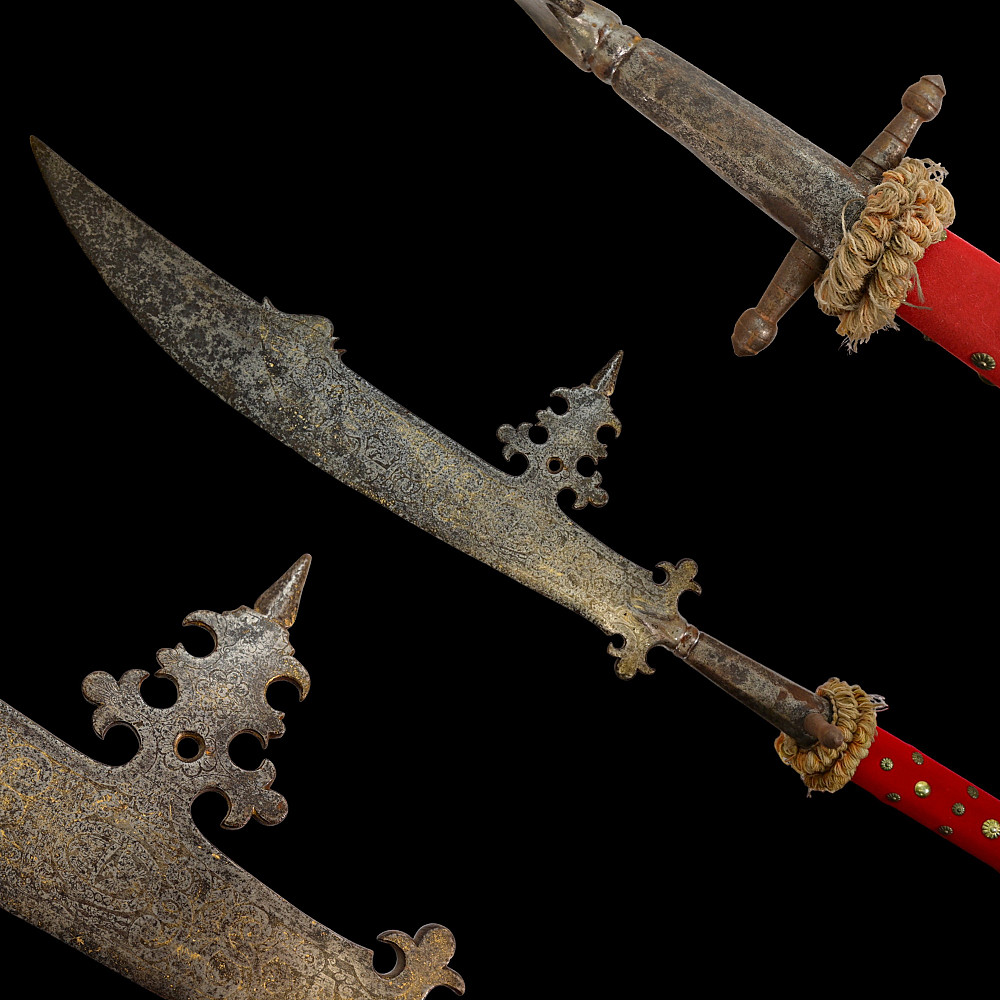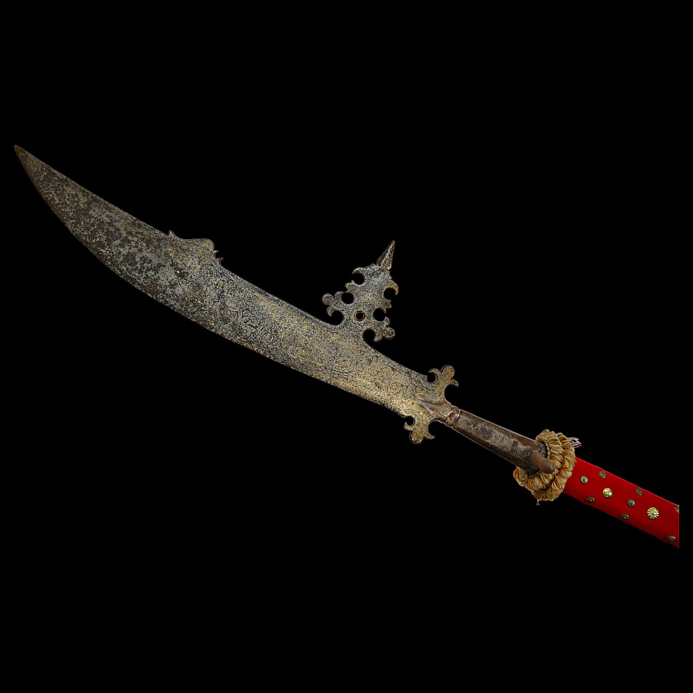 Slightly curved, iron head, with convex edge, a hump at the back, a rear cusp with lily-shaped base, two more cusps with lily-shaped base, socket of octagonal section with two rests in the shape of truncated cone buttoned at the edge. The surface of the head with remains of gilding, partly decorated with engravings depicting spirals framing floral pattern, two coat of arms on each side; a crown with feathers and the arms of Cardinal Camillo Borghese. Modern, wooden haft with red fabric covering fixed with small studs. Camillo Borghese (Pope Paul V) was born in 1552, in 1596 he was made Cardinal by Pope Clement VIII for whom he worked as a diplomat in Spain. In 1605, became Pope and in 1620 died. Overall length - 253 cm. Blade length - 48,5 cm.