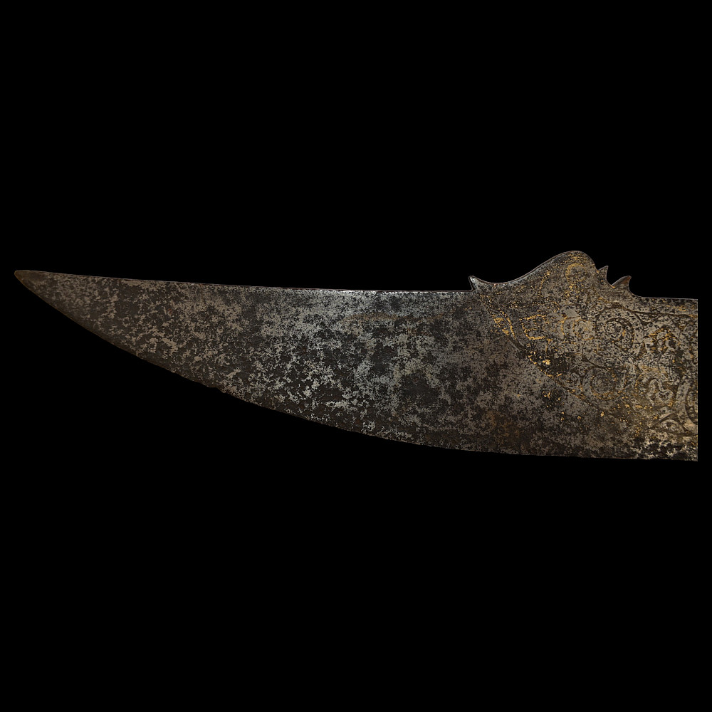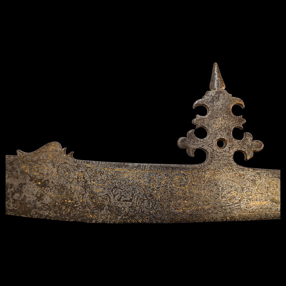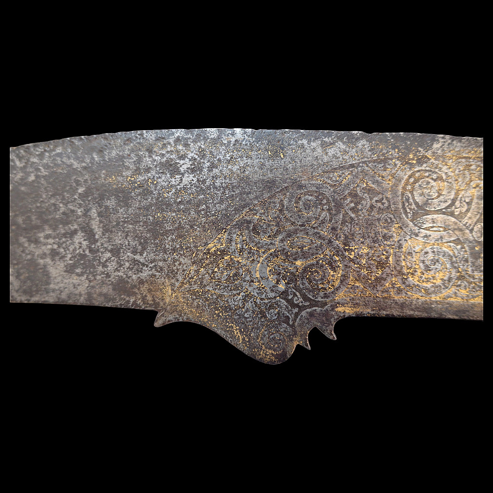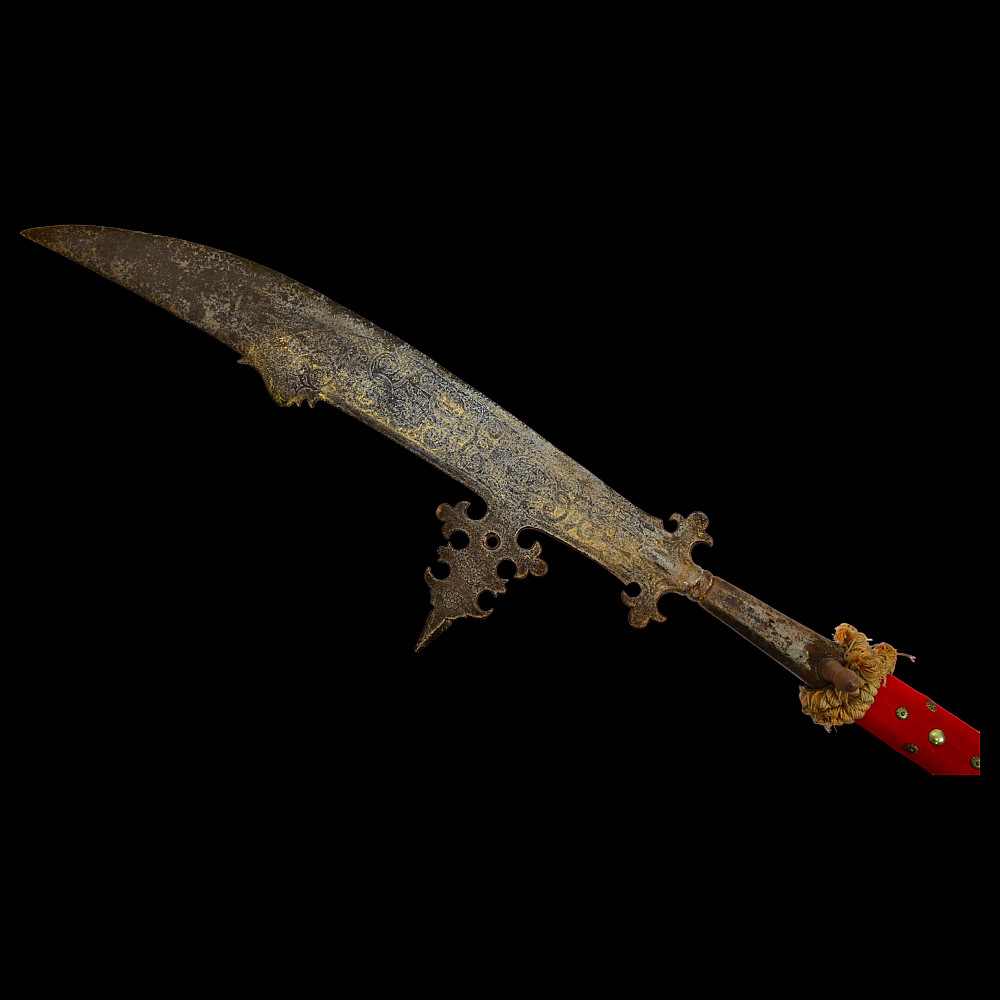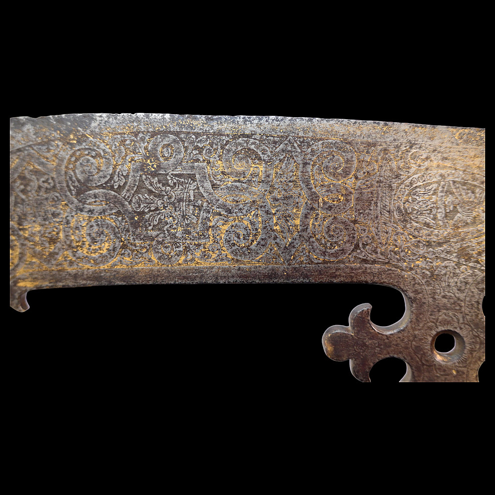 Slightly curved, iron head, with convex edge, a hump at the back, a rear cusp with lily-shaped base, two more cusps with lily-shaped base, socket of octagonal section with two rests in the shape of truncated cone buttoned at the edge. The surface of the head with remains of gilding, partly decorated with engravings depicting spirals framing floral pattern, two coat of arms on each side; a crown with feathers and the arms of Cardinal Camillo Borghese. Modern, wooden haft with red fabric covering fixed with small studs. Camillo Borghese (Pope Paul V) was born in 1552, in 1596 he was made Cardinal by Pope Clement VIII for whom he worked as a diplomat in Spain. In 1605, became Pope and in 1620 died. Overall length - 253 cm. Blade length - 48,5 cm.