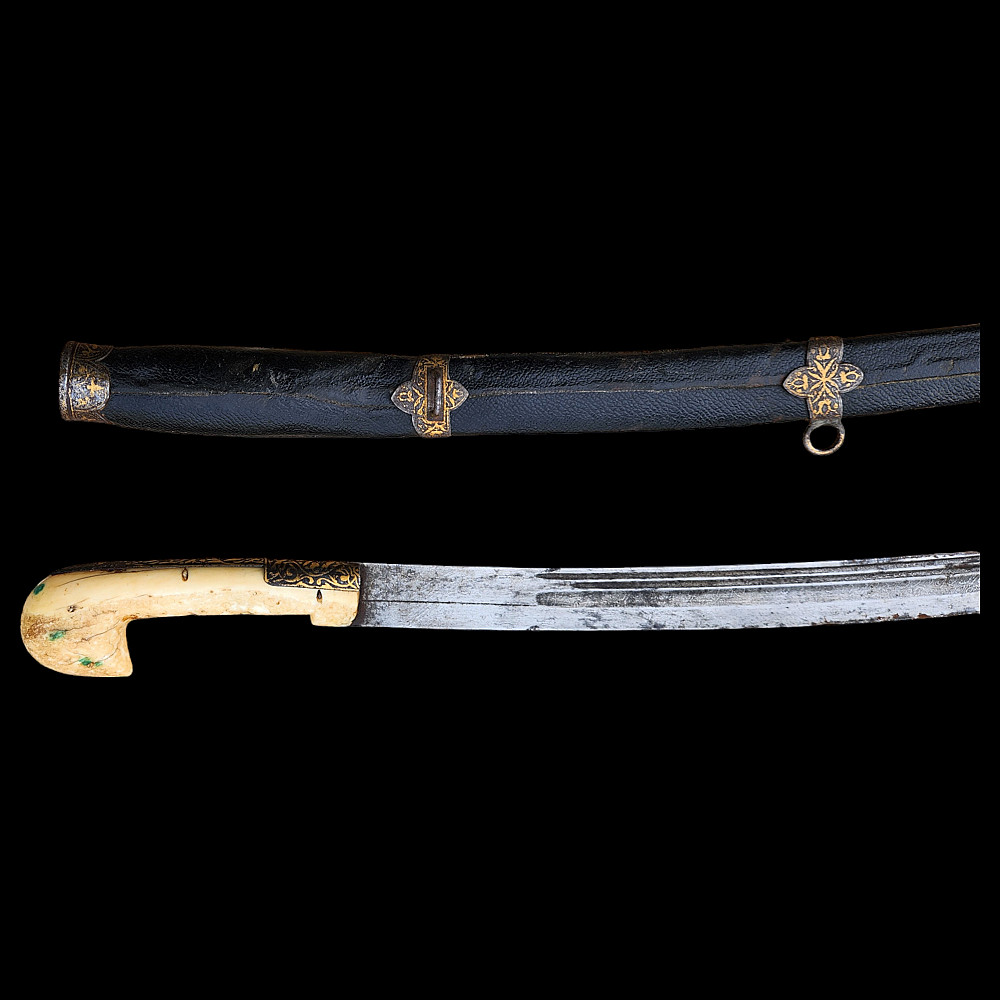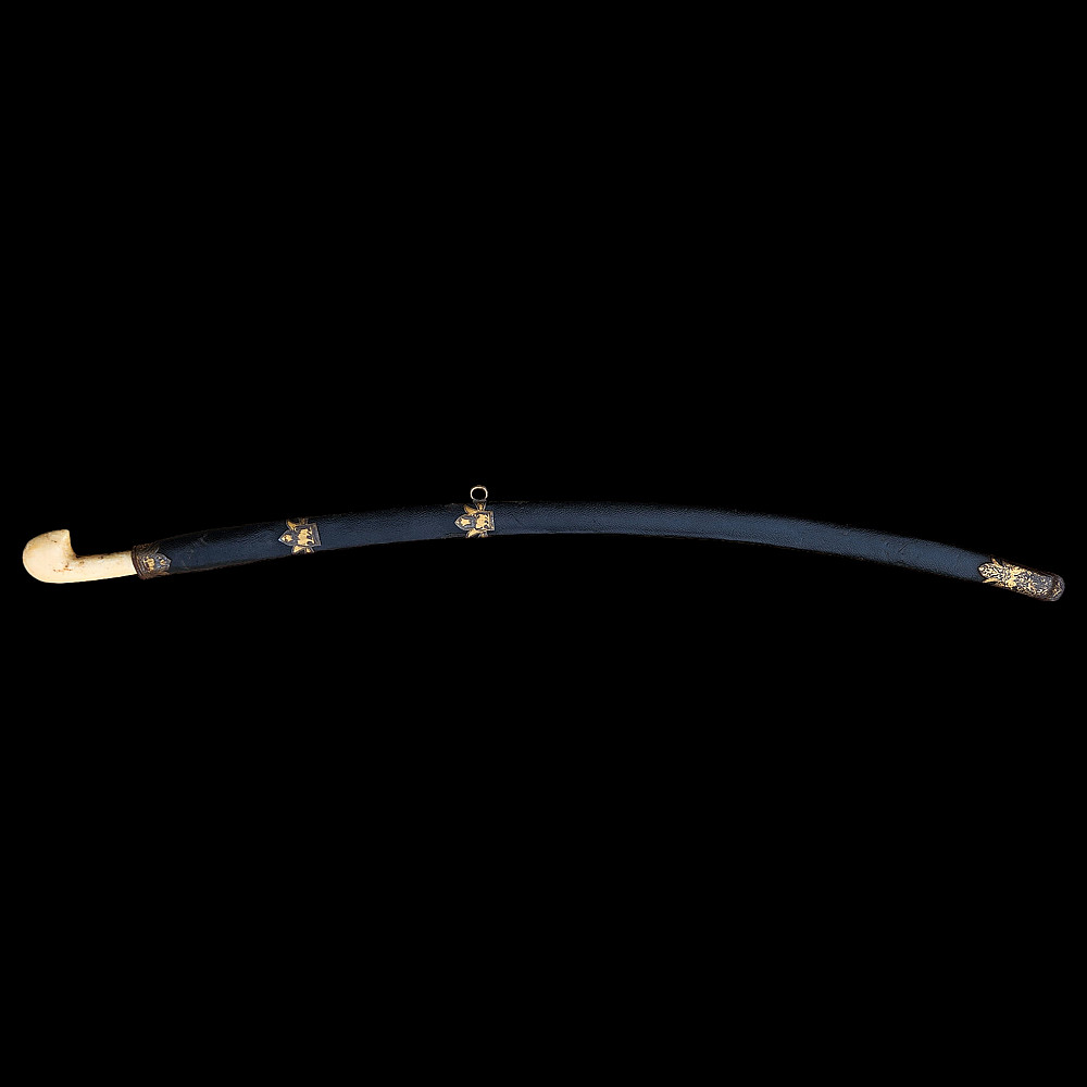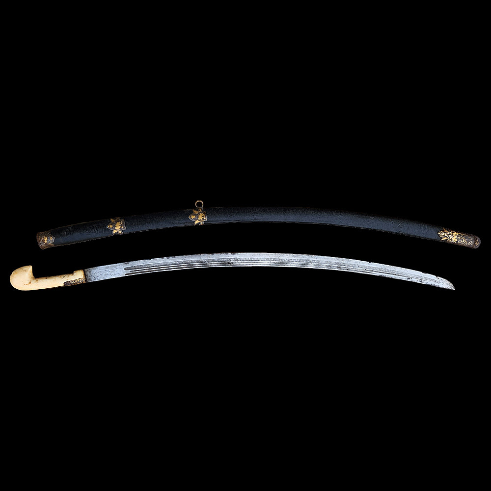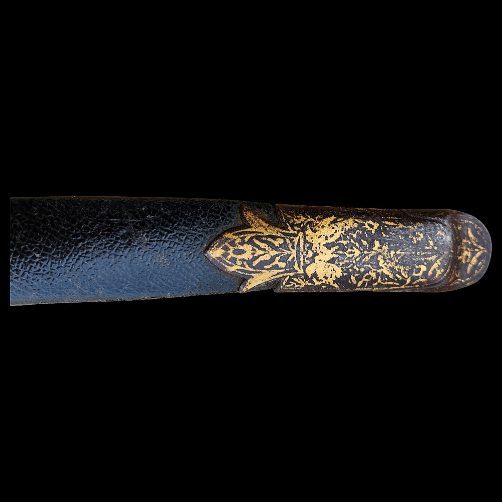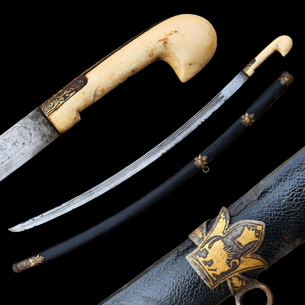 Extremely Rare Persian shashka with gold inlay, Qajar period, late 19th century. Steel blade with three fullers on each side, decorated with etching in the form of imitation patterns of Damascus steel. On one side at the base of the blade there is an inscription in Arabic "يا قوام العالمين" (O Sustainer of the worlds). The bone handle has iron fittings, decorated with gold kofgari, that cover the back of the handle. The wooden scabbard is covered with black leather, with iron fittings made in the form of the coat of arms of the Qajar dynasty, the fittings are in the shape of the Shah's crown with an image of a lion and a crown made of gold kofgari. A magnificent item, possibly belonging to a member of the Qajar dynasty during the reign of Mozafereddin Shah Qajar.