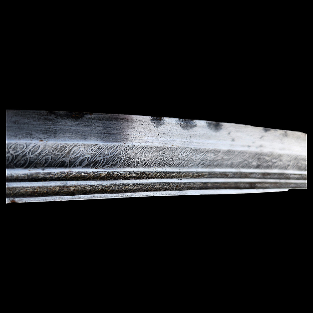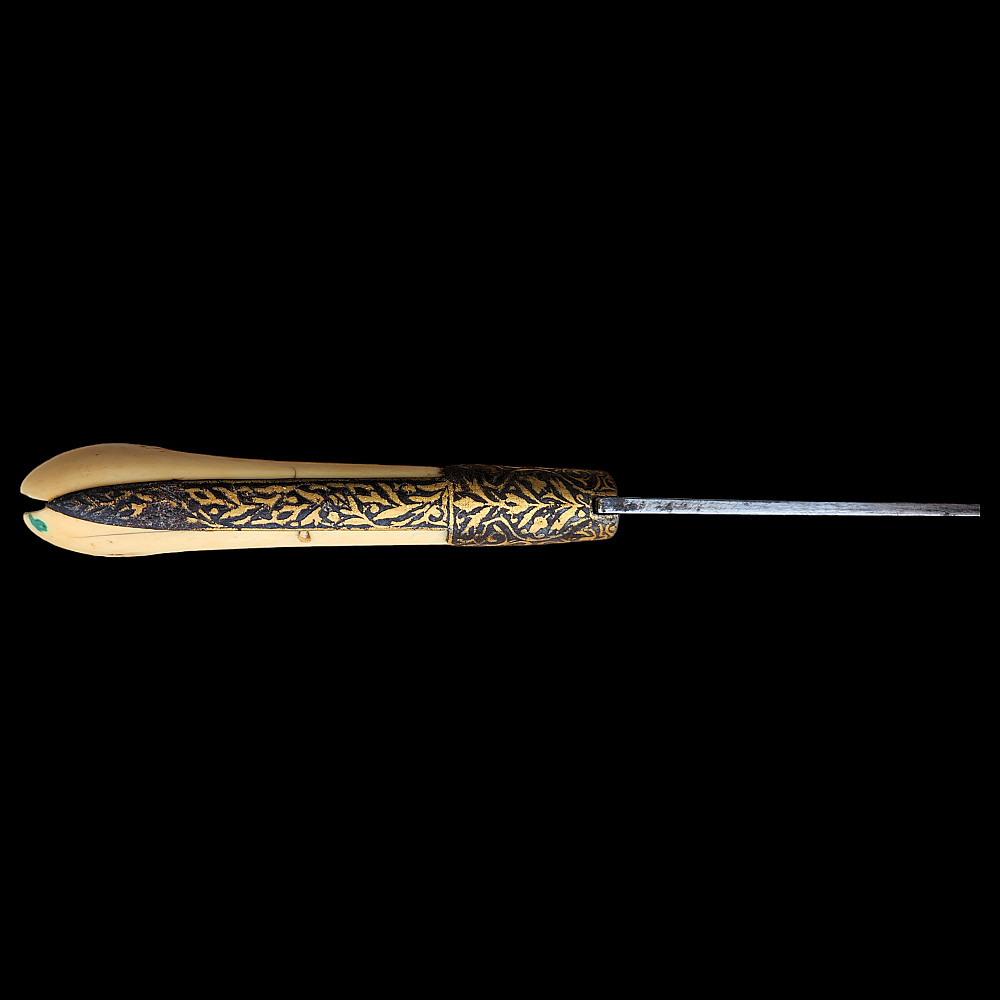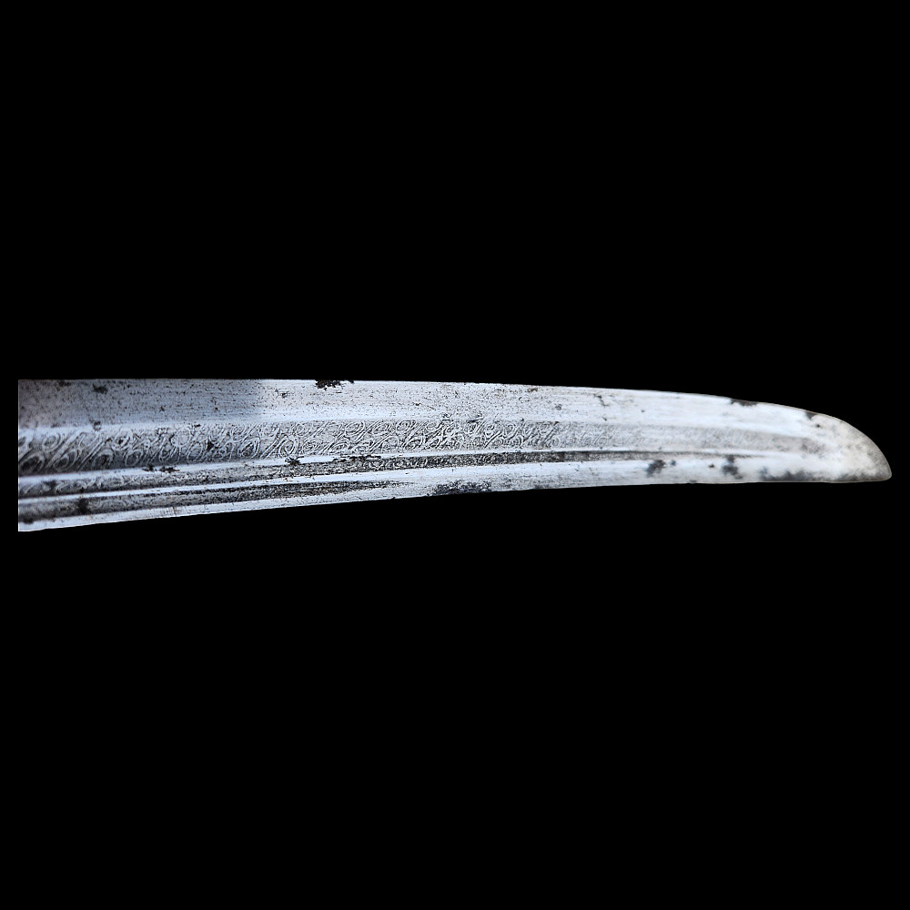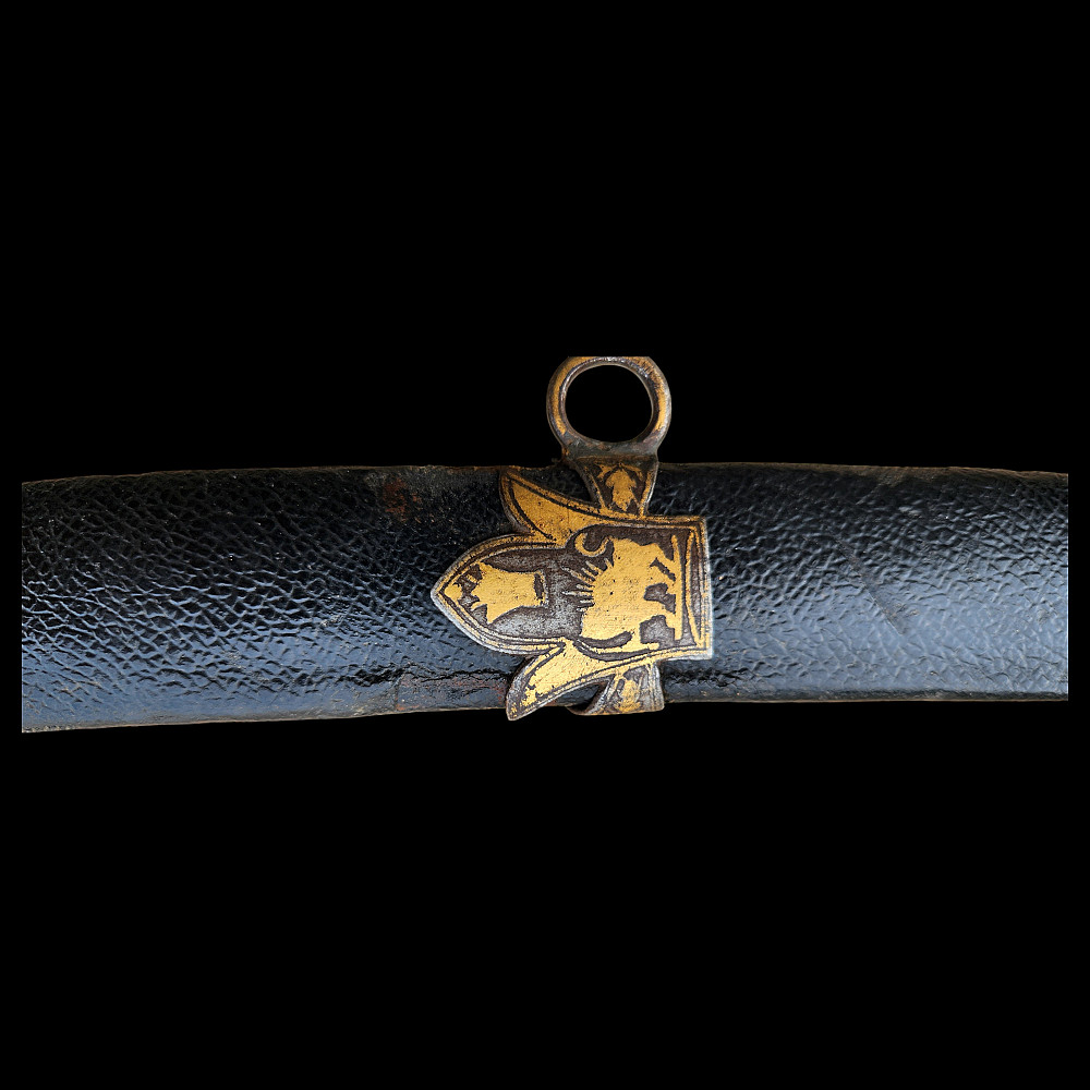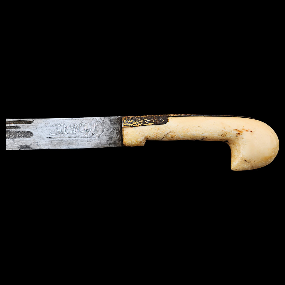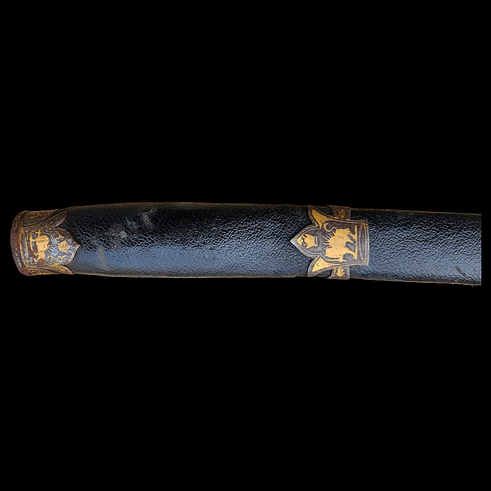 Extremely Rare Persian shashka with gold inlay, Qajar period, late 19th century. Steel blade with three fullers on each side, decorated with etching in the form of imitation patterns of Damascus steel. On one side at the base of the blade there is an inscription in Arabic "يا قوام العالمين" (O Sustainer of the worlds). The bone handle has iron fittings, decorated with gold kofgari, that cover the back of the handle. The wooden scabbard is covered with black leather, with iron fittings made in the form of the coat of arms of the Qajar dynasty, the fittings are in the shape of the Shah's crown with an image of a lion and a crown made of gold kofgari. A magnificent item, possibly belonging to a member of the Qajar dynasty during the reign of Mozafereddin Shah Qajar.