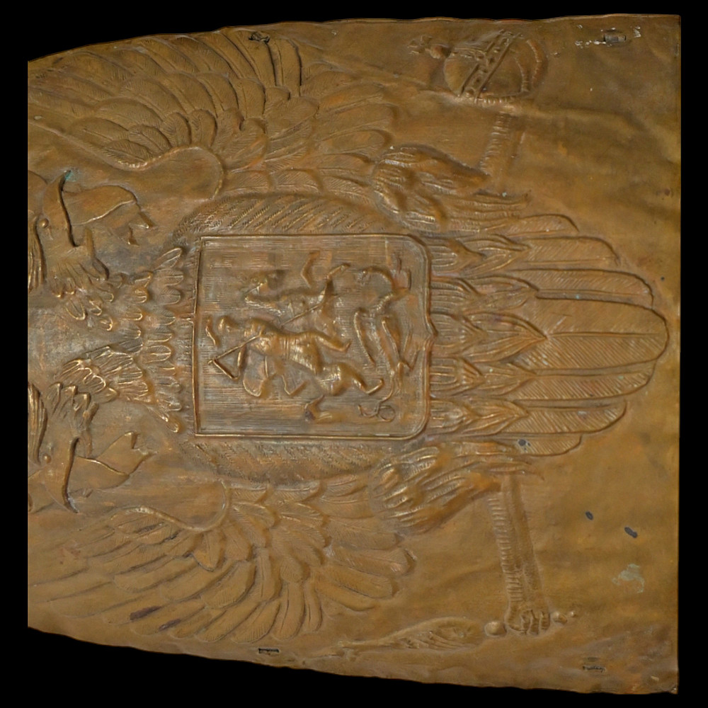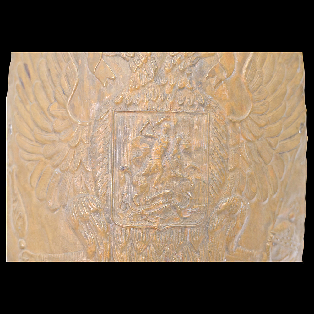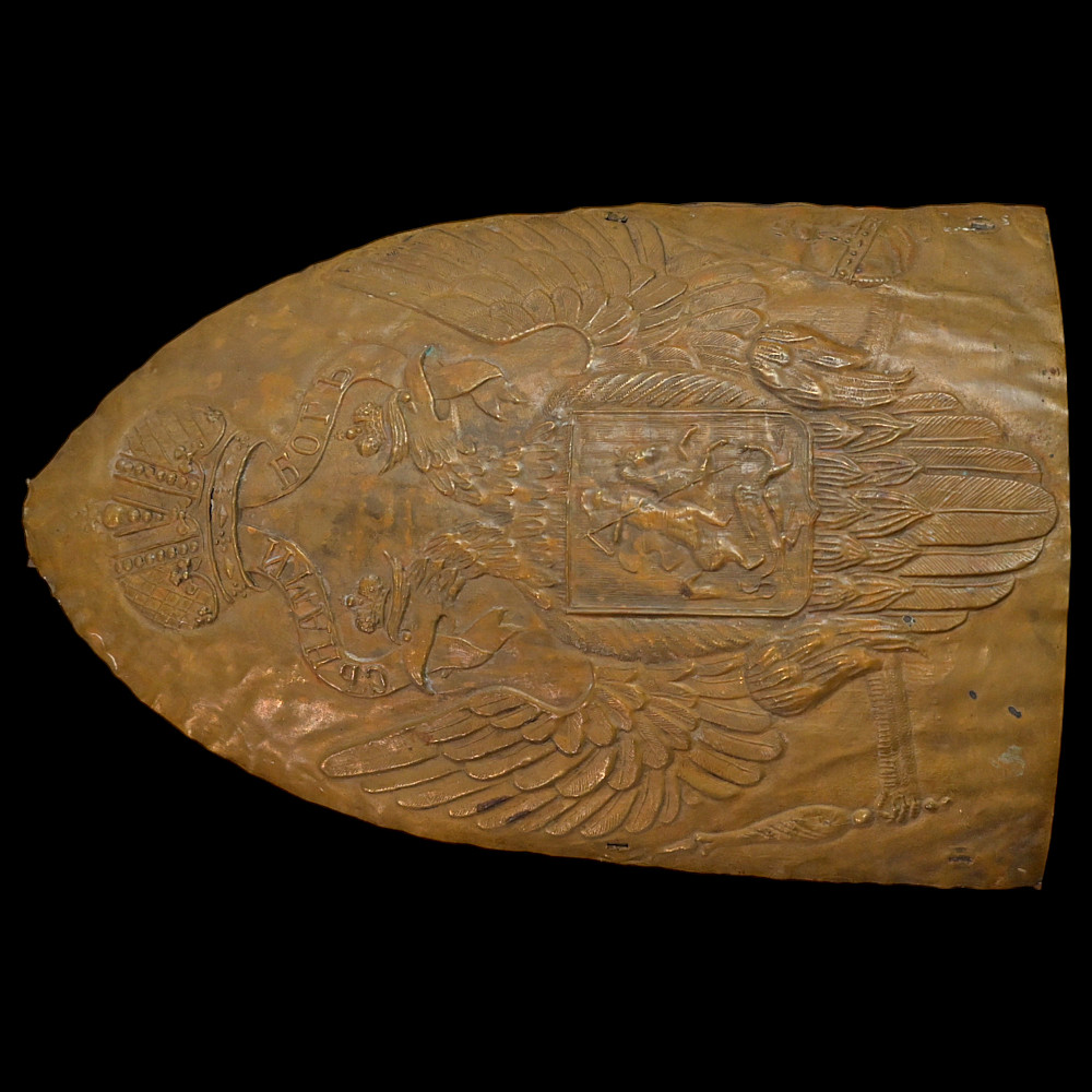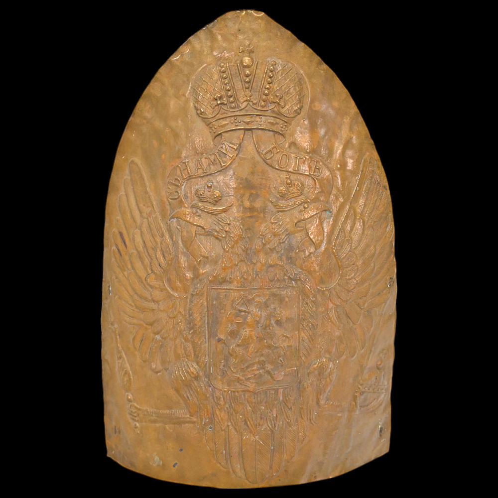 Forehead piece of the Grenadier cap of the lower ranks of the Life Guards Pavlovsky Regiment, model 1802, Russian Empire, first quarter of the 19th century. In good condition, traces of use, two holes in the lower part for attaching the forehead piece to the cap. The Grenadier cap for the lower ranks of the Life Guards Pavlovsky Regiment resembled a Catholic mitre in appearance and was made of cloth with a frame and a metal forehead piece. Good condition. Height cm.