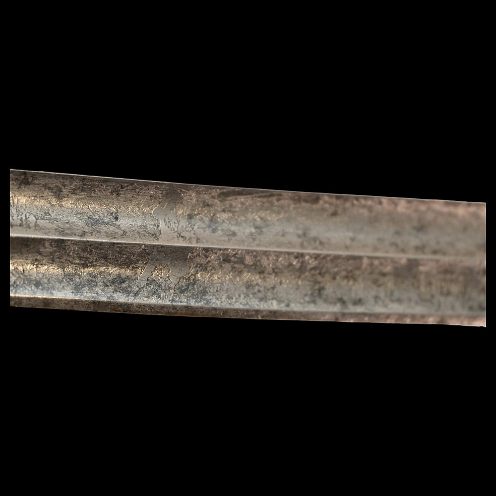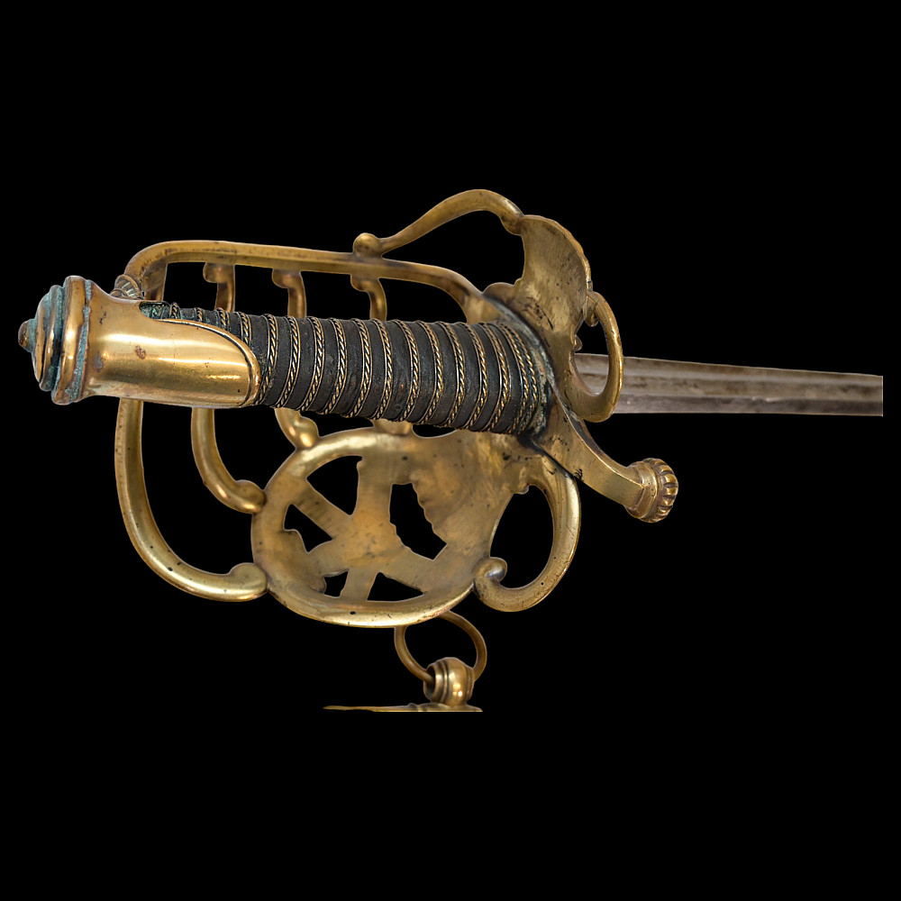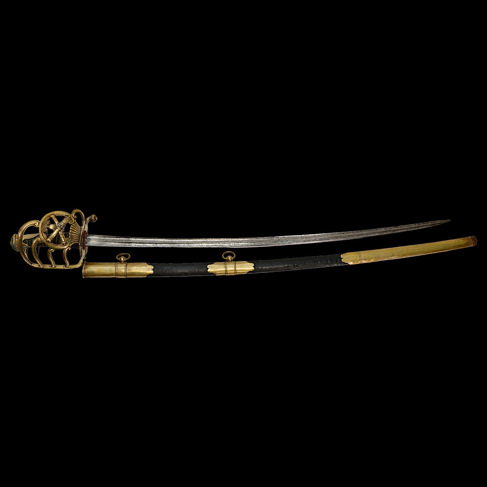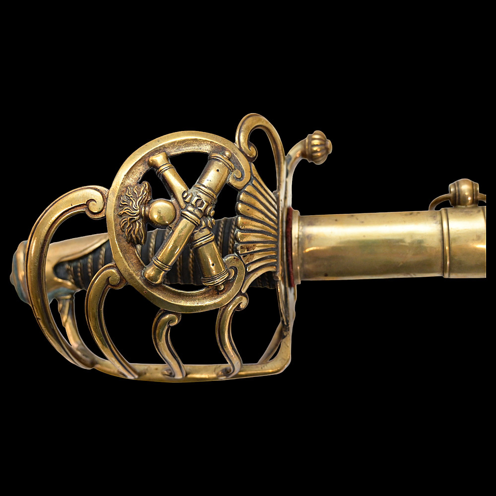 French Artillery Officer's Sword, First Empire, Early 19th century. A beautiful steel blade with a slight bend, two fullers on each side. The blade is etched on both sides to imitate the pattern of Damascus steel. Brass hilt with artillery symbols, wooden handle covered with leather and entwined with wire. Original leather sheath with brass fittings. A beautiful Napoleonic saber for collecting. Length 109 cm.