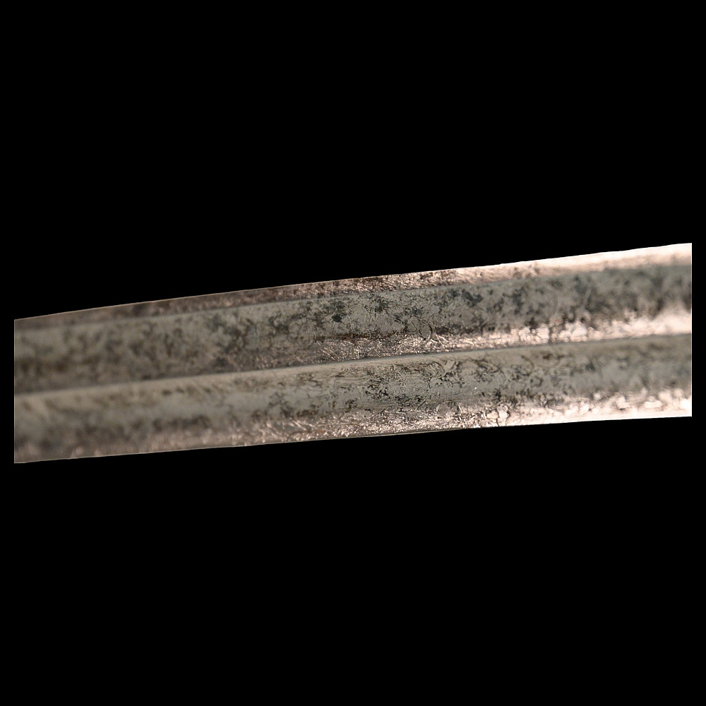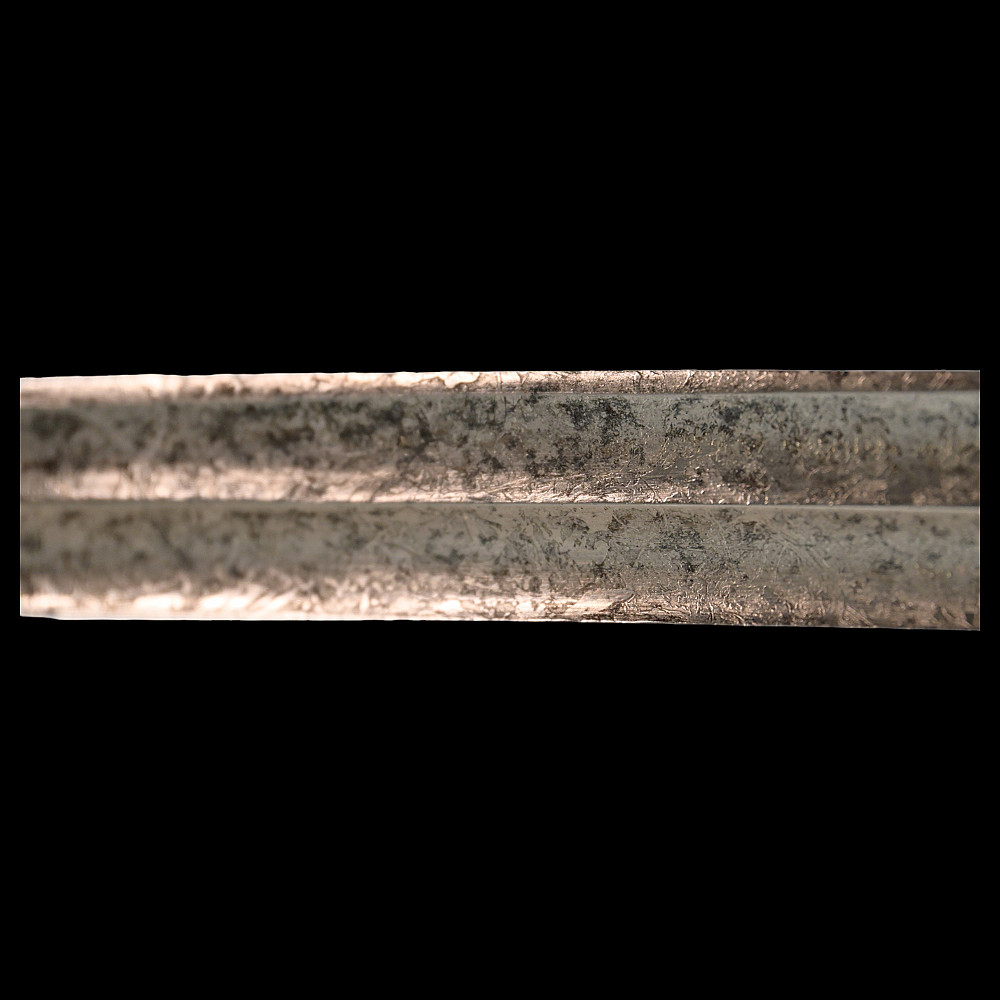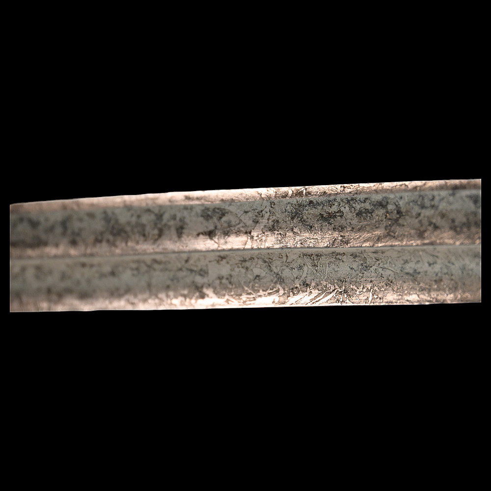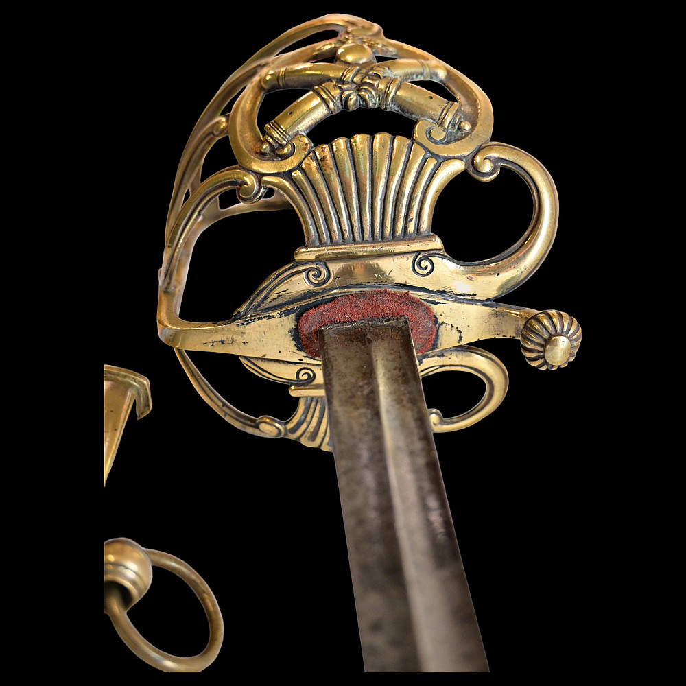 French Artillery Officer's Sword, First Empire, Early 19th century. A beautiful steel blade with a slight bend, two fullers on each side. The blade is etched on both sides to imitate the pattern of Damascus steel. Brass hilt with artillery symbols, wooden handle covered with leather and entwined with wire. Original leather sheath with brass fittings. A beautiful Napoleonic saber for collecting. Length 109 cm.