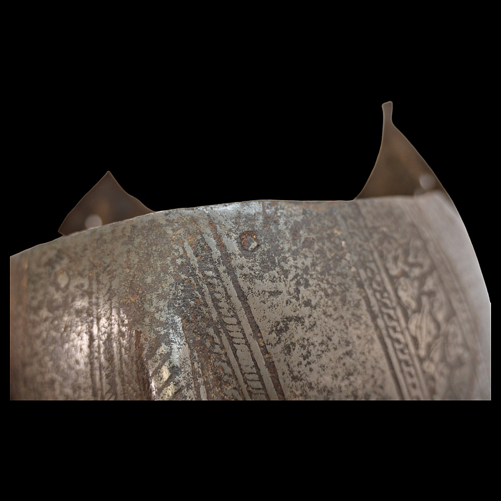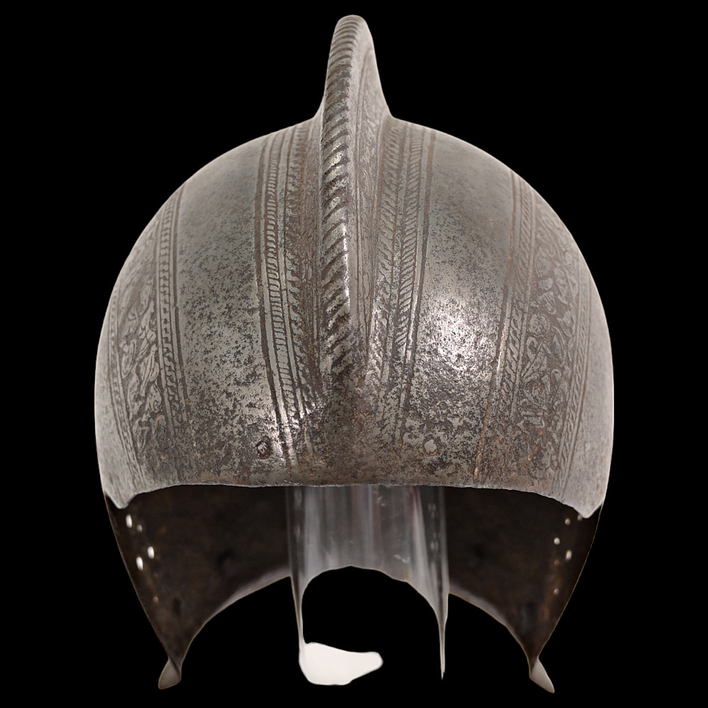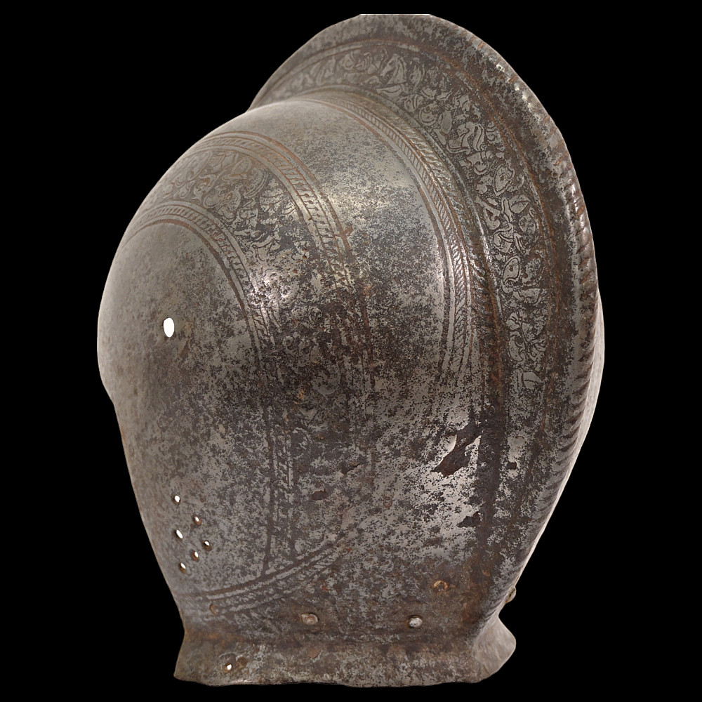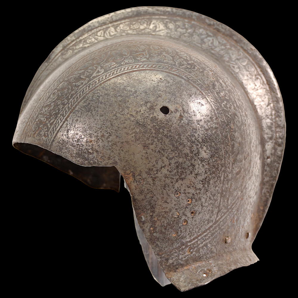 French Bourguignot helmet from the 16th century. Decorated with floral patterns with remains of gilding. Perhaps there was a visor that was lost. Rare collectible. Height - 27cm