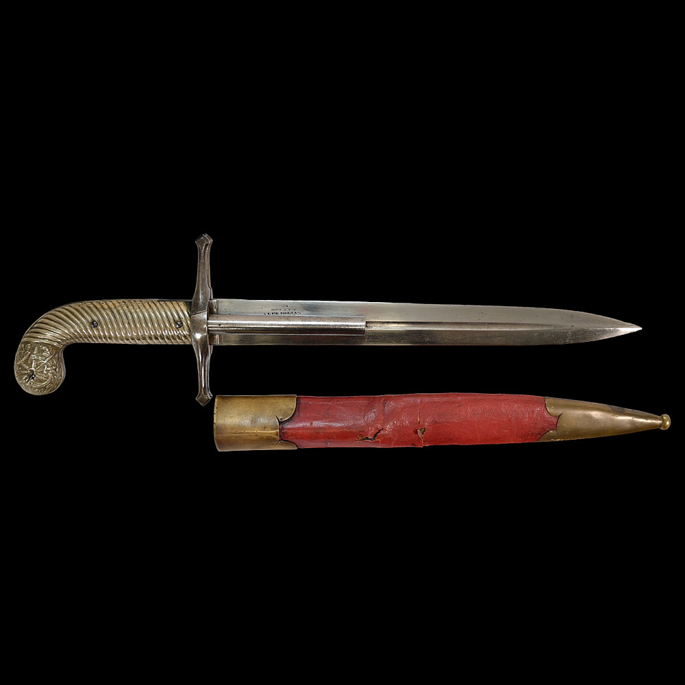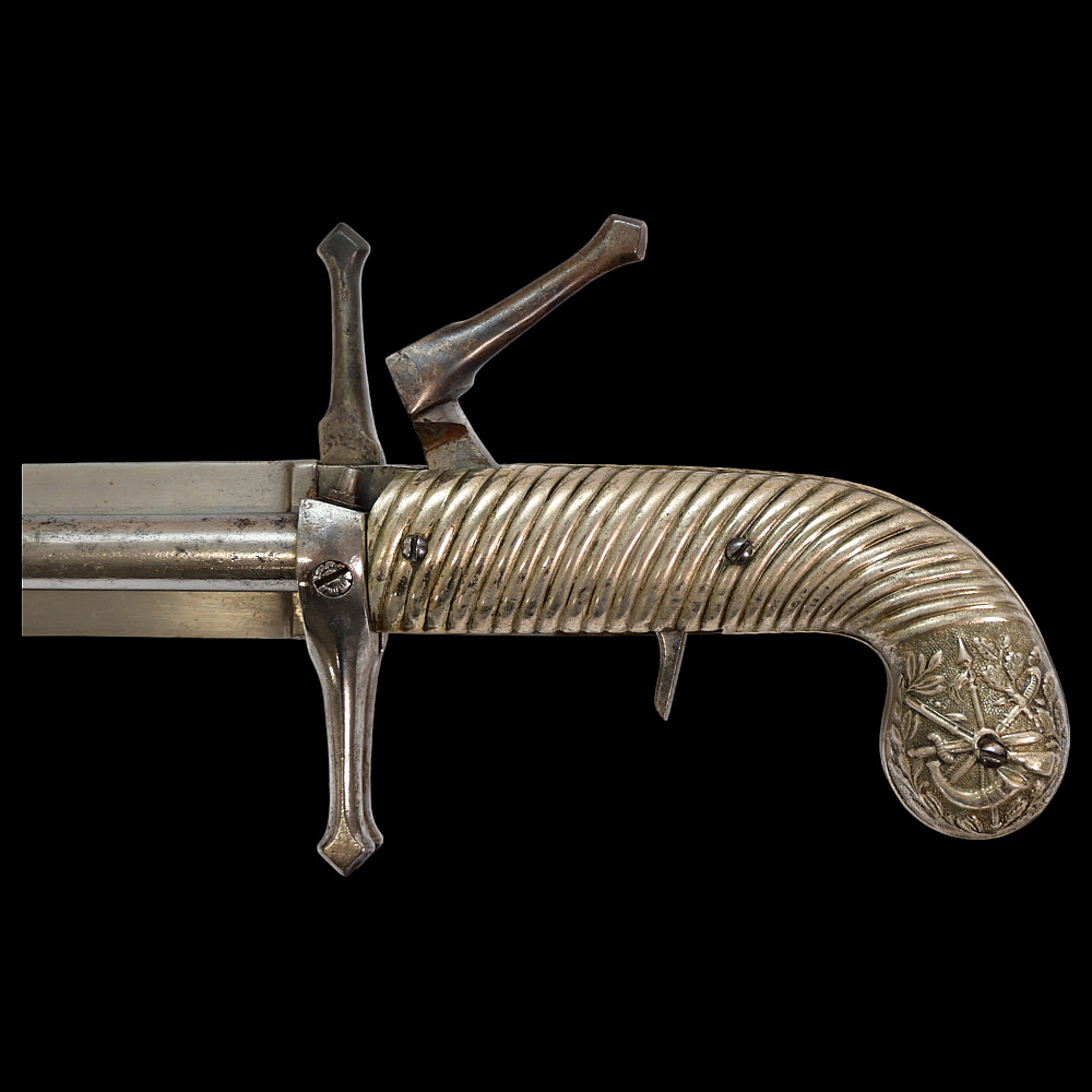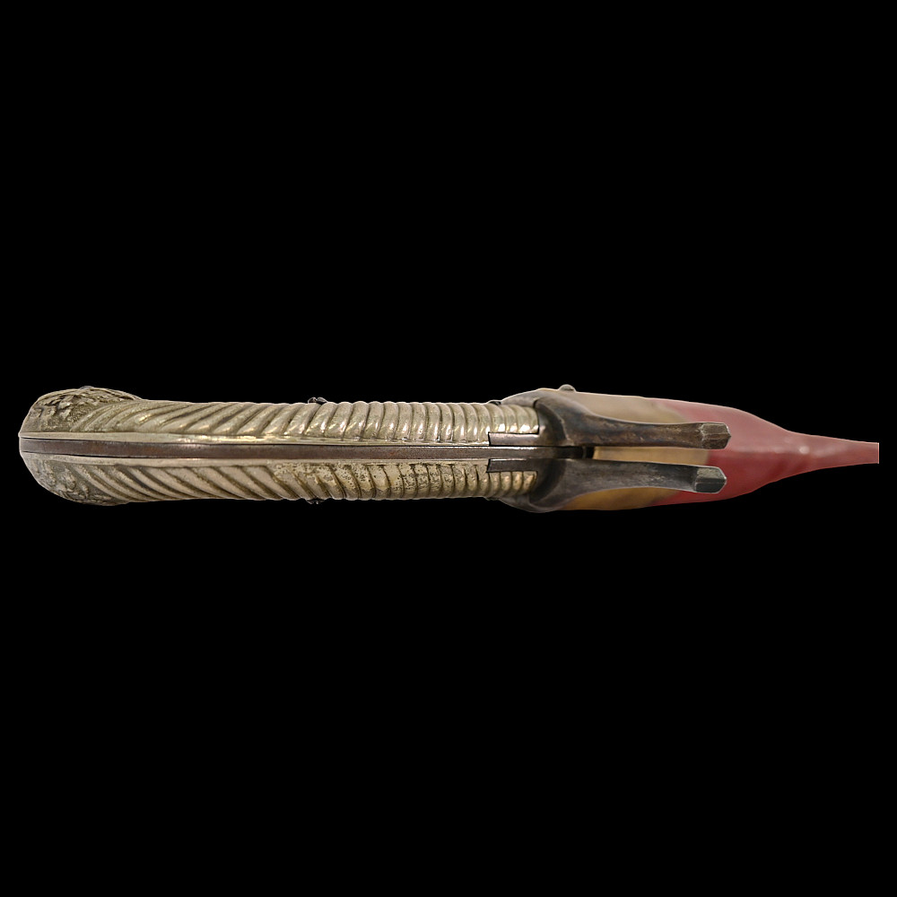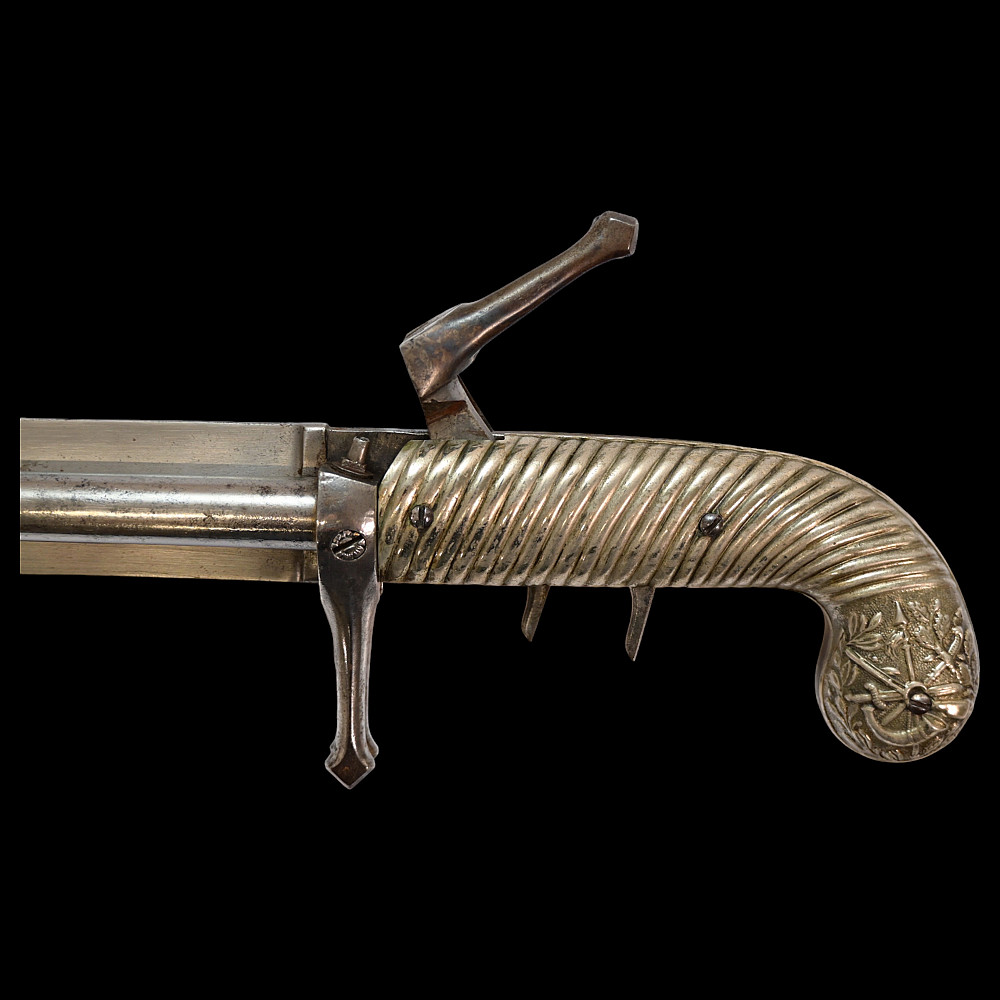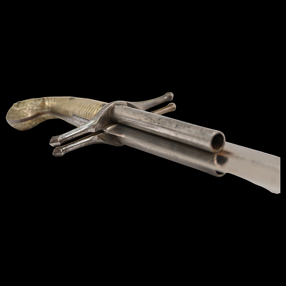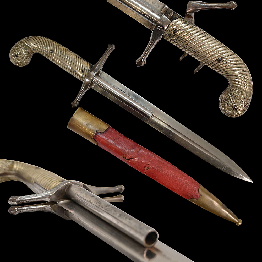 French D.B Dumonthier Dagger, Percussion Double Barrel Pistol, circa 1855-60. Two slightly tapering barrels, fitted with a tapering blade cut on each side with a long fuller. Fitted with hammers forming the left-hand side of the cross-guard, folding concealed trigger, fitted with a pair of writhen silver grip-scales, in its original leather-covered wooden scabbard with brass mounts. Length 49 cm.