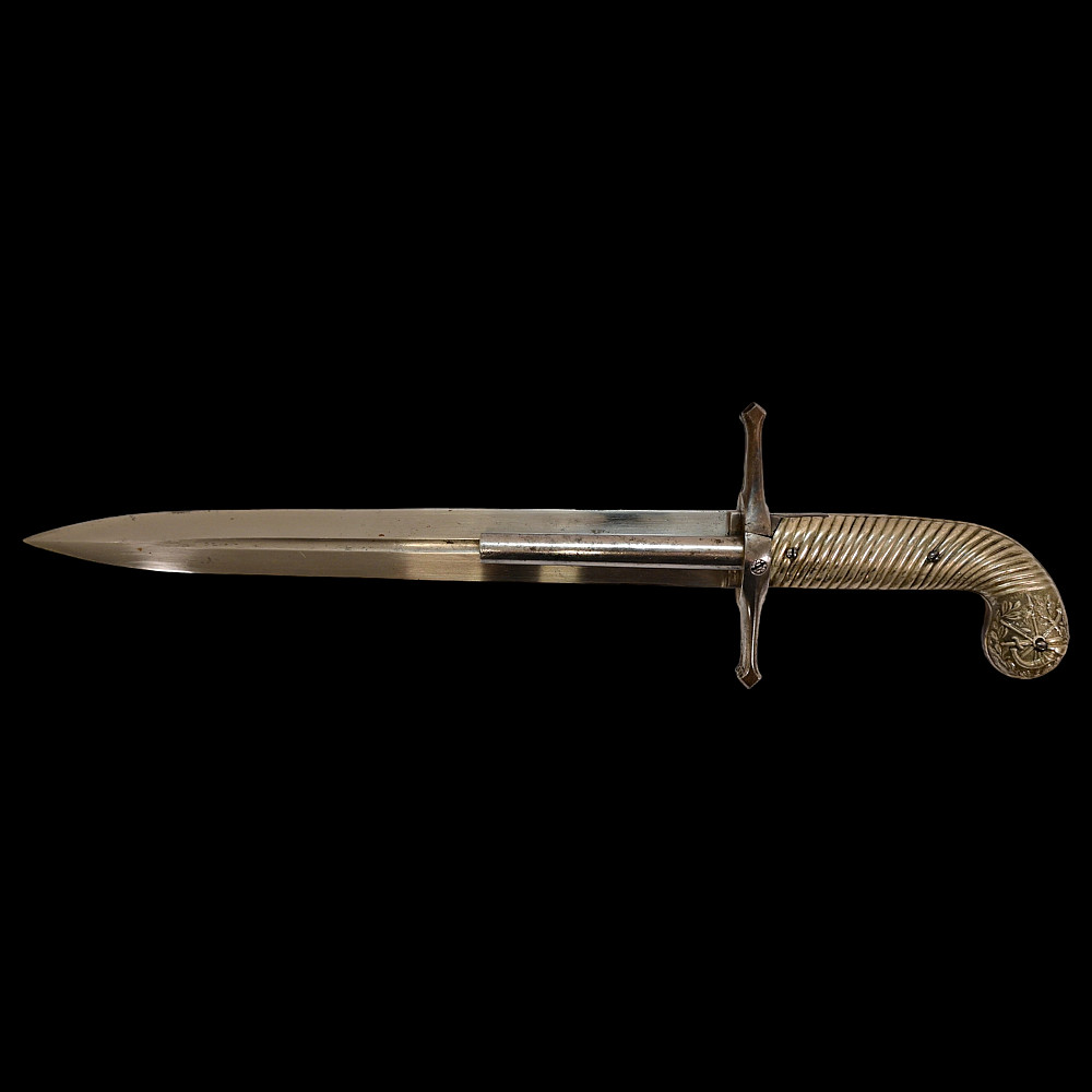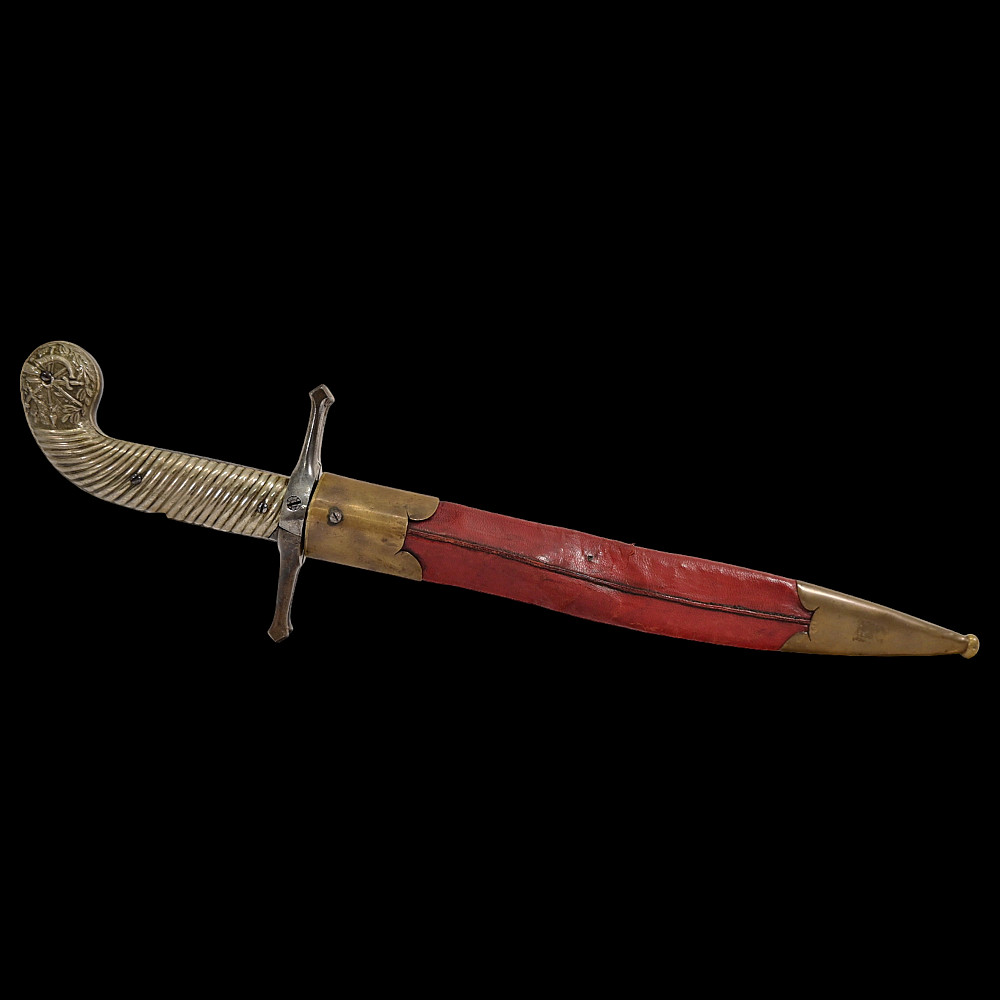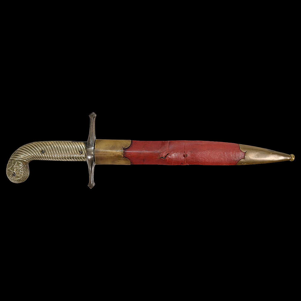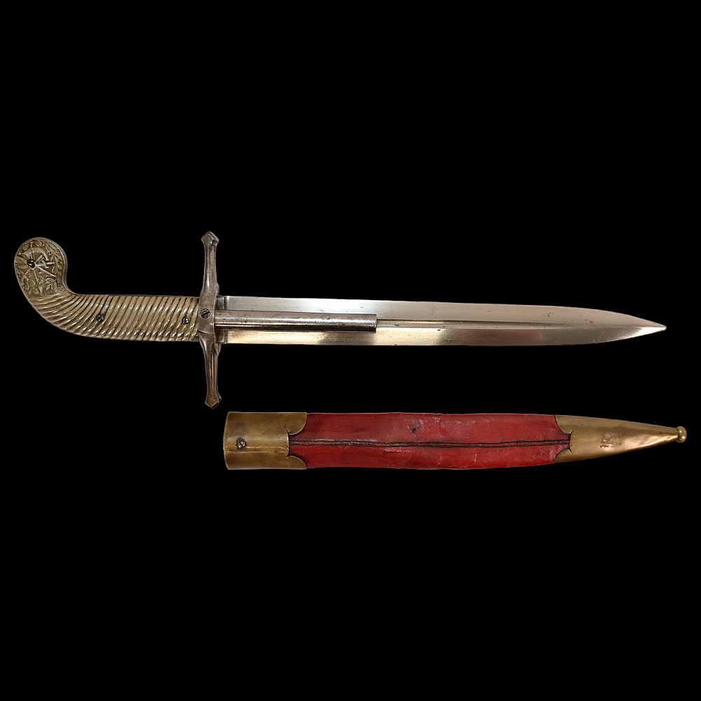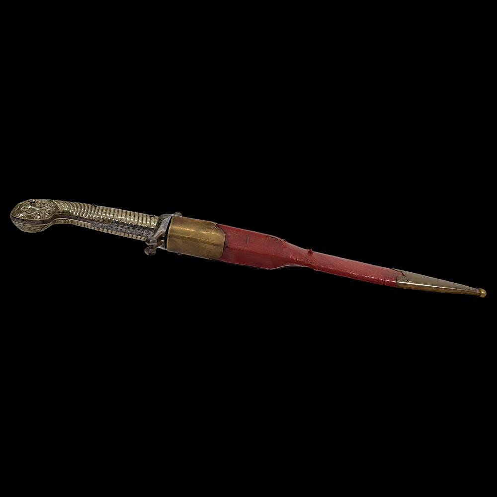 French D.B Dumonthier Dagger, Percussion Double Barrel Pistol, circa 1855-60. Two slightly tapering barrels, fitted with a tapering blade cut on each side with a long fuller. Fitted with hammers forming the left-hand side of the cross-guard, folding concealed trigger, fitted with a pair of writhen silver grip-scales, in its original leather-covered wooden scabbard with brass mounts. Length 49 cm.
