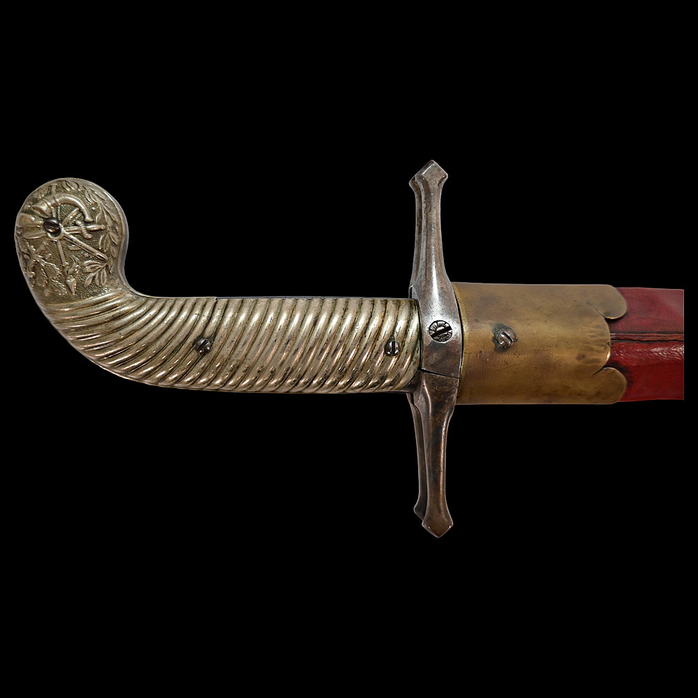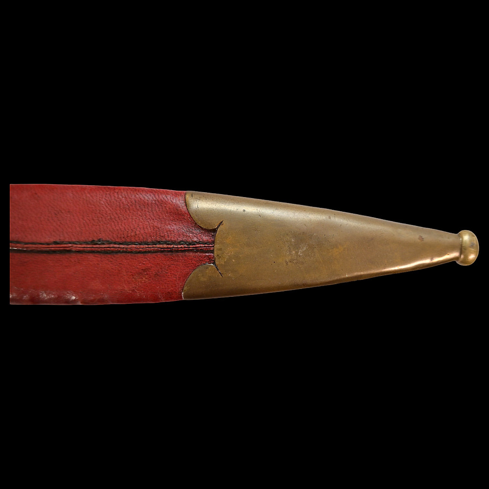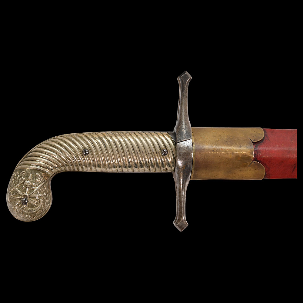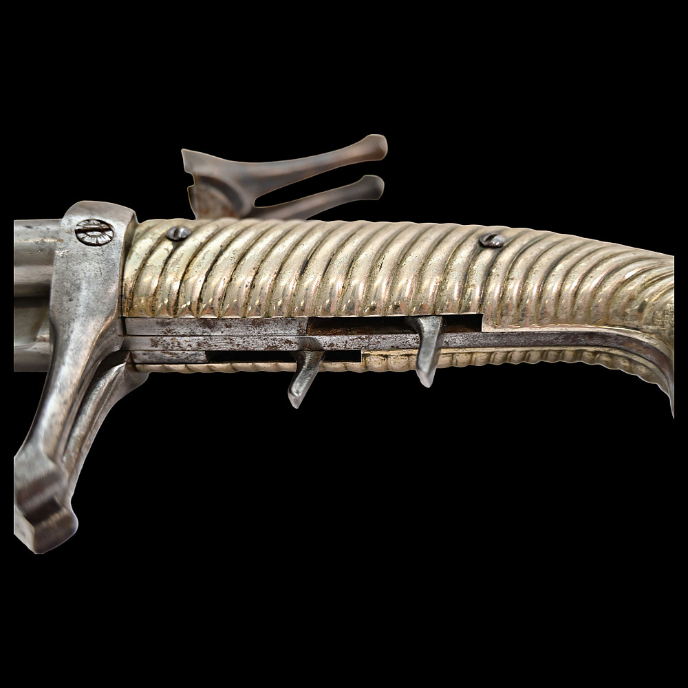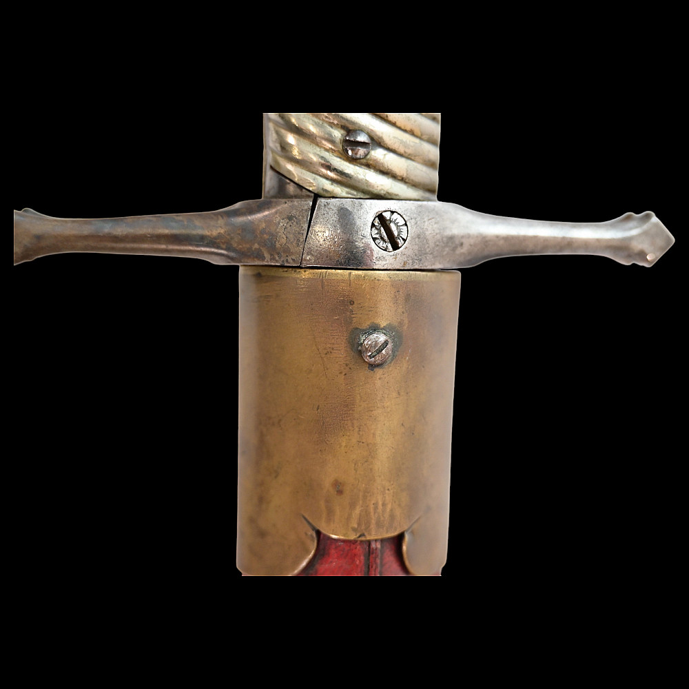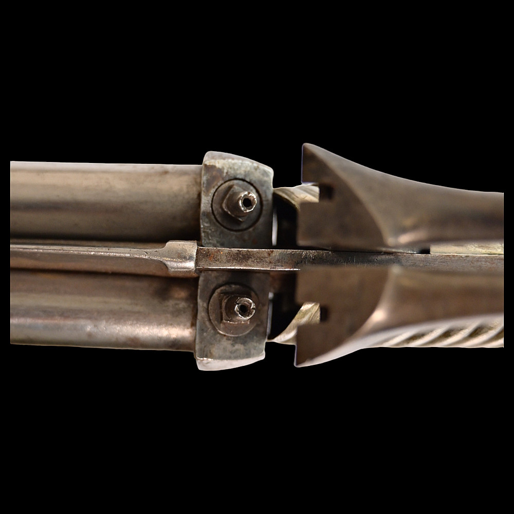 French D.B Dumonthier Dagger, Percussion Double Barrel Pistol, circa 1855-60. Two slightly tapering barrels, fitted with a tapering blade cut on each side with a long fuller. Fitted with hammers forming the left-hand side of the cross-guard, folding concealed trigger, fitted with a pair of writhen silver grip-scales, in its original leather-covered wooden scabbard with brass mounts. Length 49 cm.