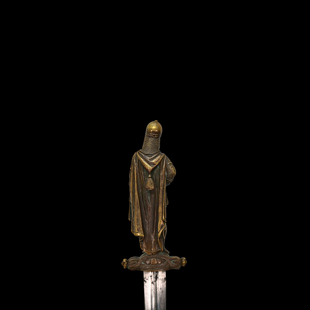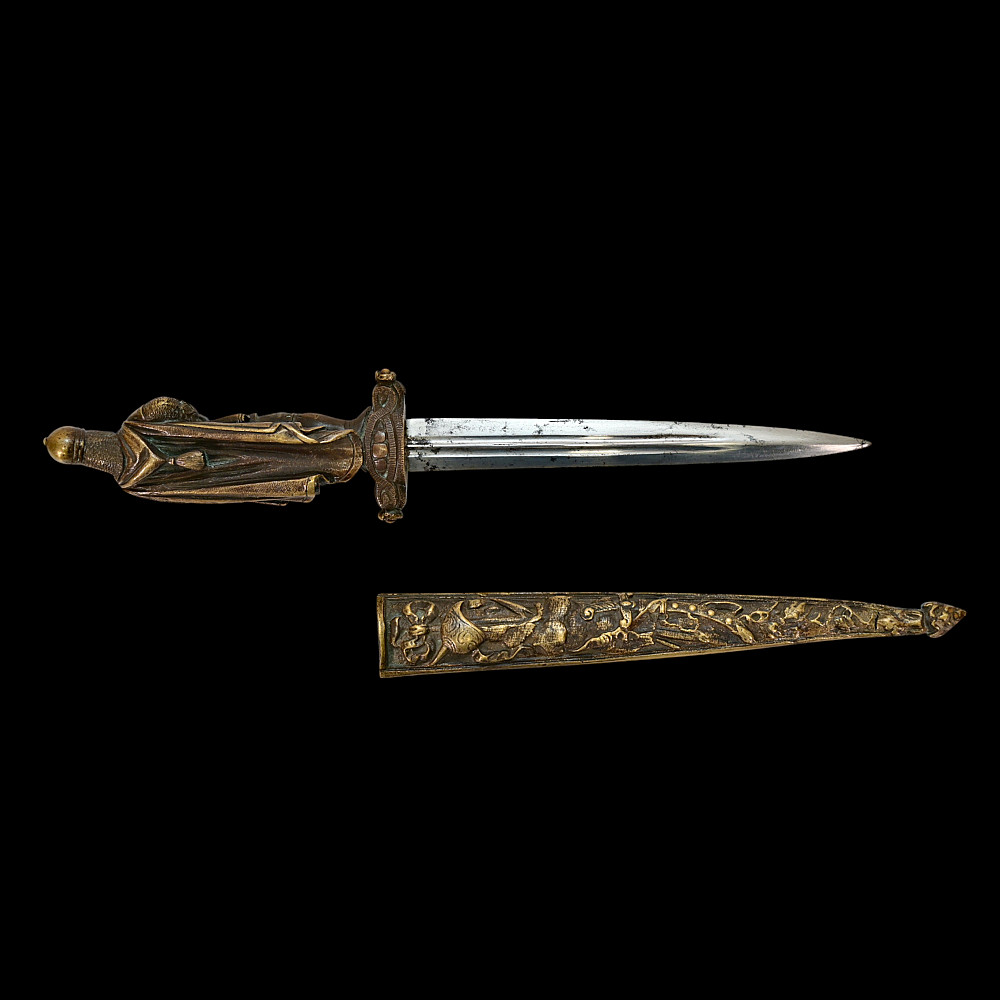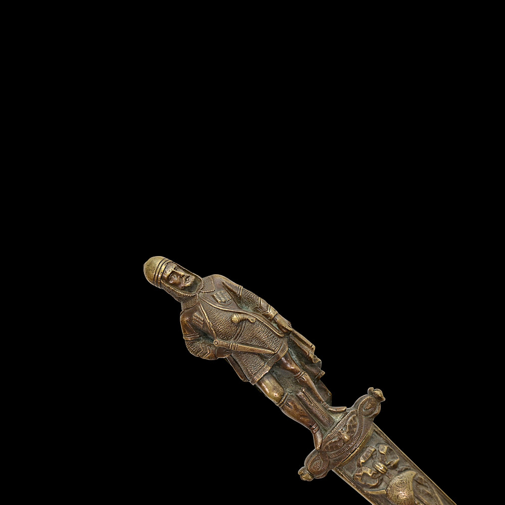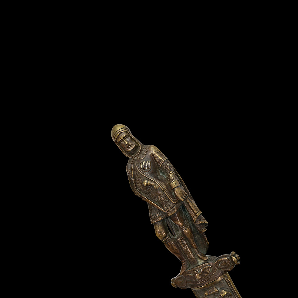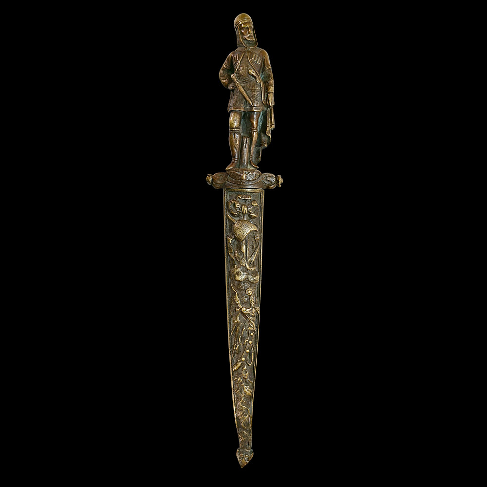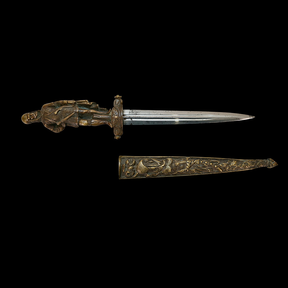 French Dagger with Bronze Figure of Caucasian Knight, 19th Century. An ornate French dagger from the 19th century, distinguished by its finely cast bronze hilt in the form of a knight wearing a helmet and chain mail, standing in full armor. The knight’s pose evokes the chivalric romanticism of the late 19th century, when Neo-Gothic and historic revival styles were in vogue across Europe. The bronze scabbard is richly decorated in high relief with armorial motifs, helmets, and trophies of arms, reflecting the artistry and symbolism of the period. The double-edged steel blade remains well-preserved, displaying a bright surface with light patina. A beautiful and collectible example of 19th-century French decorative weaponry, combining craftsmanship, historical imagination, and the enduring appeal of medieval legend. Condition: very good, with attractive patina and minor signs of age. Length: approx. 27 cm.
