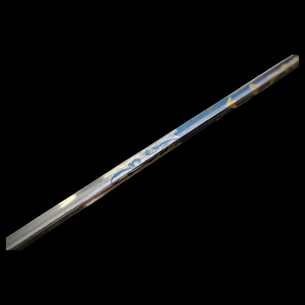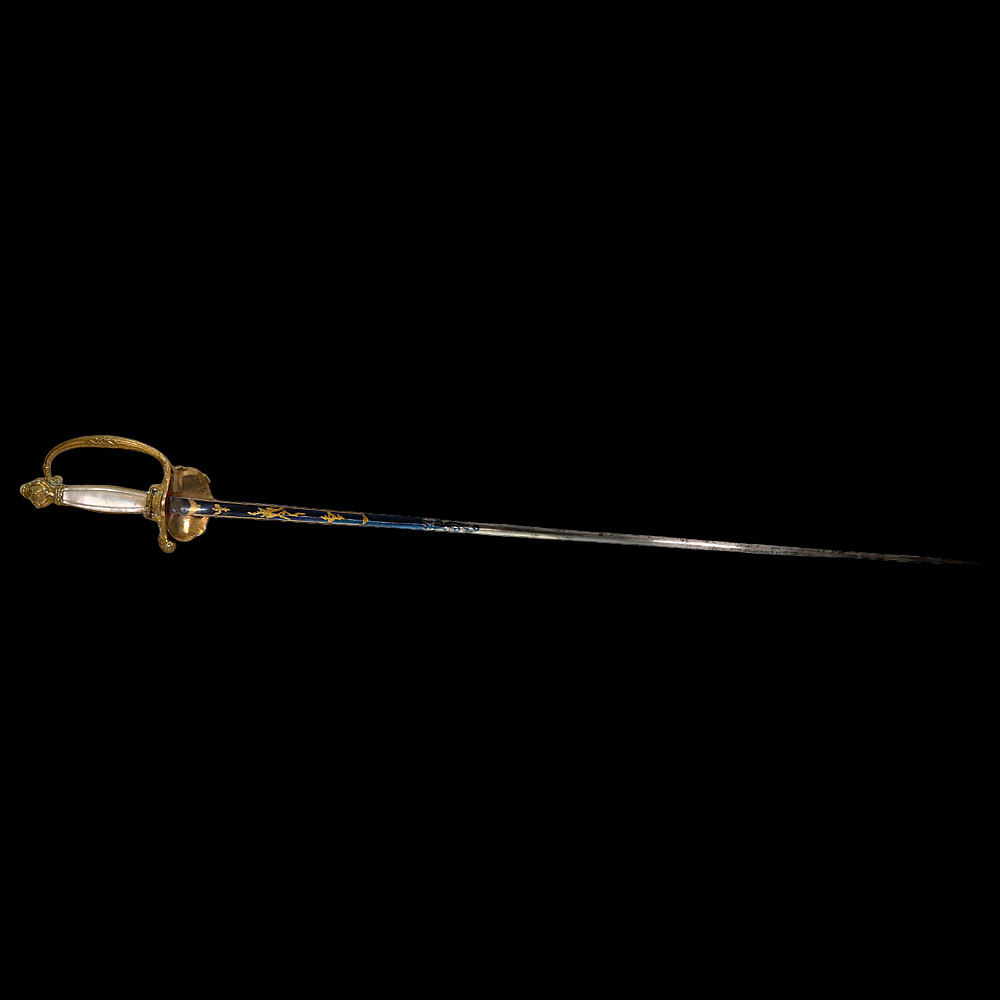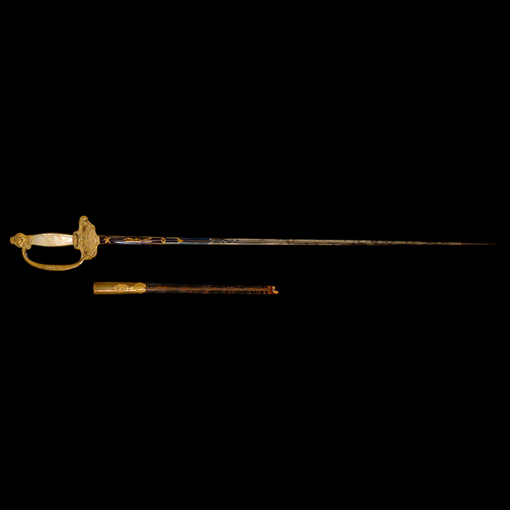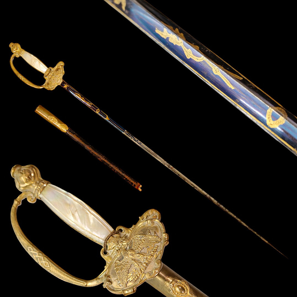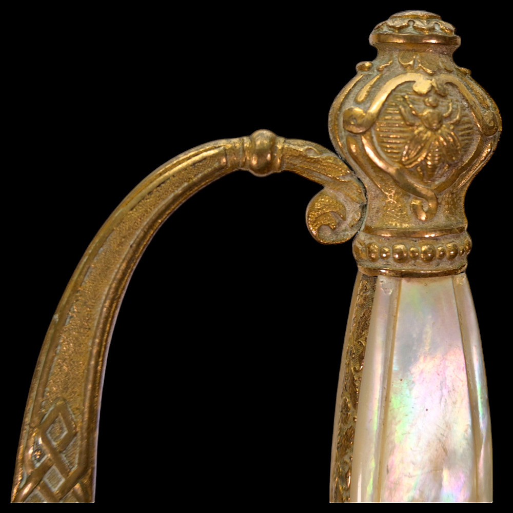 French Smallsword of the Officer of the Powder Department, model 1852. Incurved triangular section blade, engraved and gilded on its first third with military trophies and floral decorations, with a blued background. A brass hilt with remnants of gilding. Guard with an image of an eagle with outstretched wings, standing on Jupiter's spindle, from which six lightning bolts burst forth. Pommel with an image of a bee. The connecting bow is abundantly decorated with characteristic curls. The side linings of the handle are made of mother-of-pearl. The leather scabbard with a brass mouth is broken in the middle. The lower part of the scabbard is missing. A wonderful artifact for connoisseurs of French history. Good condition. Length 92 cm.