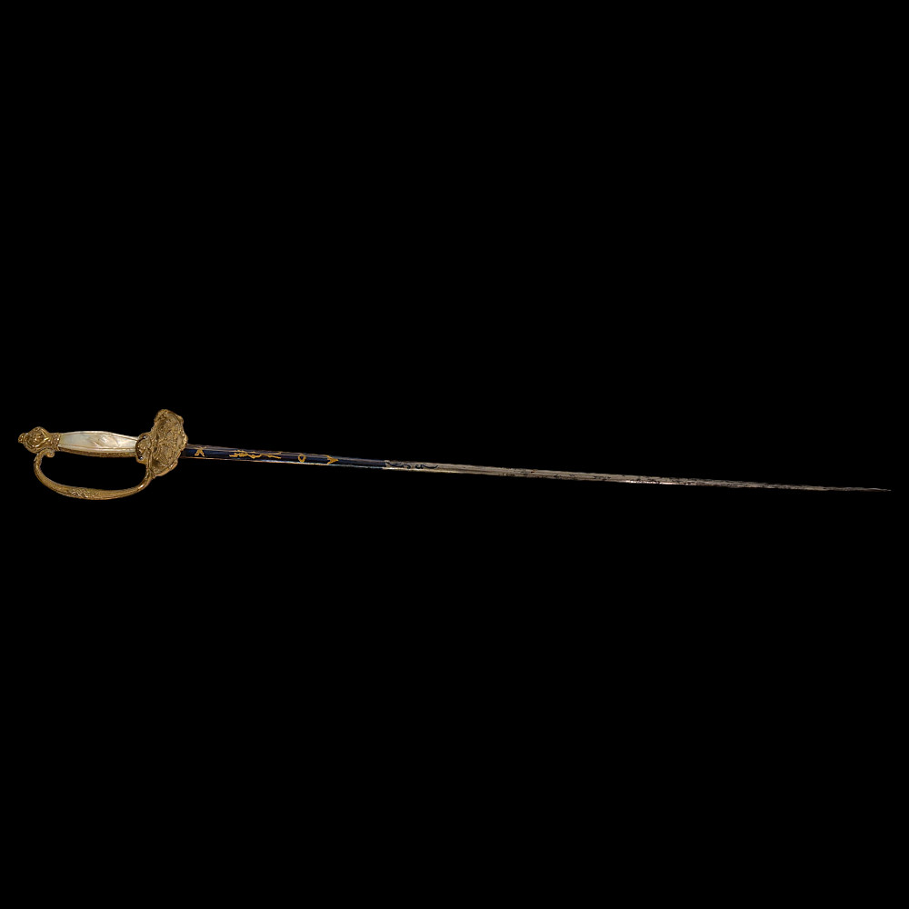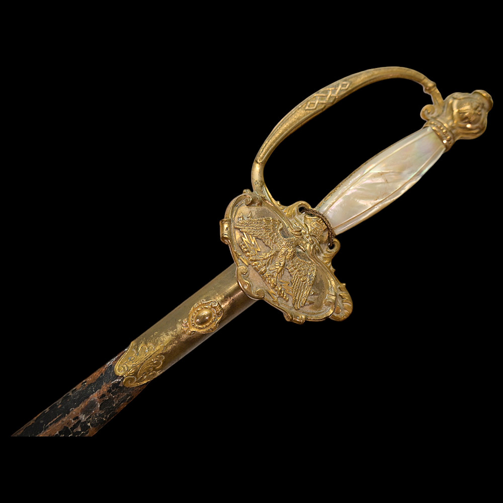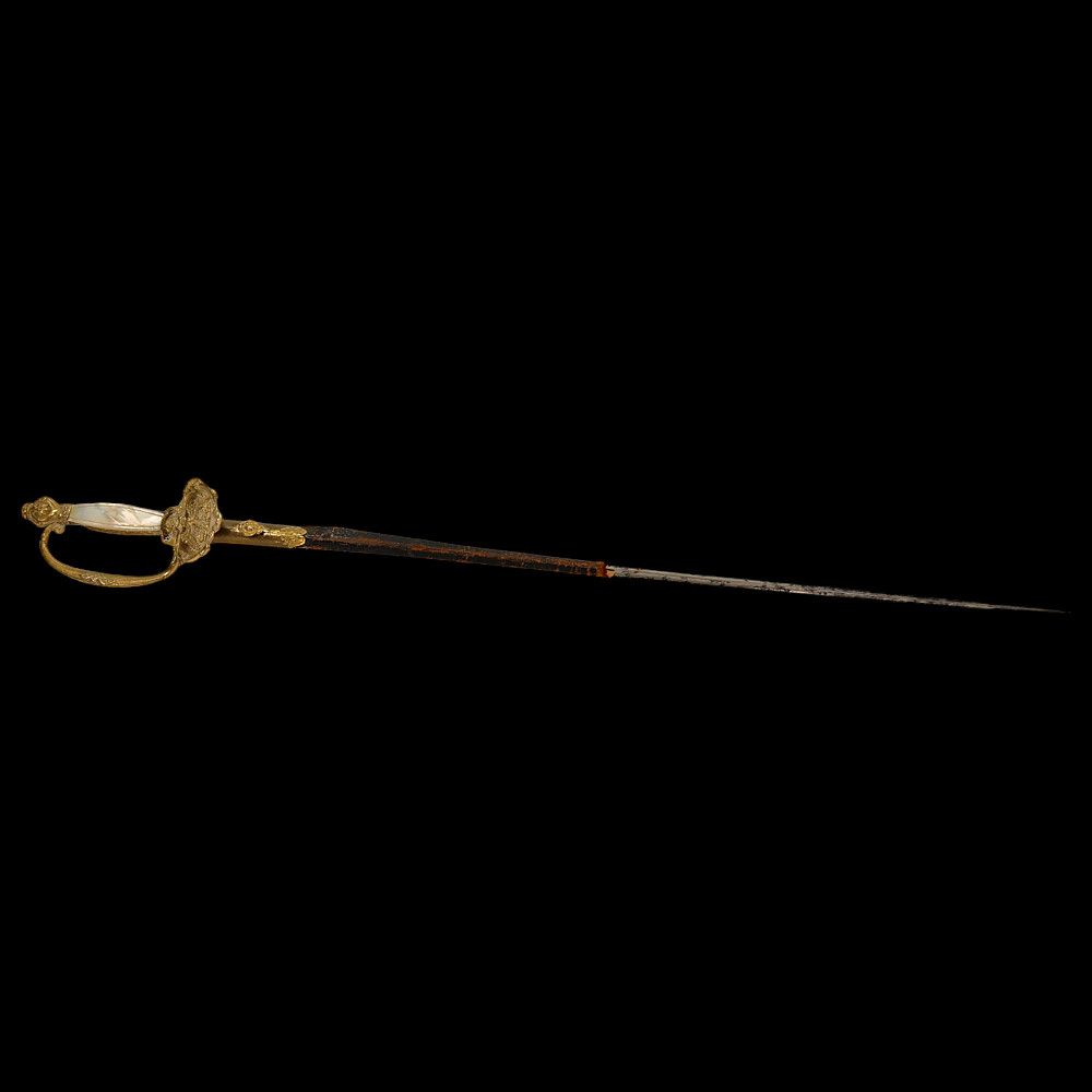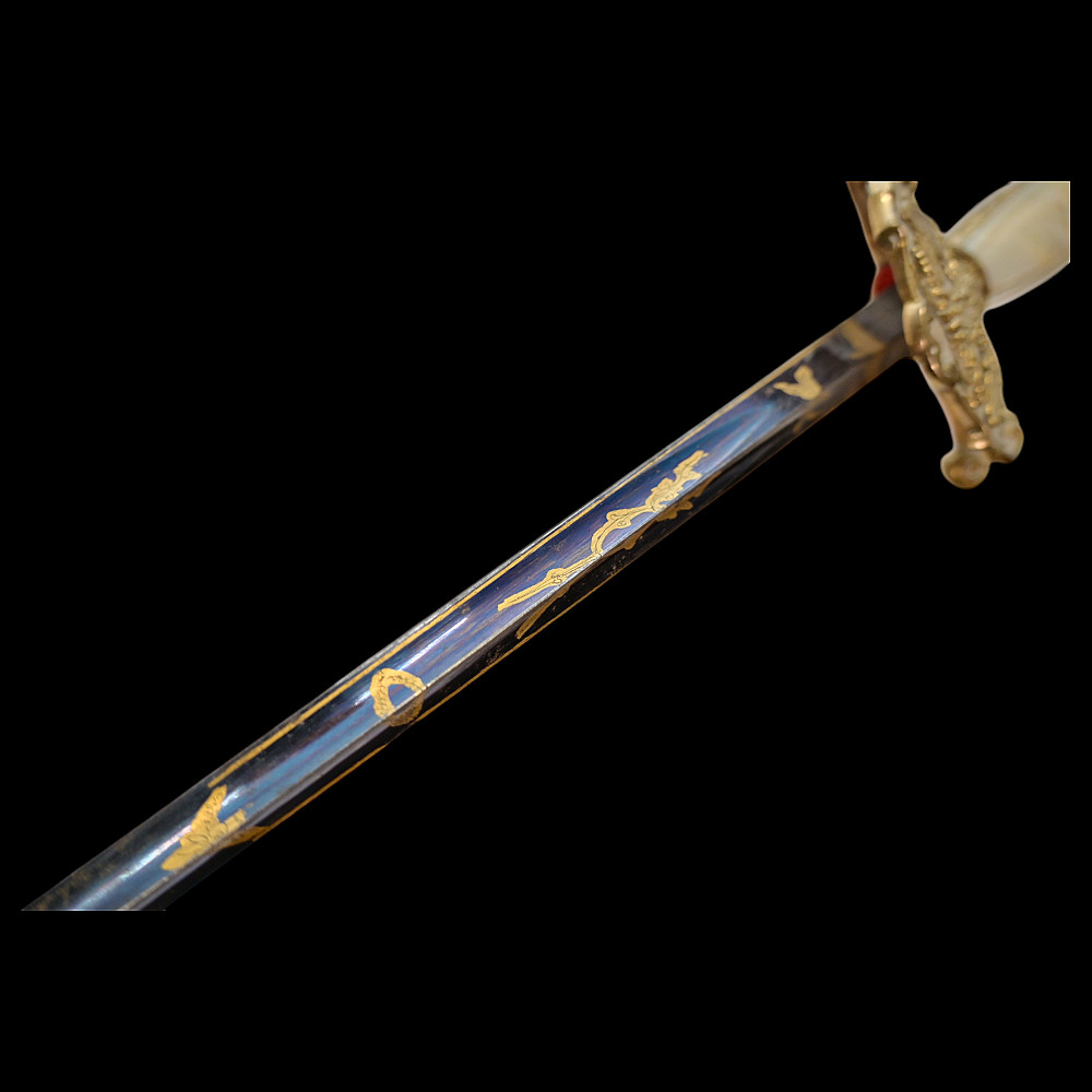French Smallsword of the Officer of the Powder Department, model 1852. Incurved triangular section blade, engraved and gilded on its first third with military trophies and floral decorations, with a blued background. A brass hilt with remnants of gilding. Guard with an image of an eagle with outstretched wings, standing on Jupiter's spindle, from which six lightning bolts burst forth. Pommel with an image of a bee. The connecting bow is abundantly decorated with characteristic curls. The side linings of the handle are made of mother-of-pearl. The leather scabbard with a brass mouth is broken in the middle. The lower part of the scabbard is missing. A wonderful artifact for connoisseurs of French history. Good condition. Length 92 cm.