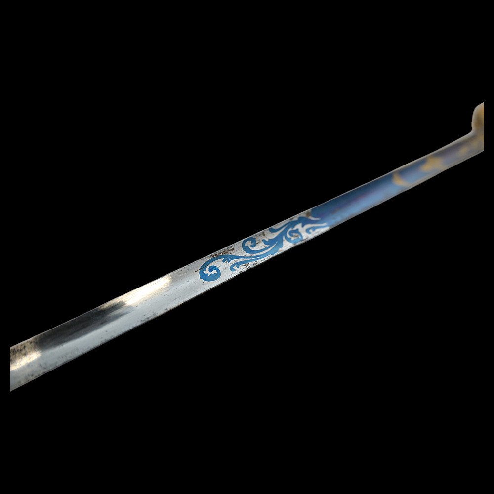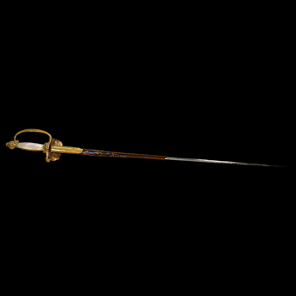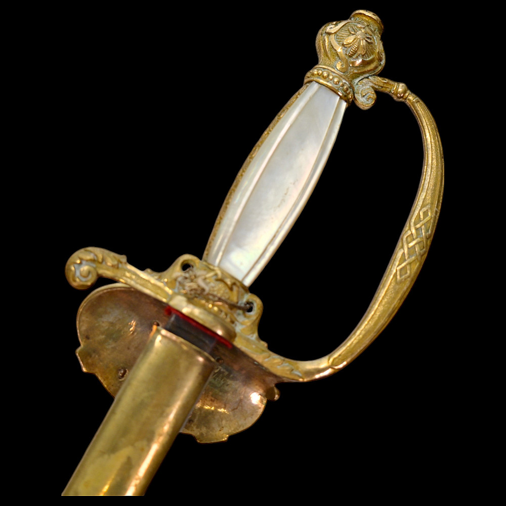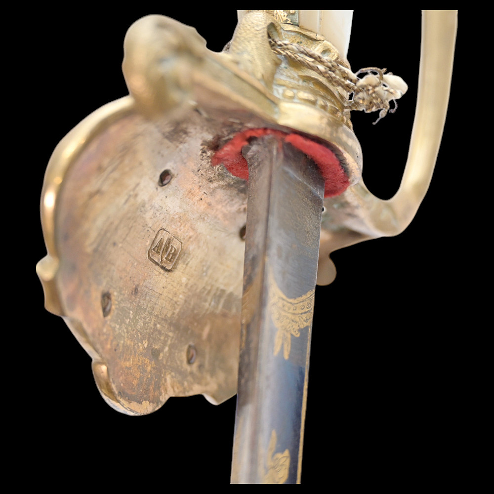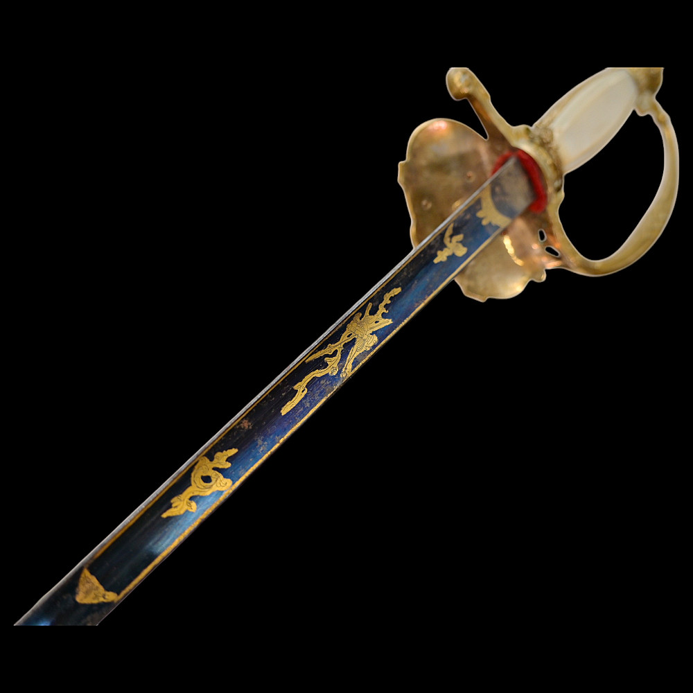 French Smallsword of the Officer of the Powder Department, model 1852. Incurved triangular section blade, engraved and gilded on its first third with military trophies and floral decorations, with a blued background. A brass hilt with remnants of gilding. Guard with an image of an eagle with outstretched wings, standing on Jupiter's spindle, from which six lightning bolts burst forth. Pommel with an image of a bee. The connecting bow is abundantly decorated with characteristic curls. The side linings of the handle are made of mother-of-pearl. The leather scabbard with a brass mouth is broken in the middle. The lower part of the scabbard is missing. A wonderful artifact for connoisseurs of French history. Good condition. Length 92 cm.