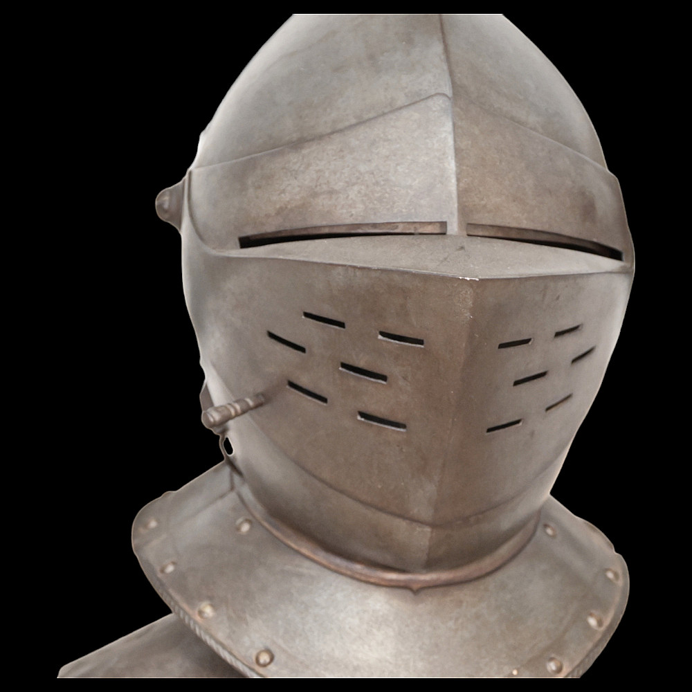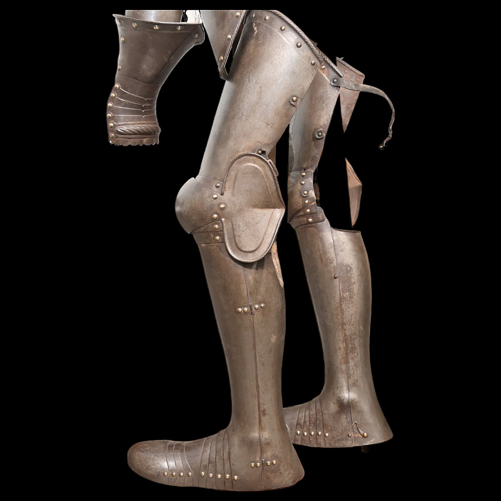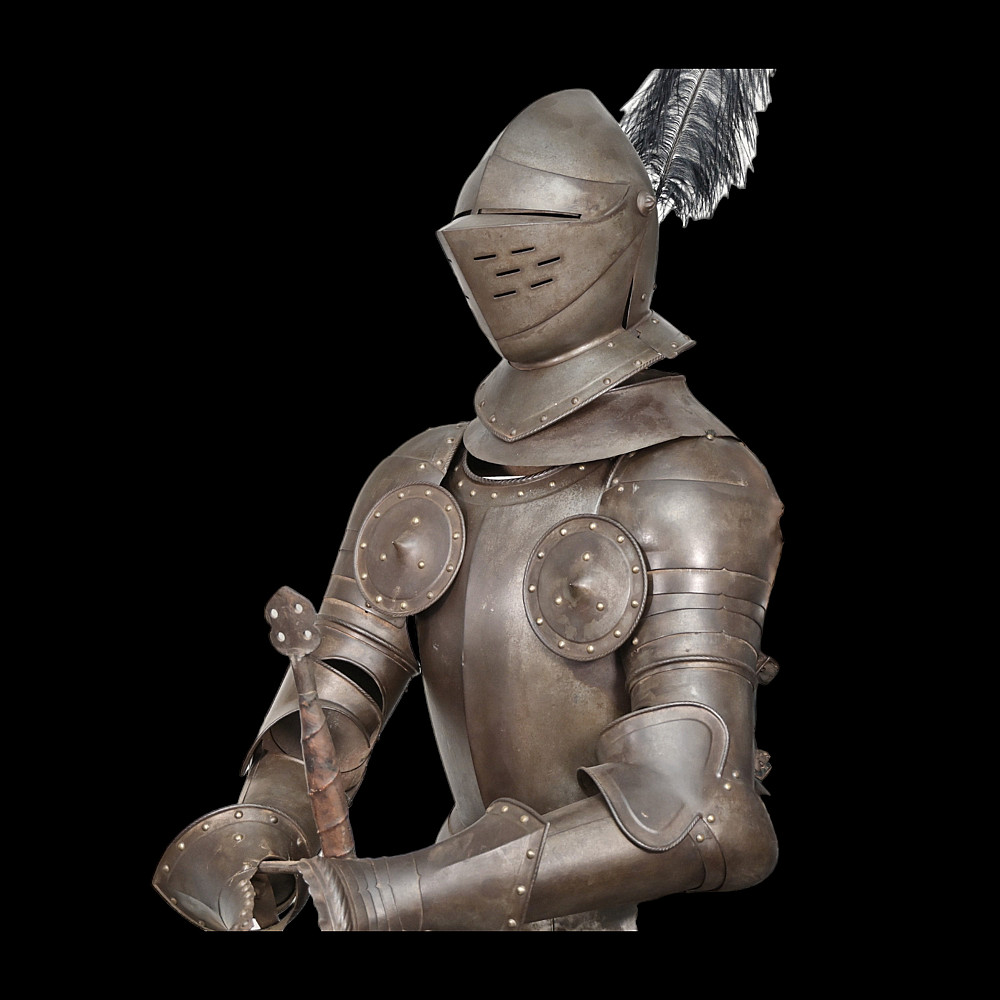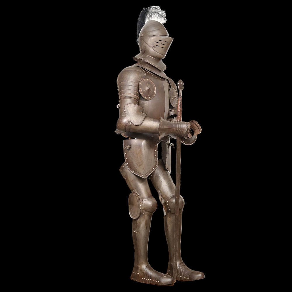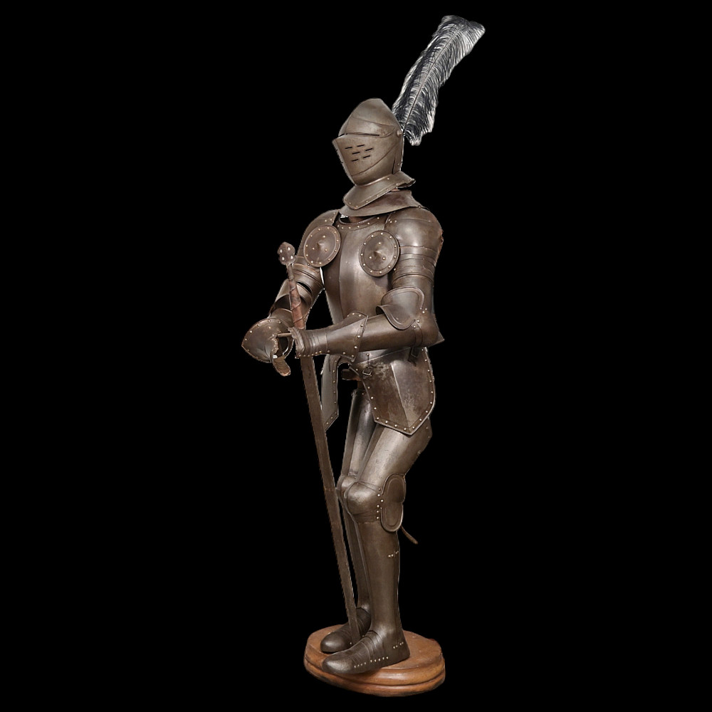 Full knight's armor in the style of the 16th century. Closed helmet. This type armors is typical of the battle dress of the knightly cavalry of southern Germany and Austria in the 16 century. The complete set, without any losses, is a beautiful example in the Renaissance style. Equipped with a half-handed sword. 19 century. Heigh - 180cm.