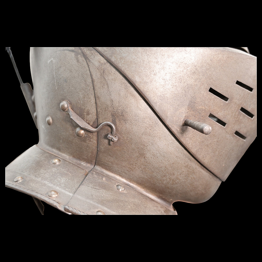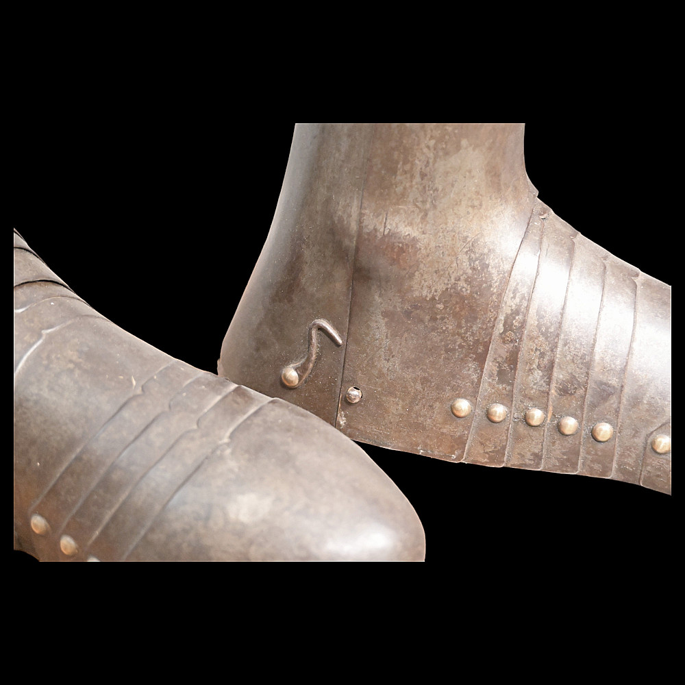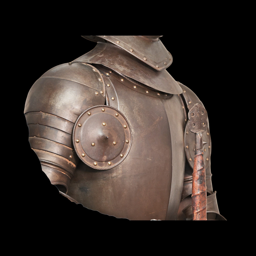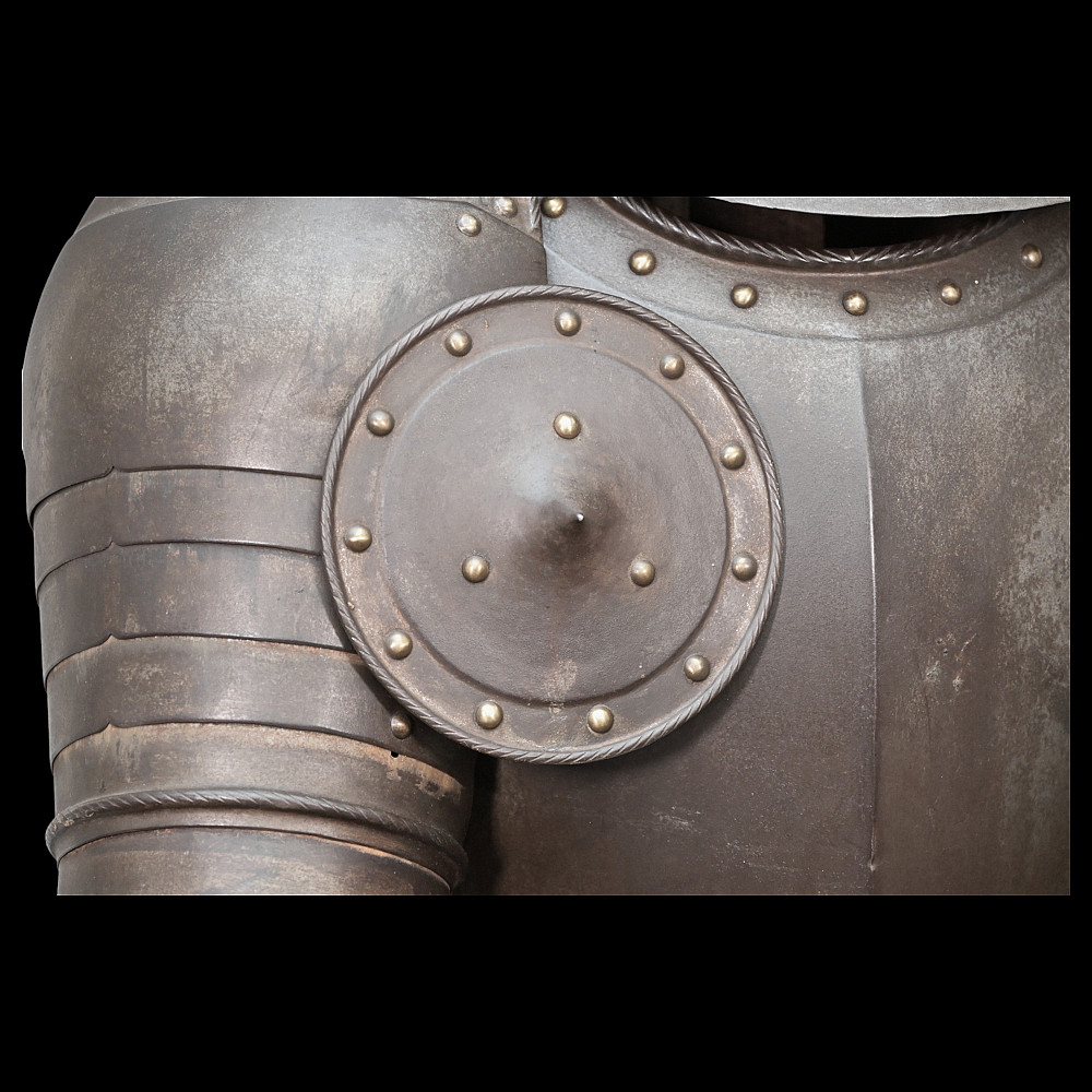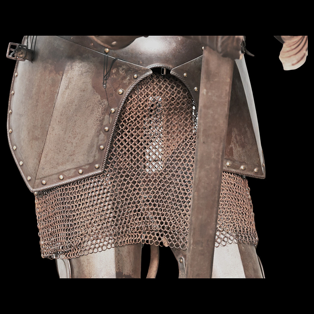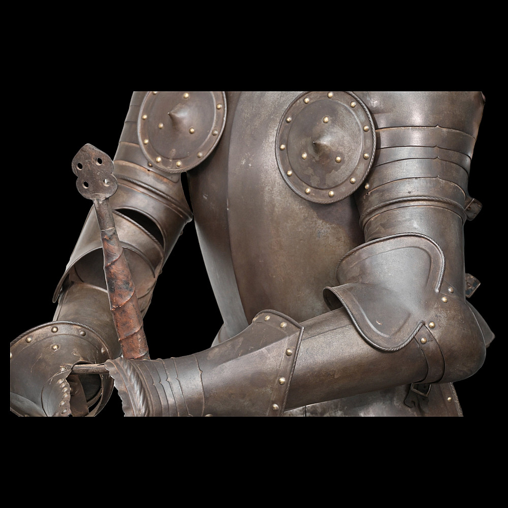 Full knight's armor in the style of the 16th century. Closed helmet. This type armors is typical of the battle dress of the knightly cavalry of southern Germany and Austria in the 16 century. The complete set, without any losses, is a beautiful example in the Renaissance style. Equipped with a half-handed sword. 19 century. Heigh - 180cm.