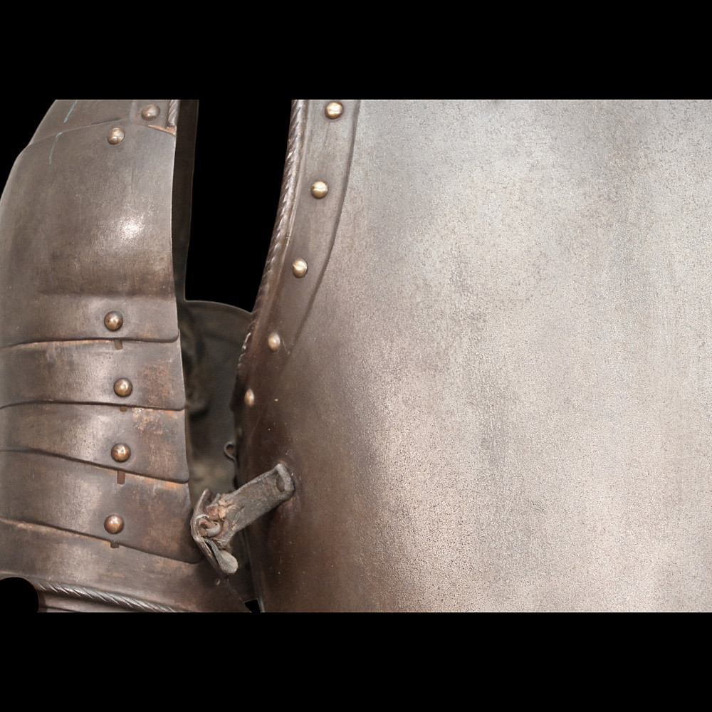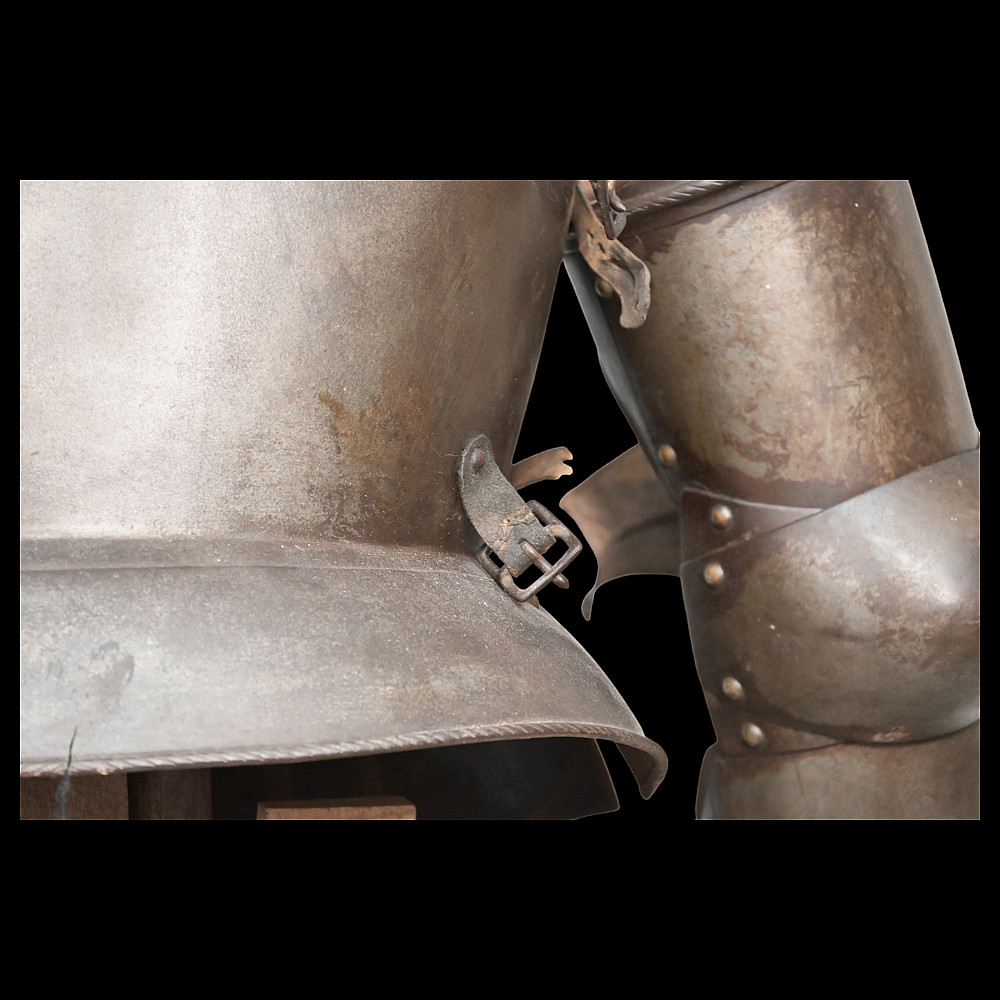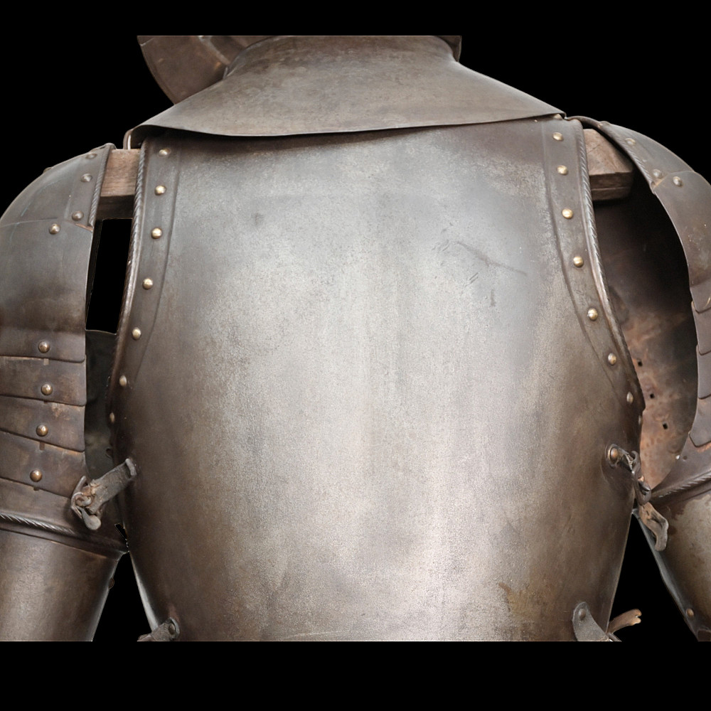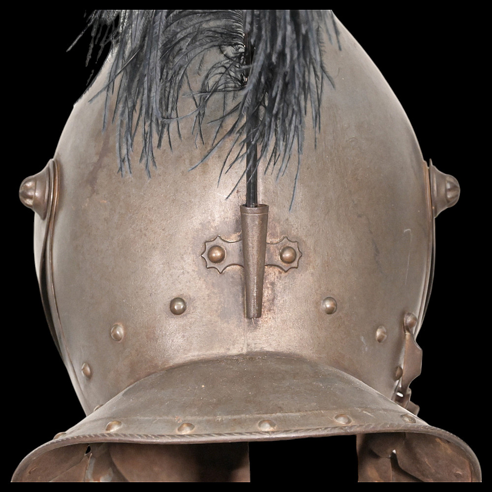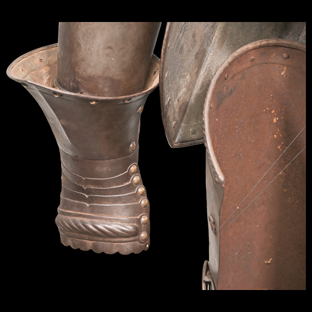 Full knight's armor in the style of the 16th century. Closed helmet. This type armors is typical of the battle dress of the knightly cavalry of southern Germany and Austria in the 16 century. The complete set, without any losses, is a beautiful example in the Renaissance style. Equipped with a half-handed sword. 19 century. Heigh - 180cm.