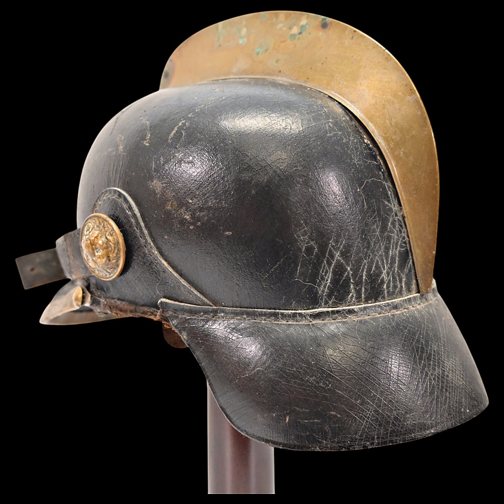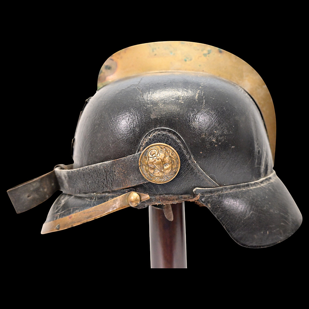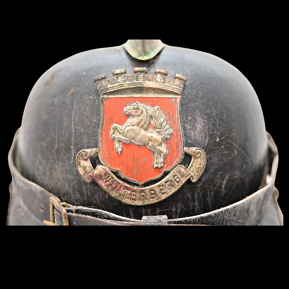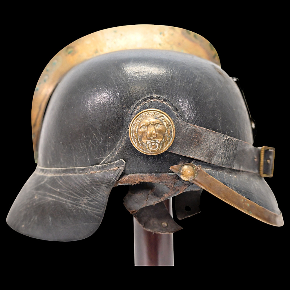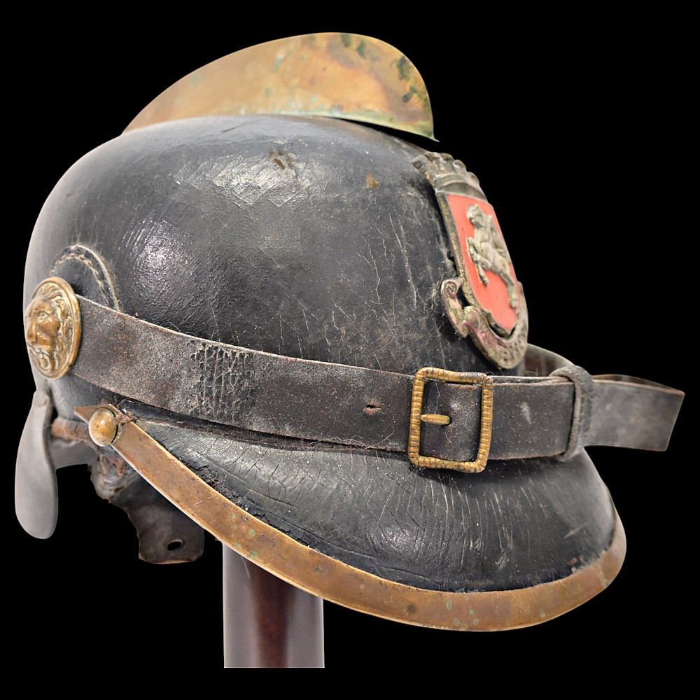 German Firefighter Helmet - City of Winterberg, Lower Saxony, circa 1900. A rare German firefighter’s helmet from the early 20th century, originating from Winterberg, Lower Saxony. Constructed from black leather with a brass comb, lion-head side bosses, and a front emblem with the coat of arms of Lower Saxony and the inscription Winterberg. The helmet features its original leather chinstrap with brass fittings and a brass front and rear trim, typical of German civic fire service headgear from around 1890 - 1910. The interior retains remnants of the leather liner. This model represents the transition between 19th-century Prussian fire helmets and later civic parade types, combining both protective and ceremonial design elements. Condition: Good condition considering age, minor damage, see photos. Dimensions: Height approx. 19 cm; length approx. 24 cm.