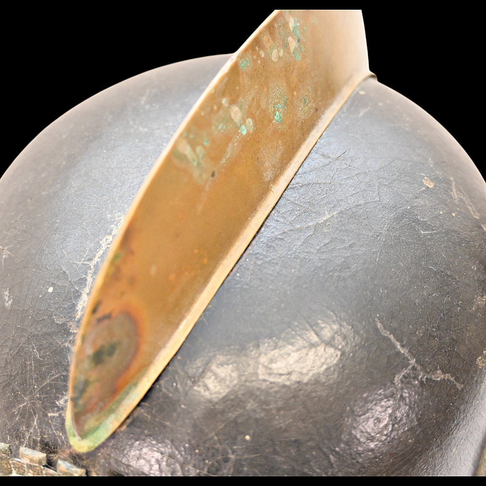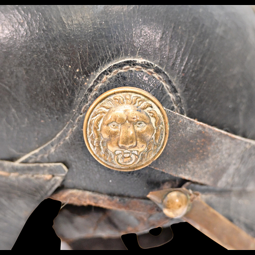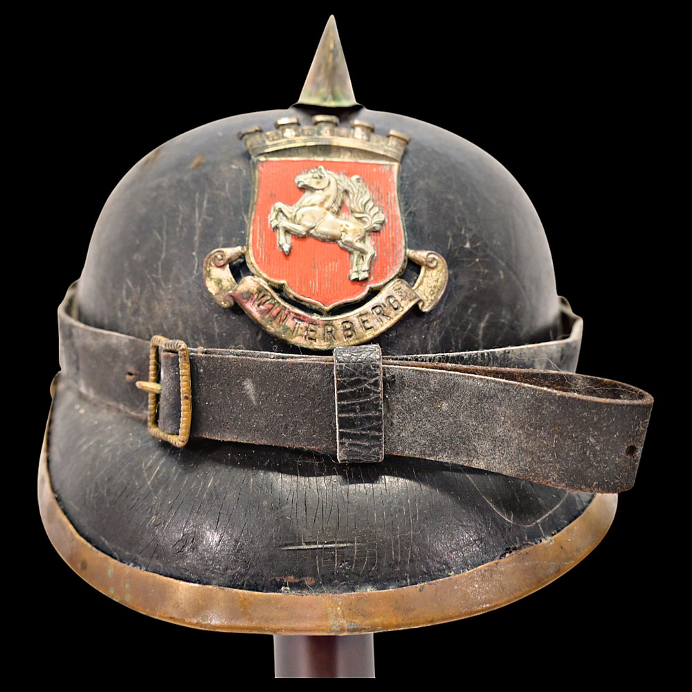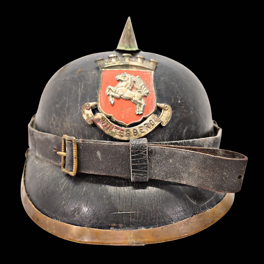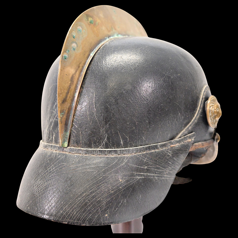 German Firefighter Helmet - City of Winterberg, Lower Saxony, circa 1900. A rare German firefighter’s helmet from the early 20th century, originating from Winterberg, Lower Saxony. Constructed from black leather with a brass comb, lion-head side bosses, and a front emblem with the coat of arms of Lower Saxony and the inscription Winterberg. The helmet features its original leather chinstrap with brass fittings and a brass front and rear trim, typical of German civic fire service headgear from around 1890 - 1910. The interior retains remnants of the leather liner. This model represents the transition between 19th-century Prussian fire helmets and later civic parade types, combining both protective and ceremonial design elements. Condition: Good condition considering age, minor damage, see photos. Dimensions: Height approx. 19 cm; length approx. 24 cm.