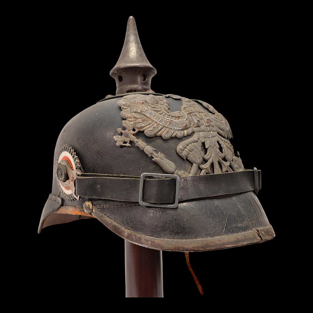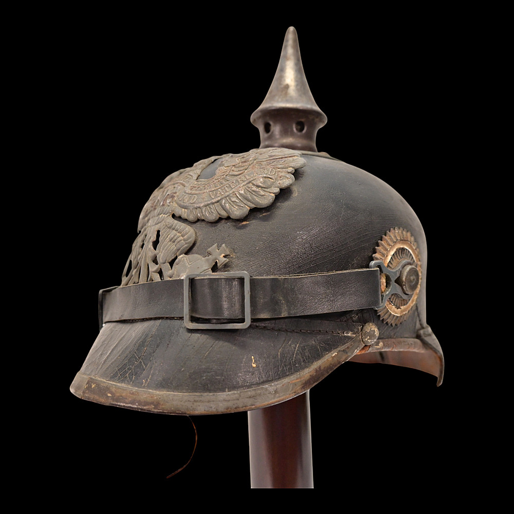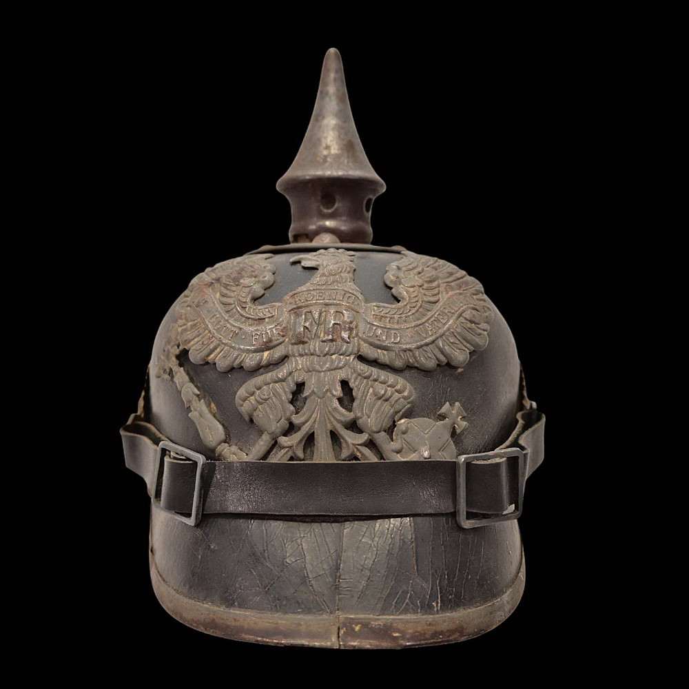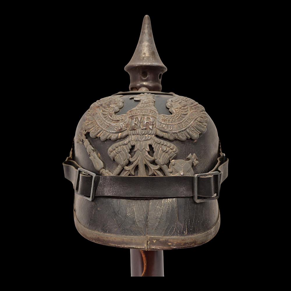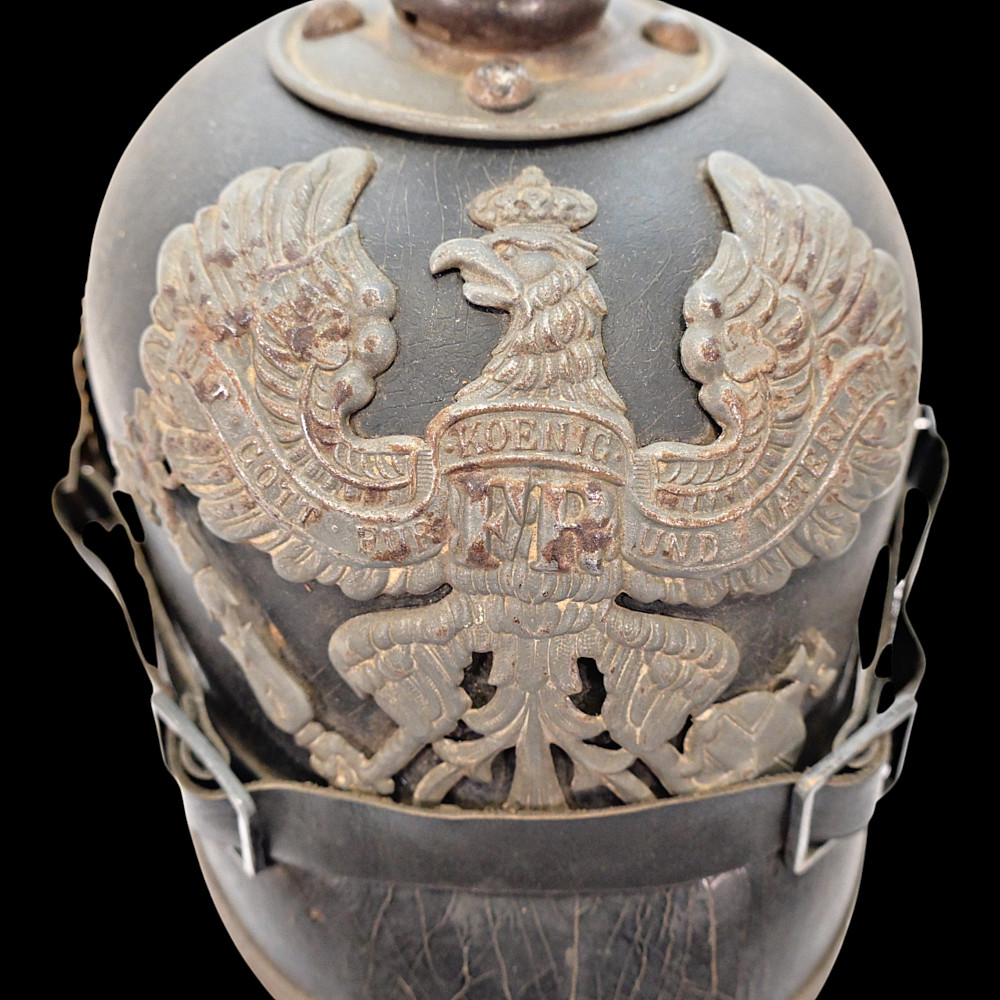 German WWI Imperial Prussian Model 1915 Pickelhaube Helmet. An original Model 1915 Imperial Prussian enlisted man’s Pickelhaube (spiked helmet) from the First World War. This regulation helmet, introduced in 1915, features the wartime grey-finished metal fittings in place of the earlier brass or gilt versions. The black leather body retains its original form with visible age-related craquelure to the surface. The front displays the large Prussian Eagle wappen with the “FR” cipher for Friedrich Rex and banners reading “Mit Gott fur Konig und Vaterland” (“With God for King and Fatherland”). The spike is of the fixed type with ventilation holes, typical of later-war production. Both national cockades are present Prussian and Imperial and the helmet retains its original black leather chinstrap. The interior shows the well-preserved leather liner with age wear, consistent with period use and storage. Condition: Overall good, showing service wear, patina, and age cracks to leather; fittings with uniform oxidation. Liner complete. Dimensions: Height with spike approx. 23 cm.
