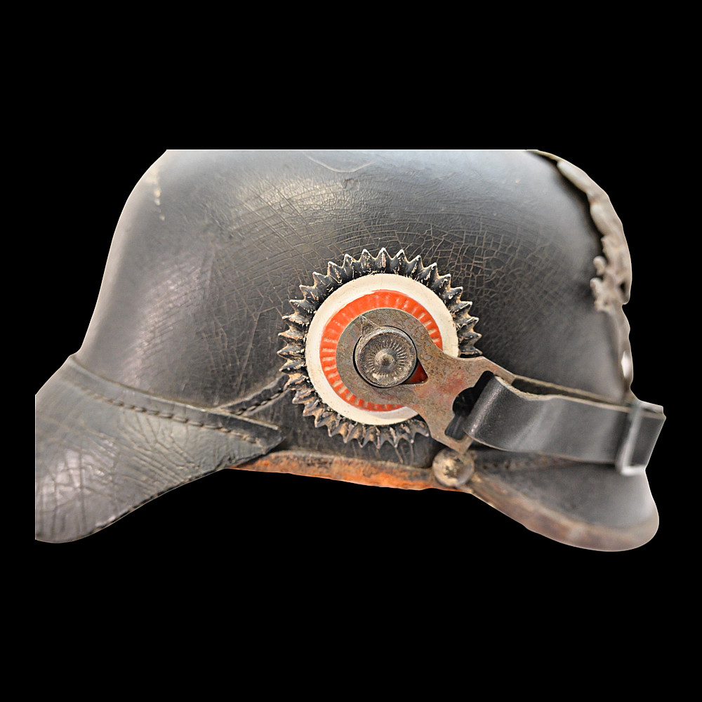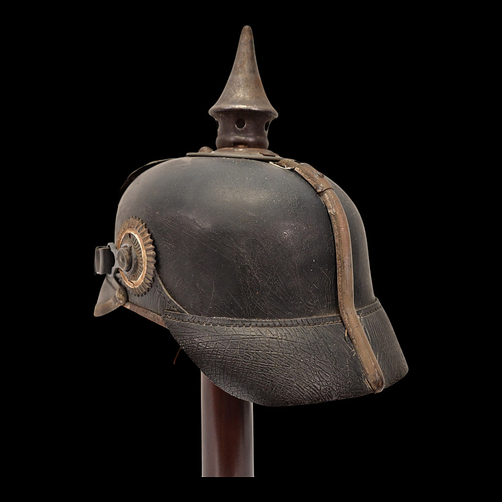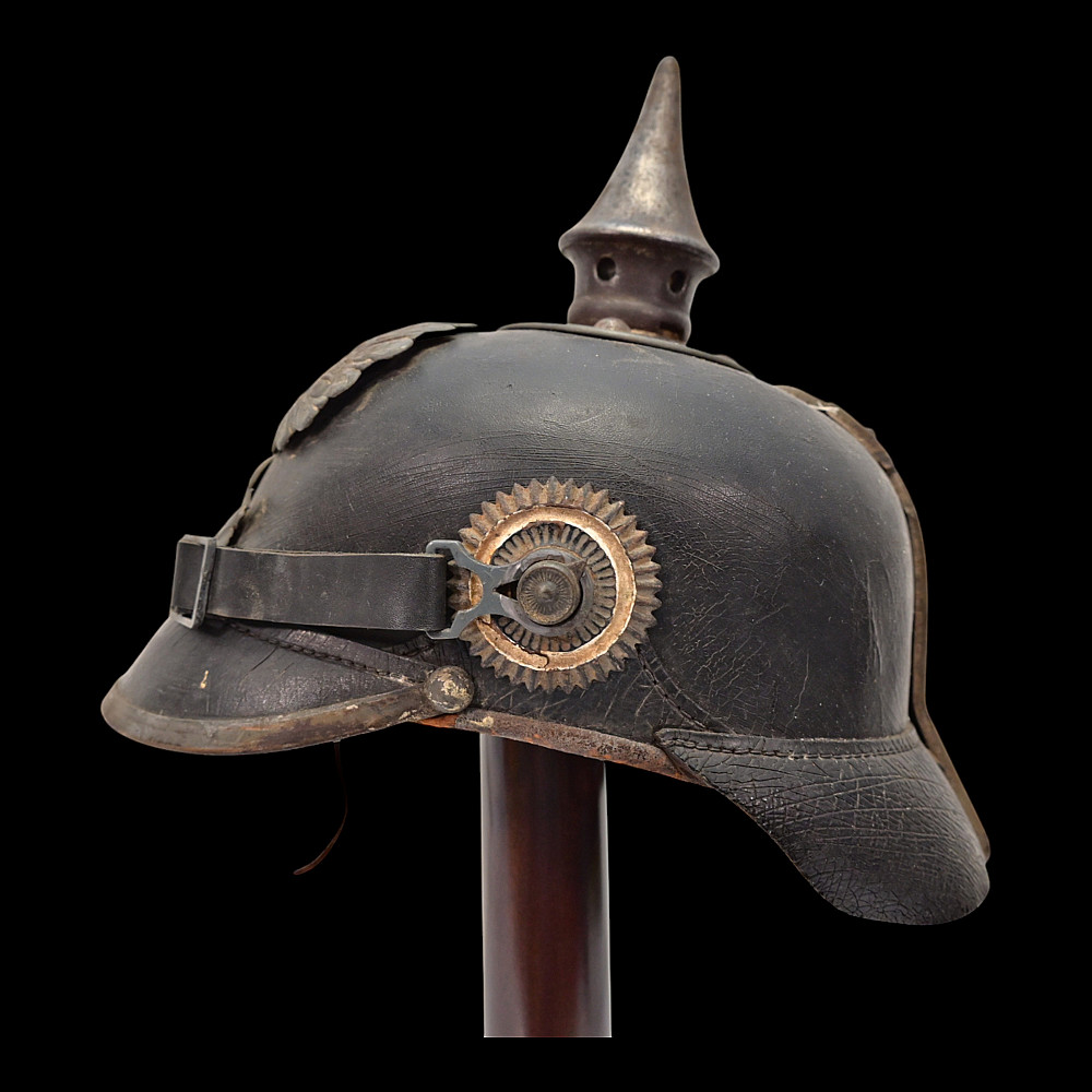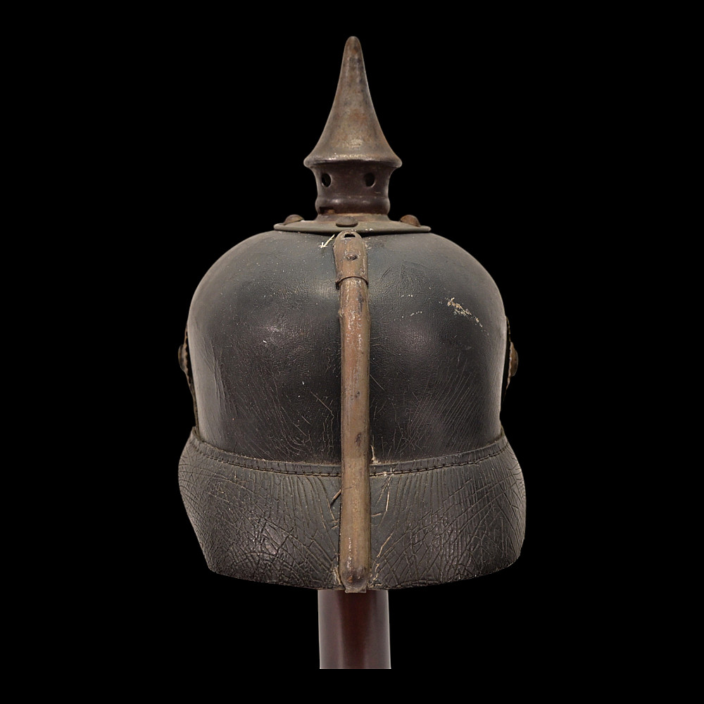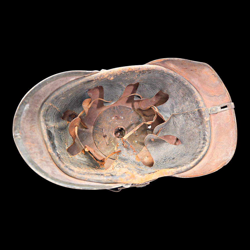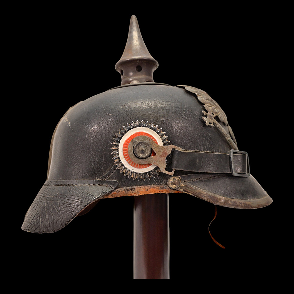 German WWI Imperial Prussian Model 1915 Pickelhaube Helmet. An original Model 1915 Imperial Prussian enlisted man’s Pickelhaube (spiked helmet) from the First World War. This regulation helmet, introduced in 1915, features the wartime grey-finished metal fittings in place of the earlier brass or gilt versions. The black leather body retains its original form with visible age-related craquelure to the surface. The front displays the large Prussian Eagle wappen with the “FR” cipher for Friedrich Rex and banners reading “Mit Gott fur Konig und Vaterland” (“With God for King and Fatherland”). The spike is of the fixed type with ventilation holes, typical of later-war production. Both national cockades are present Prussian and Imperial and the helmet retains its original black leather chinstrap. The interior shows the well-preserved leather liner with age wear, consistent with period use and storage. Condition: Overall good, showing service wear, patina, and age cracks to leather; fittings with uniform oxidation. Liner complete. Dimensions: Height with spike approx. 23 cm.