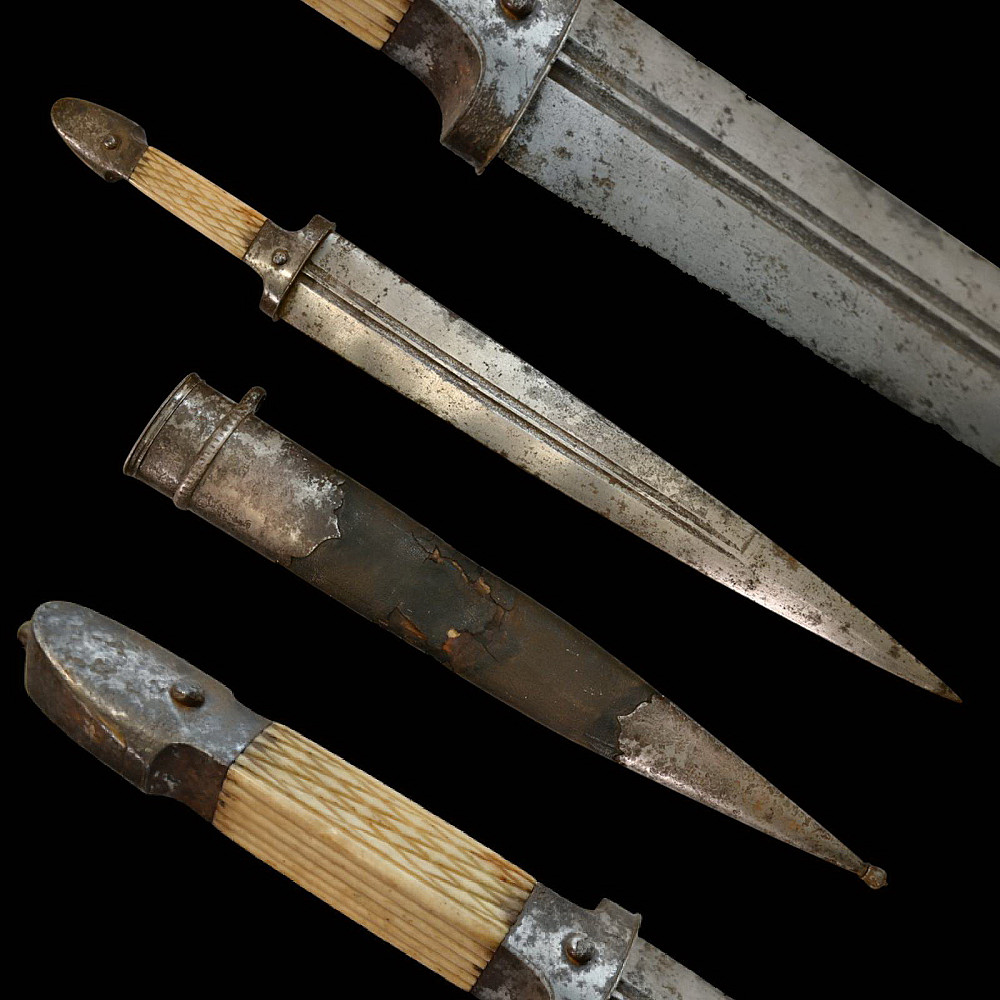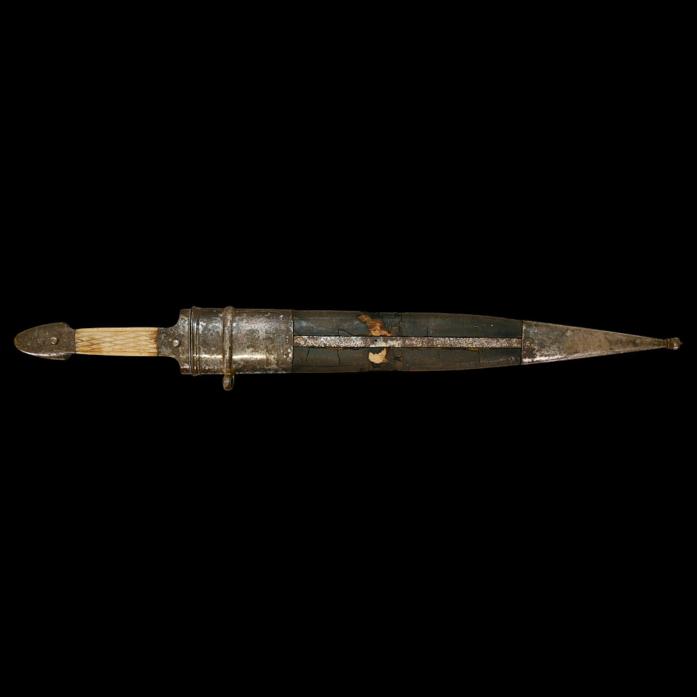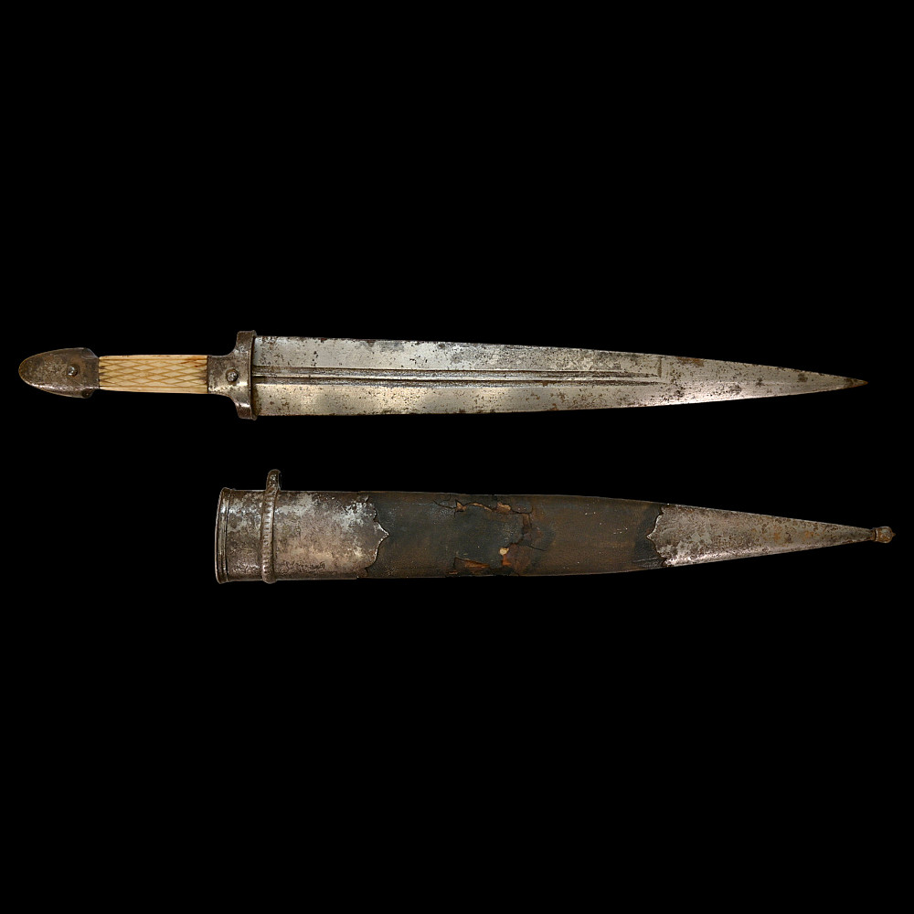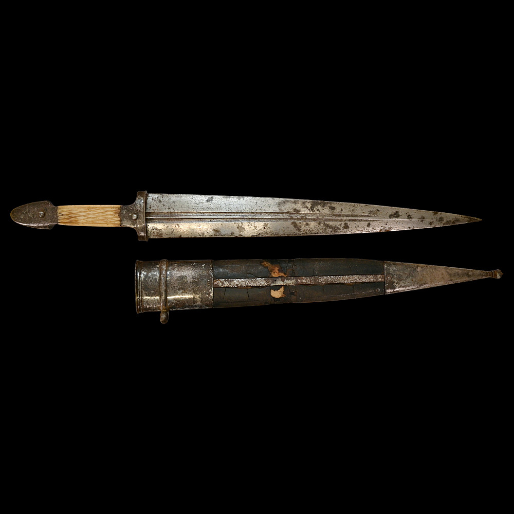 Hunting Dagger, Russian Empire, circa 1900. A fine Russian hunting dagger, dating to around 1900, complete with its original metal-mounted leather scabbard. The double-edged blade with a two fullers on each side. The hilt is fitted with a carved bone grip, the pommel and guard of steel. The scabbard features iron fittings including a suspension ring and finial. A representative example of a late Imperial Russian hunting sidearm, Good condition. Length: approx. 55 cm.