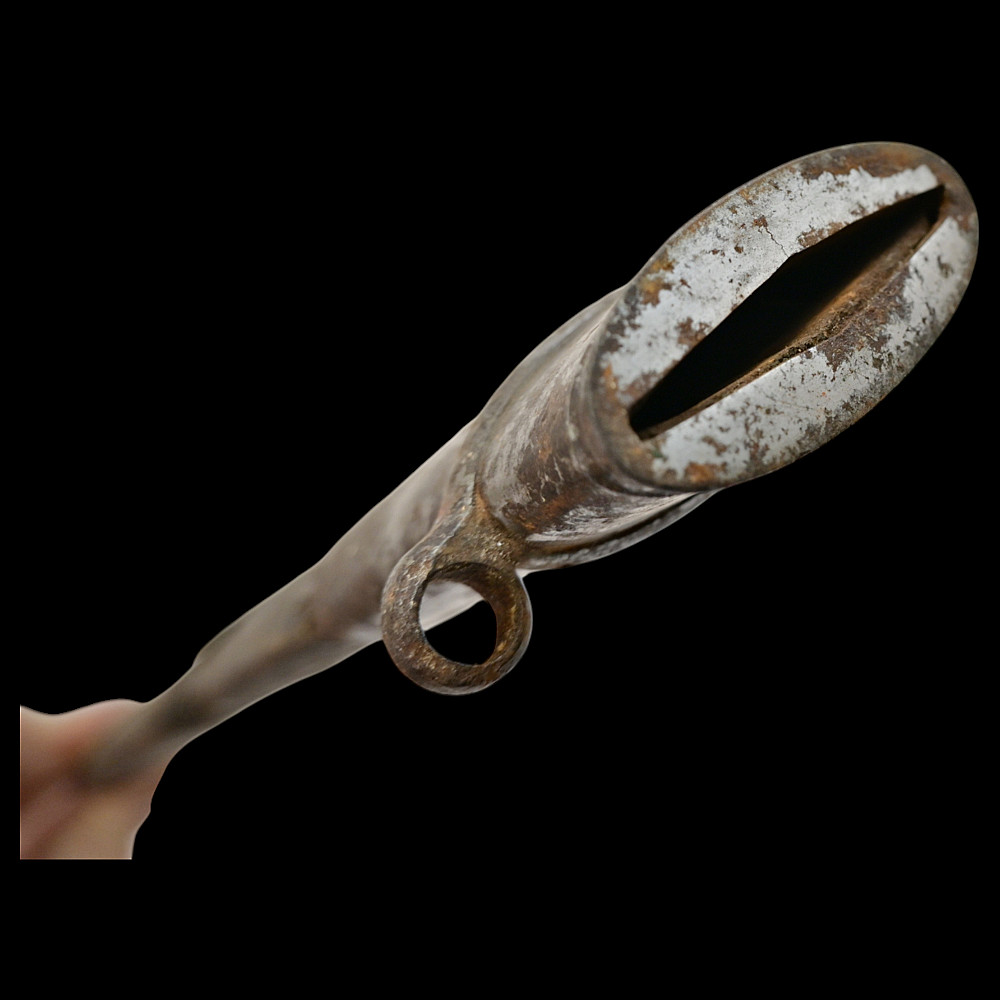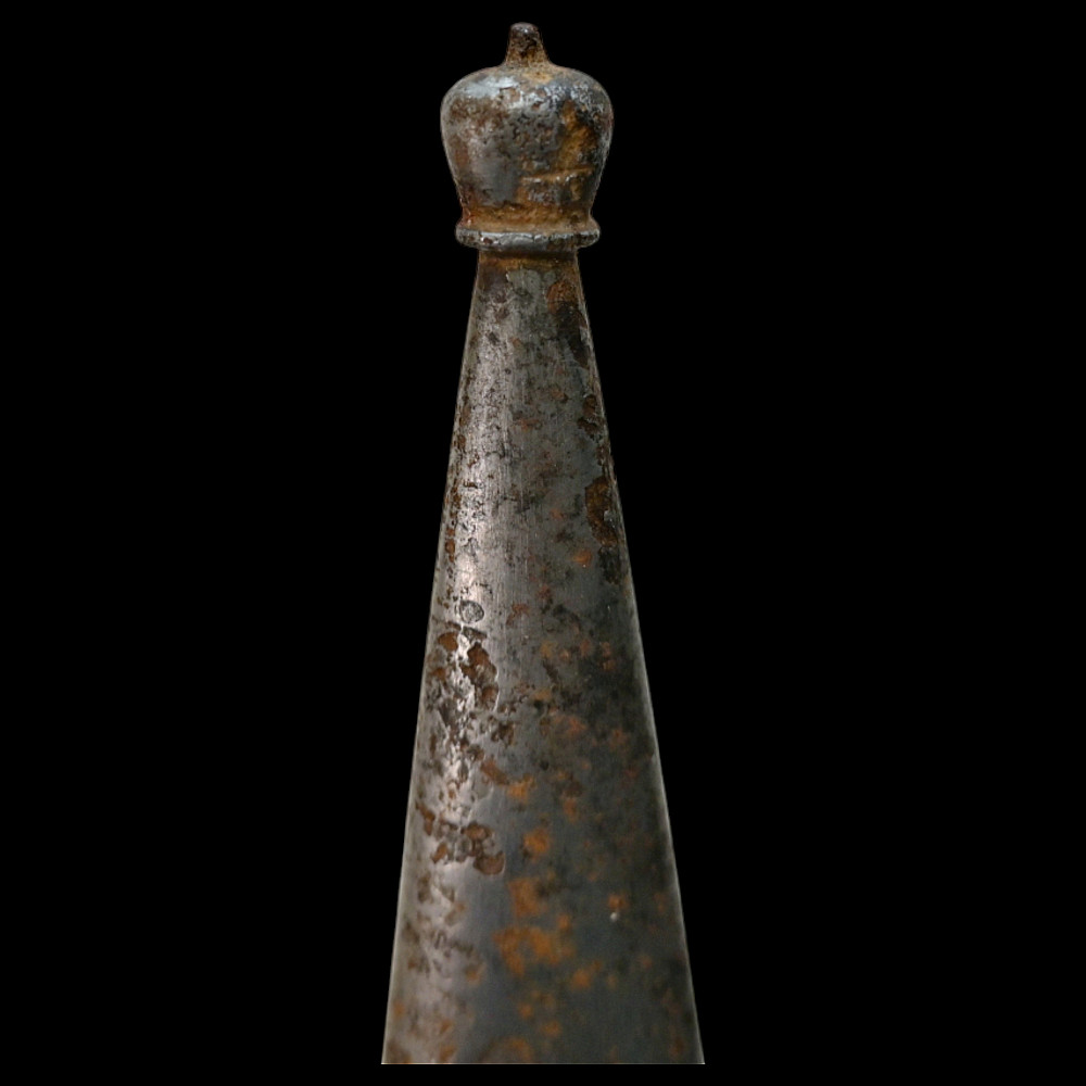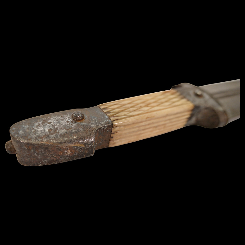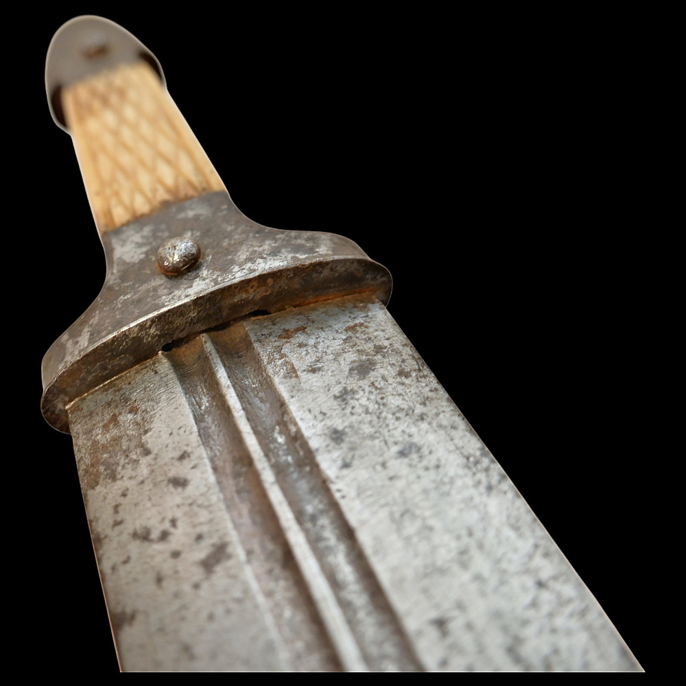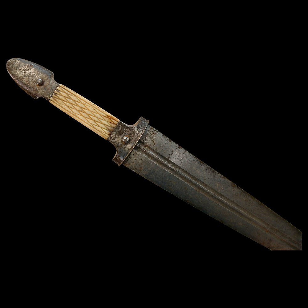Hunting Dagger, Russian Empire, circa 1900. A fine Russian hunting dagger, dating to around 1900, complete with its original metal-mounted leather scabbard. The double-edged blade with a two fullers on each side. The hilt is fitted with a carved bone grip, the pommel and guard of steel. The scabbard features iron fittings including a suspension ring and finial. A representative example of a late Imperial Russian hunting sidearm, Good condition. Length: approx. 55 cm.