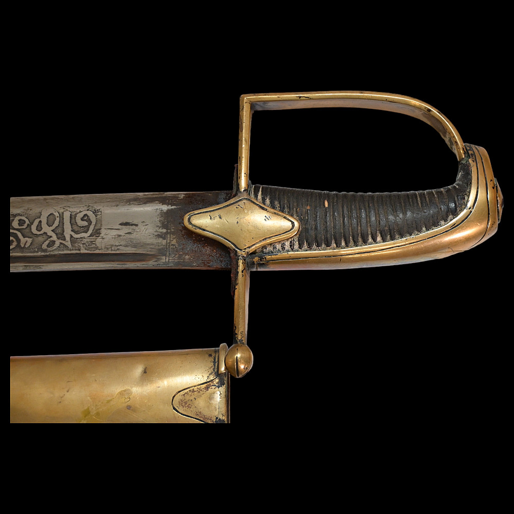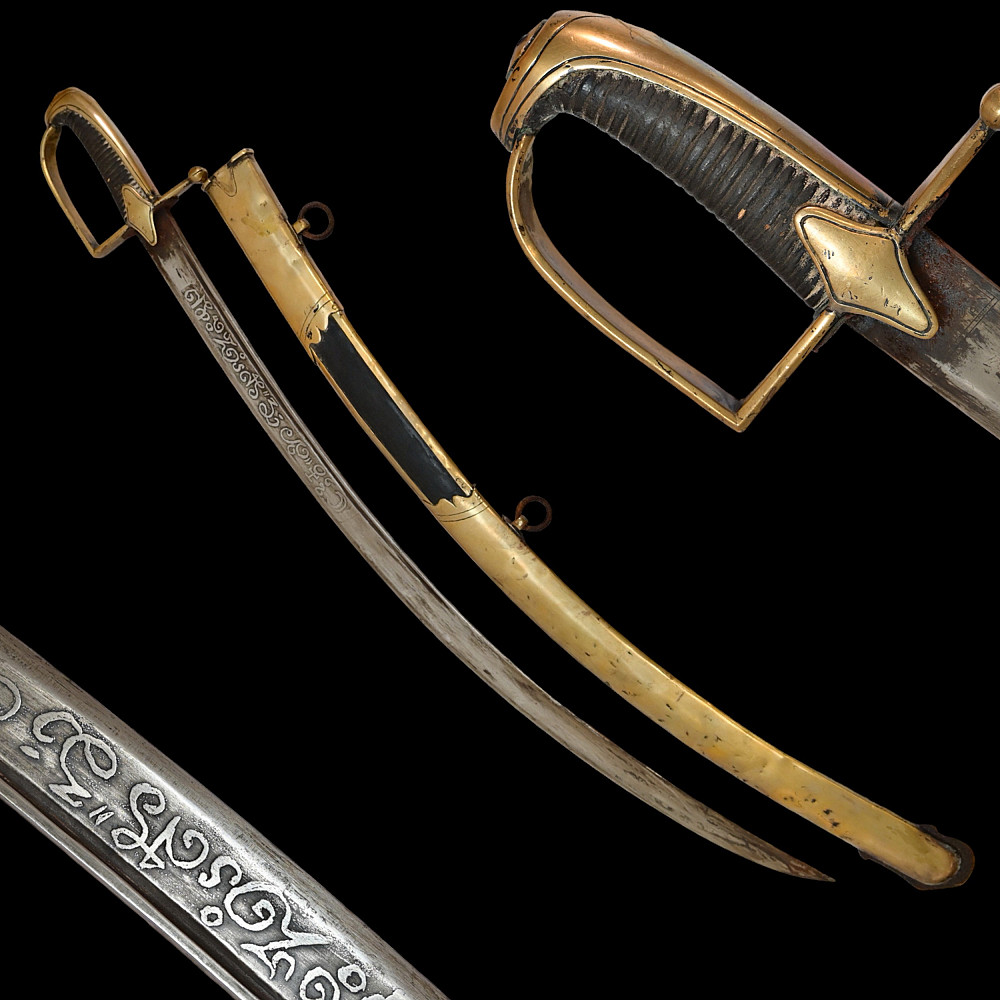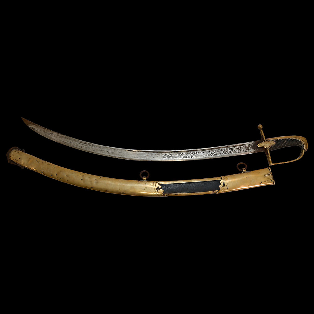 Hussar sabre, France, First Empire period, early 19th century. This example with a single edged curved blade with two fullers on each side. On both sides the blade is decorated with cabalistic magical inscriptions. The hilt with single brass bar guard and leather-covered wooden handle. Housed in original brass and leather panel scabbard. overall length cm.