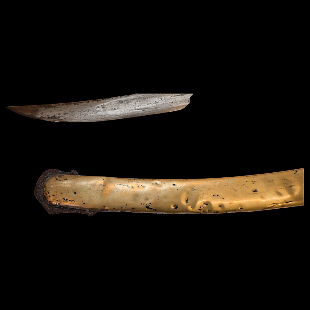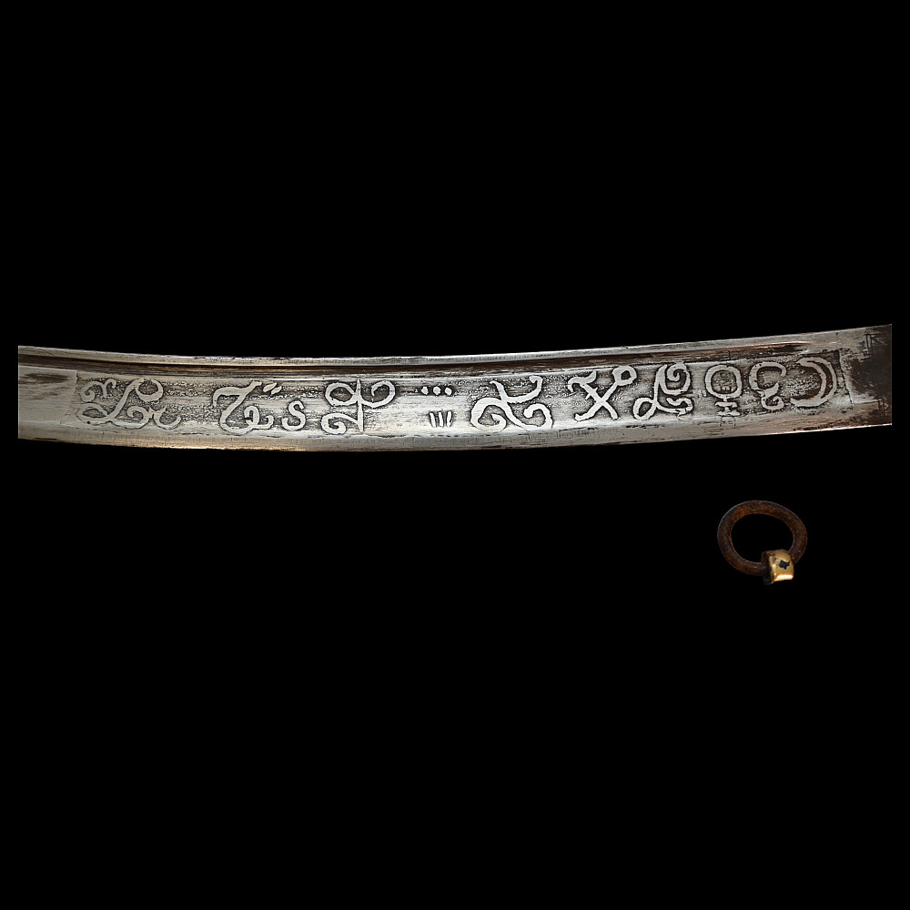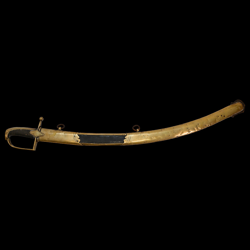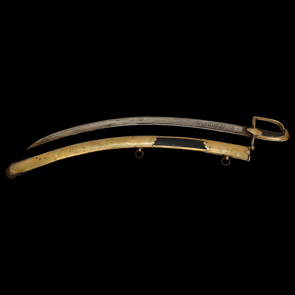 Hussar sabre, France, First Empire period, early 19th century. This example with a single edged curved blade with two fullers on each side. On both sides the blade is decorated with cabalistic magical inscriptions. The hilt with single brass bar guard and leather-covered wooden handle. Housed in original brass and leather panel scabbard. overall length cm.
