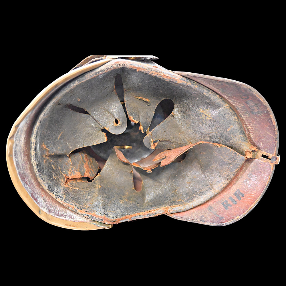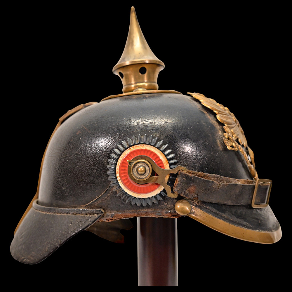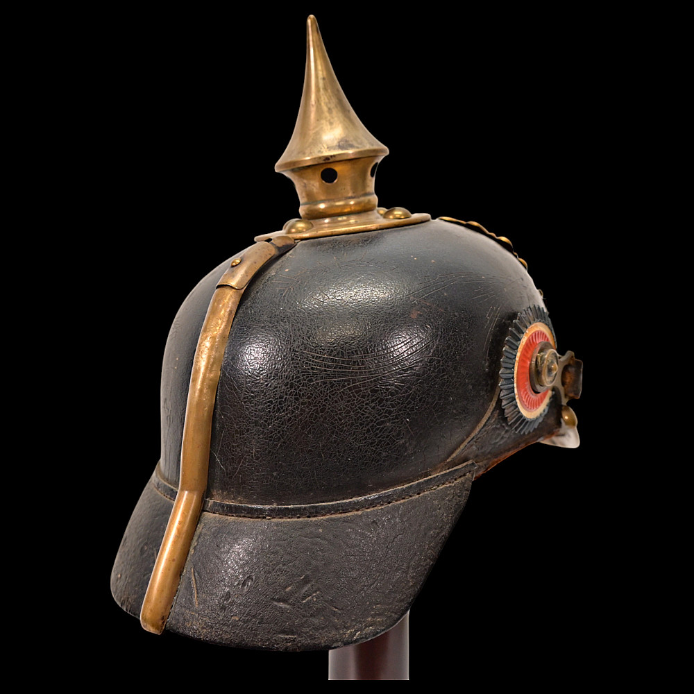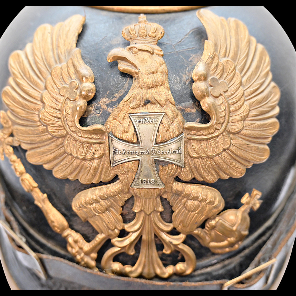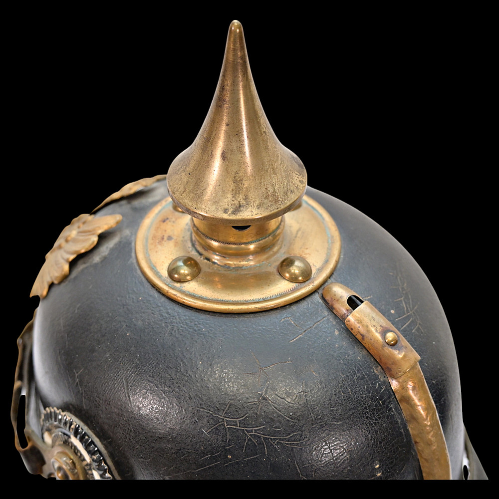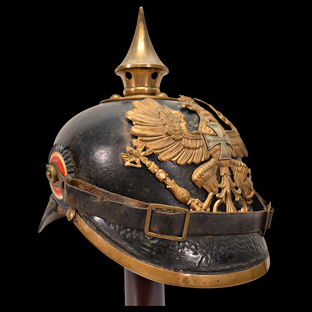 Imperial German Model 1895 Prussian Reservist Pickelhaube Helmet, Reserve Infantry Regiment No 28. An authentic Model 1895 Prussian enlisted man’s Pickelhaube (spiked helmet), issued to a Reservist of the Imperial German Army during World War I. Constructed from black lacquered leather with brass fittings, including the spike, front plate, trim, and chinstrap fittings. The large Prussian eagle (Wappen) dominates the front, finely detailed and clutching scepter and orb, bearing on its breast a nickel-silver reserve cross inscribed “Mit Gott fur Konig und Vaterland – 1813” (“With God for King and Fatherland – 1813”), identifying this example as a reservist issue. Both original side cockades are present: the national red-white-black on the right and the Prussian black-and-white on the left, secured by the original black leather chinstrap. The interior retains its original brown leather liner, showing age. The rear visor is faintly unit-stamped “RIR 28” (Reserve Infantry Regiment No. 28). A genuine and well-preserved example, representing one of the most iconic pieces of First World War headgear. Condition: Good, complete, with moderate wear, slight damage to side cockade, see photo. All metal fittings with uniform age patina. Height (including spike): approx. 21 cm.
