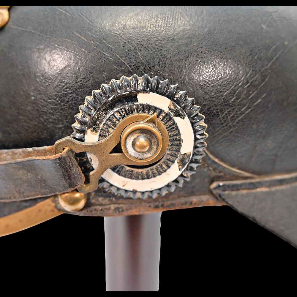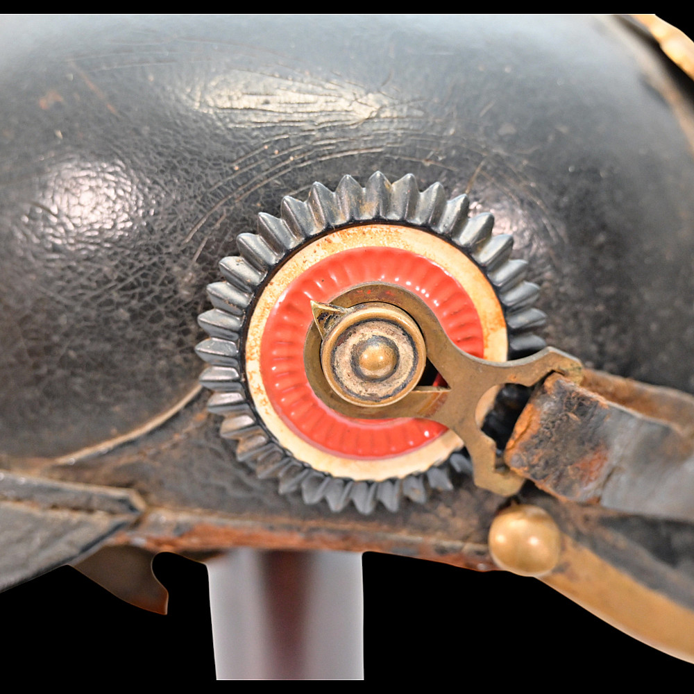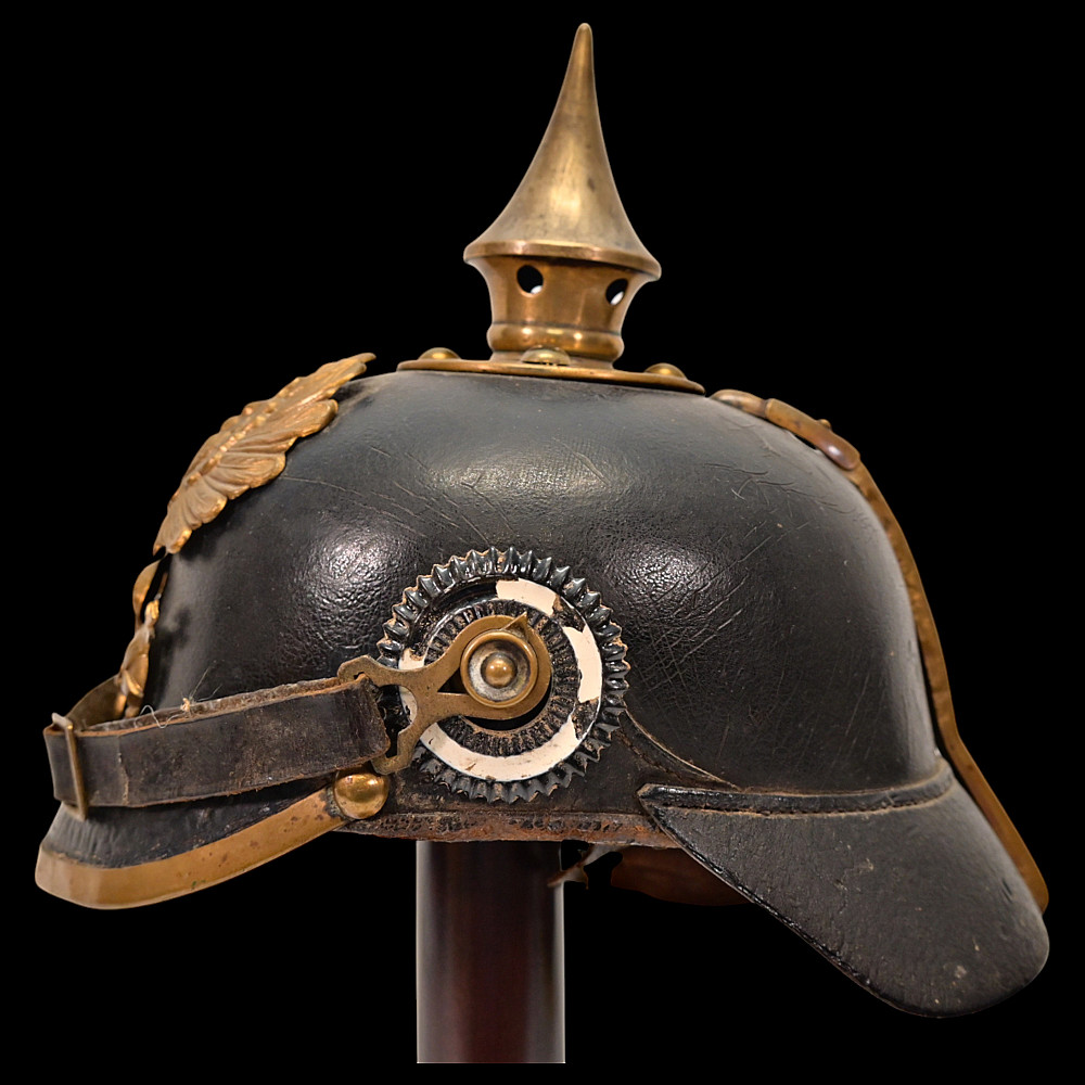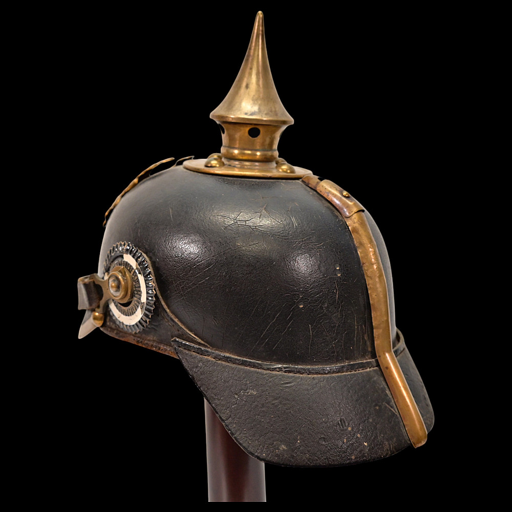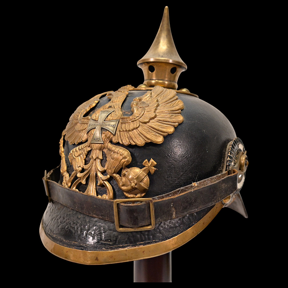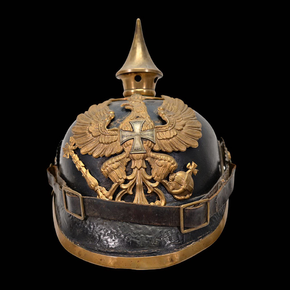 Imperial German Model 1895 Prussian Reservist Pickelhaube Helmet, Reserve Infantry Regiment No 28. An authentic Model 1895 Prussian enlisted man’s Pickelhaube (spiked helmet), issued to a Reservist of the Imperial German Army during World War I. Constructed from black lacquered leather with brass fittings, including the spike, front plate, trim, and chinstrap fittings. The large Prussian eagle (Wappen) dominates the front, finely detailed and clutching scepter and orb, bearing on its breast a nickel-silver reserve cross inscribed “Mit Gott fur Konig und Vaterland – 1813” (“With God for King and Fatherland – 1813”), identifying this example as a reservist issue. Both original side cockades are present: the national red-white-black on the right and the Prussian black-and-white on the left, secured by the original black leather chinstrap. The interior retains its original brown leather liner, showing age. The rear visor is faintly unit-stamped “RIR 28” (Reserve Infantry Regiment No. 28). A genuine and well-preserved example, representing one of the most iconic pieces of First World War headgear. Condition: Good, complete, with moderate wear, slight damage to side cockade, see photo. All metal fittings with uniform age patina. Height (including spike): approx. 21 cm.
