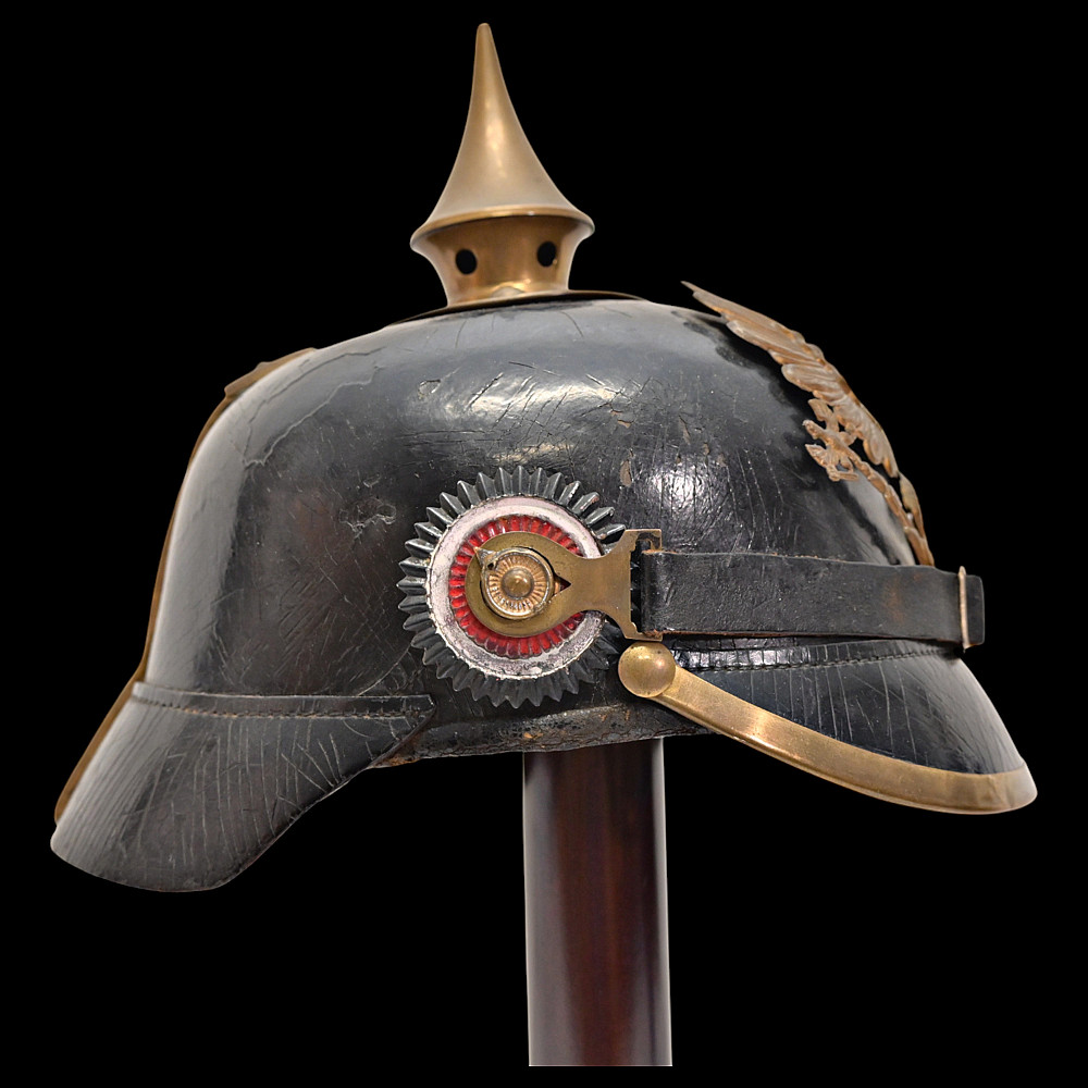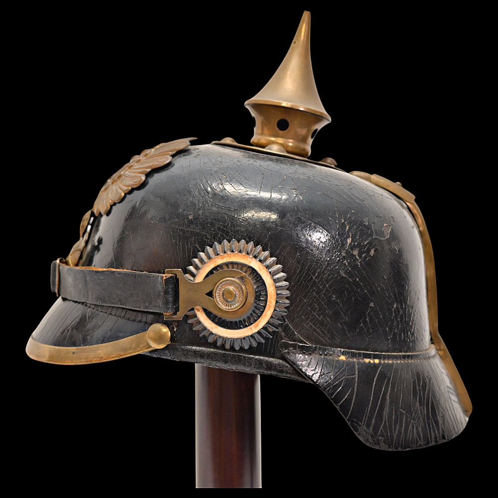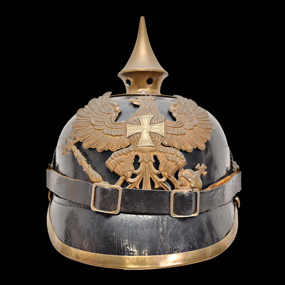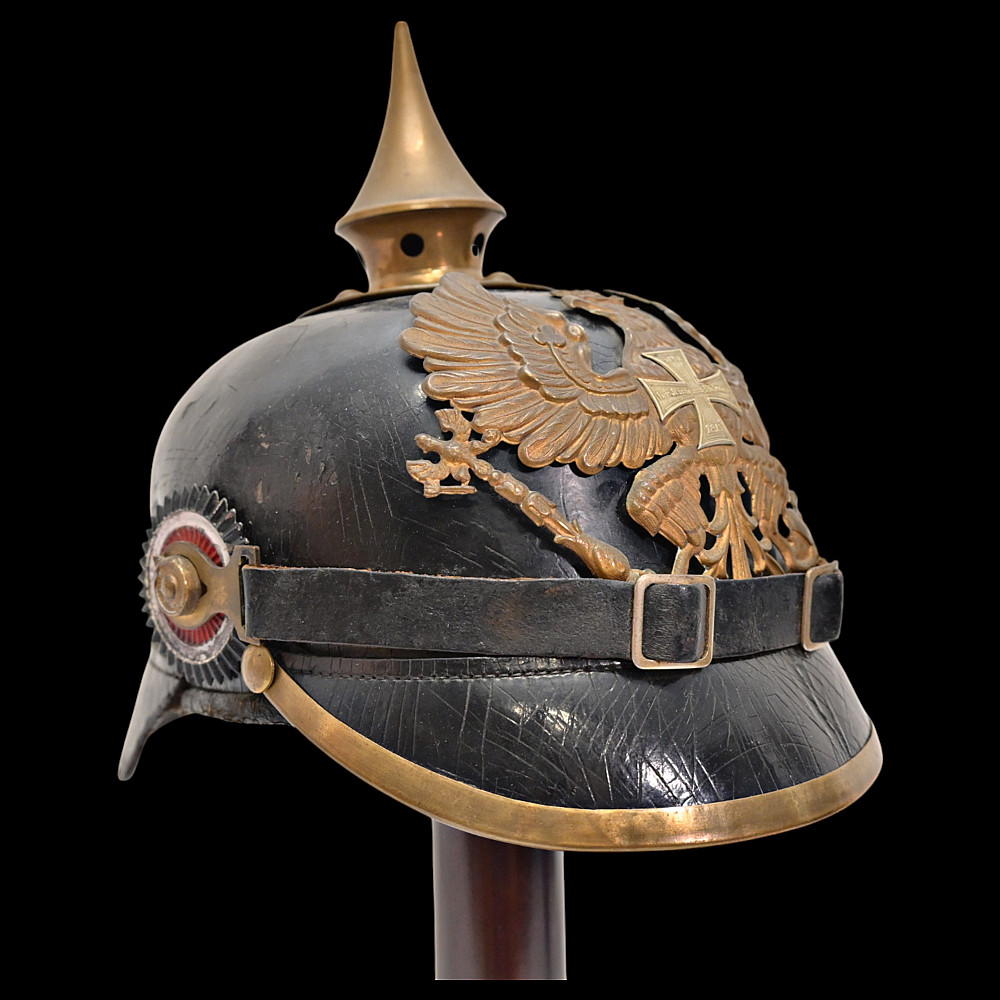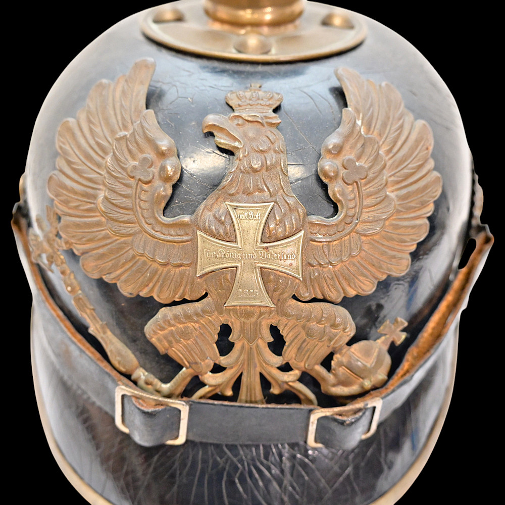 Imperial German Model 1895 Prussian Reservist Pickelhaube Helmet. An authentic Model 1895 Prussian Reservist spiked helmet (Pickelhaube) for enlisted men, complete with brass fittings and fine details characteristic of Imperial craftsmanship. The black lacquered leather body retains its original brass spike, trim, and front plate (Wappen) featuring the large Prussian eagle clutching scepter and orb, with the Iron Cross reserve emblem at its chest, inscribed “Mit Gott für König und Vaterland – 1813” (“With God for King and Fatherland – 1813”). This identifies it as a reservist issue, proudly worn by soldiers who had completed active duty but remained ready for mobilization. Both national and state cockades are present—Prussian black-and-white on the right and national red-white-black on the left—mounted behind the original black leather chinstrap with brass fittings. The interior retains its complete leather liner, showing natural age patina consistent with service use. Condition: Good. Dimensions: Height with spike approx. 21 cm.