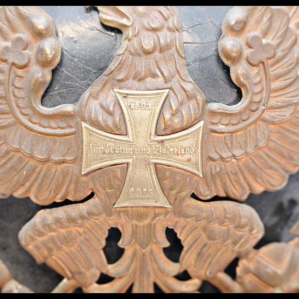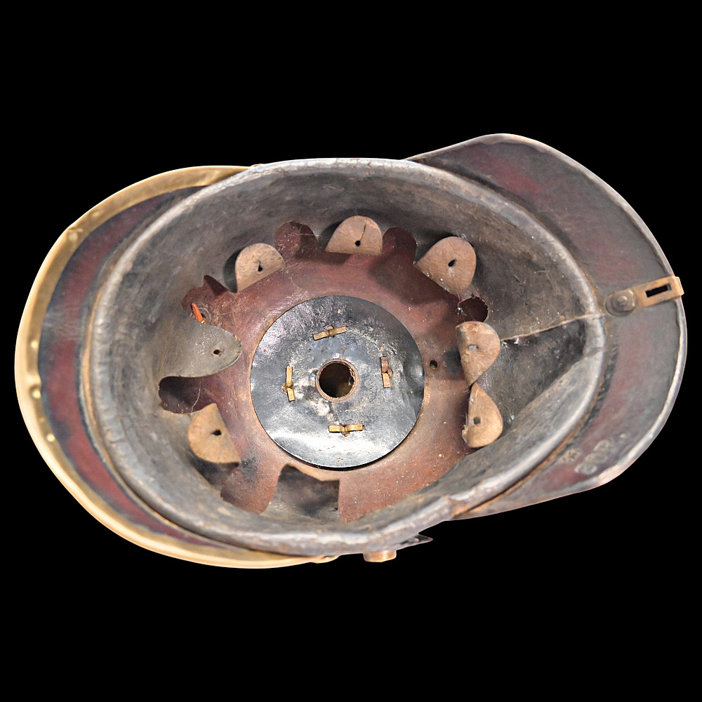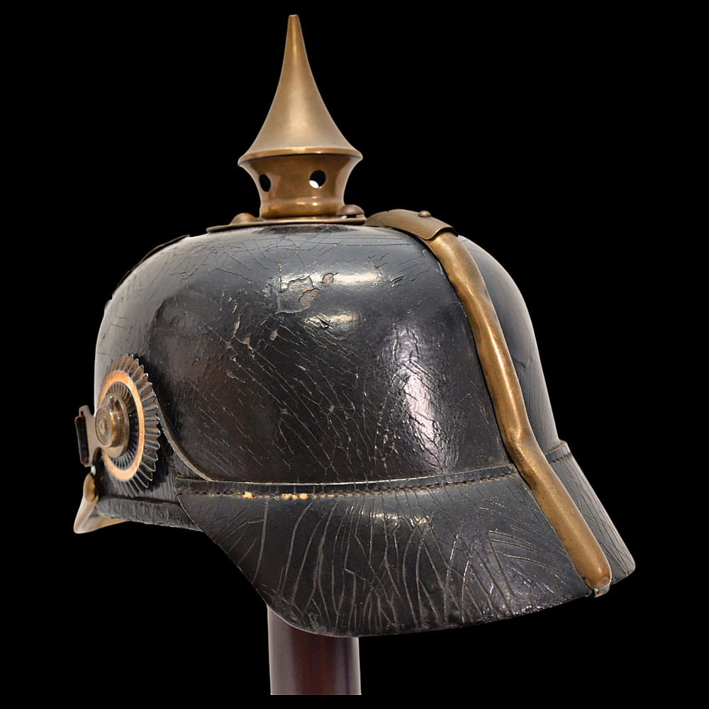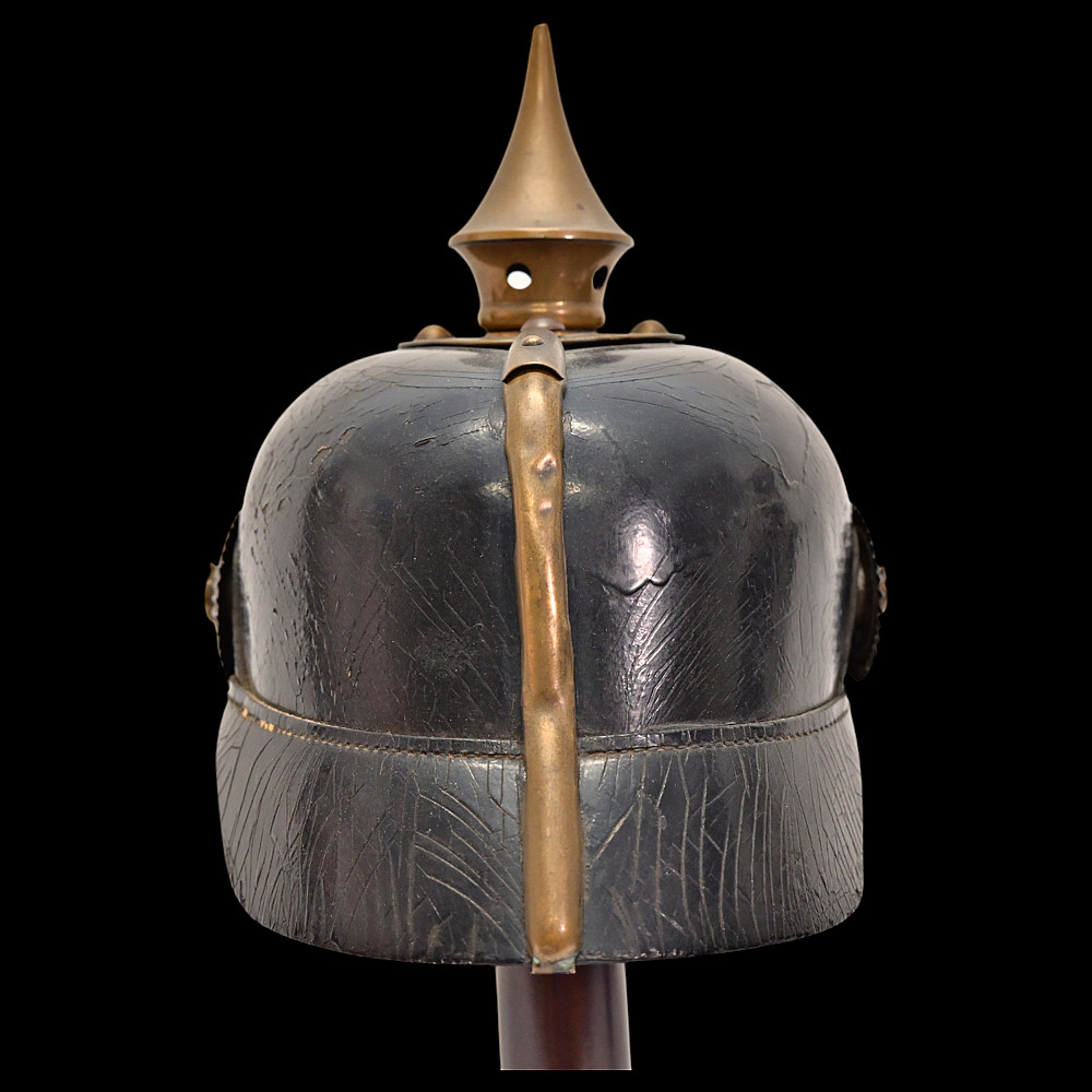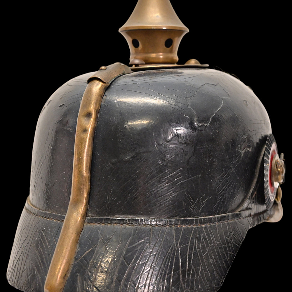 Imperial German Model 1895 Prussian Reservist Pickelhaube Helmet. An authentic Model 1895 Prussian Reservist spiked helmet (Pickelhaube) for enlisted men, complete with brass fittings and fine details characteristic of Imperial craftsmanship. The black lacquered leather body retains its original brass spike, trim, and front plate (Wappen) featuring the large Prussian eagle clutching scepter and orb, with the Iron Cross reserve emblem at its chest, inscribed “Mit Gott für König und Vaterland – 1813” (“With God for King and Fatherland – 1813”). This identifies it as a reservist issue, proudly worn by soldiers who had completed active duty but remained ready for mobilization. Both national and state cockades are present—Prussian black-and-white on the right and national red-white-black on the left—mounted behind the original black leather chinstrap with brass fittings. The interior retains its complete leather liner, showing natural age patina consistent with service use. Condition: Good. Dimensions: Height with spike approx. 21 cm.