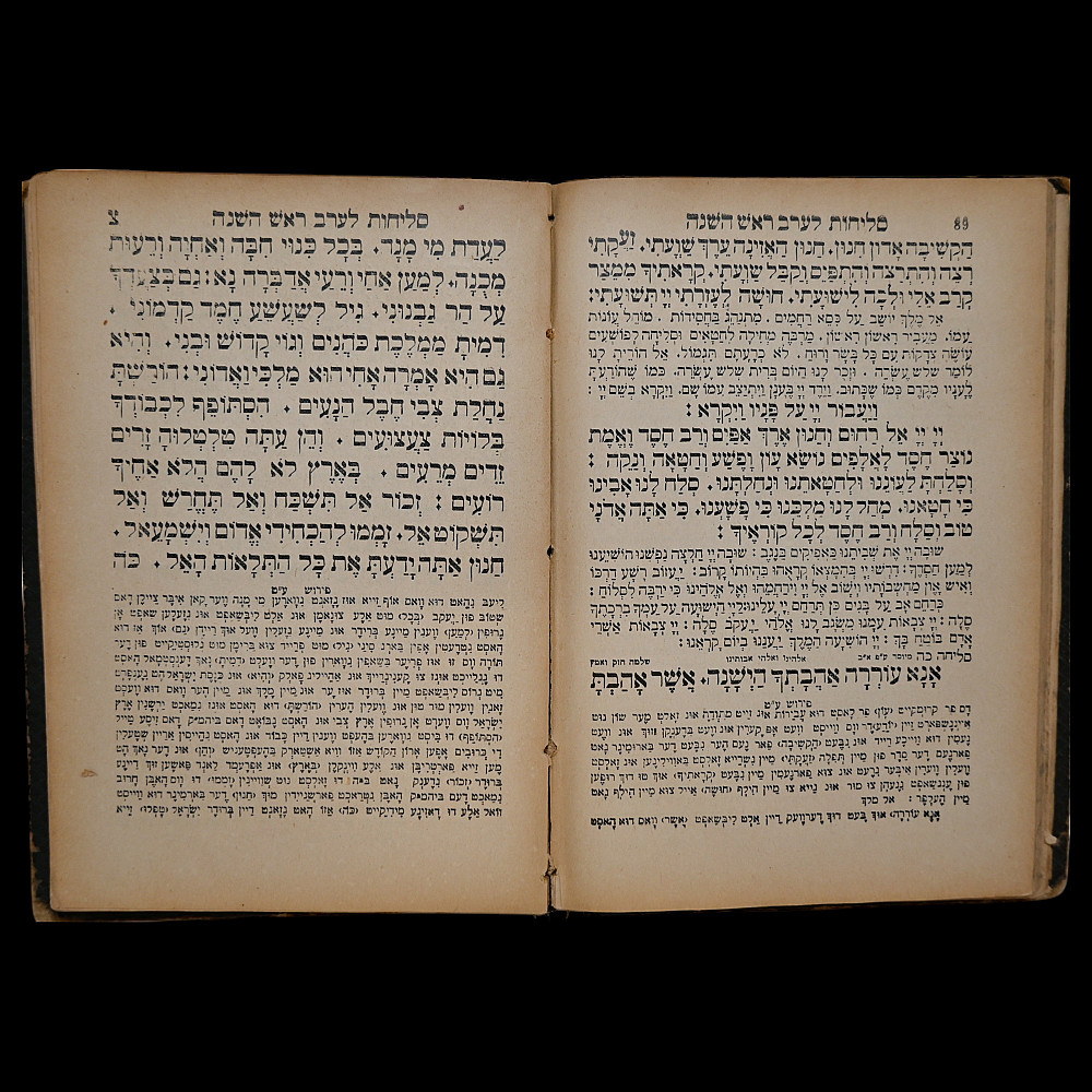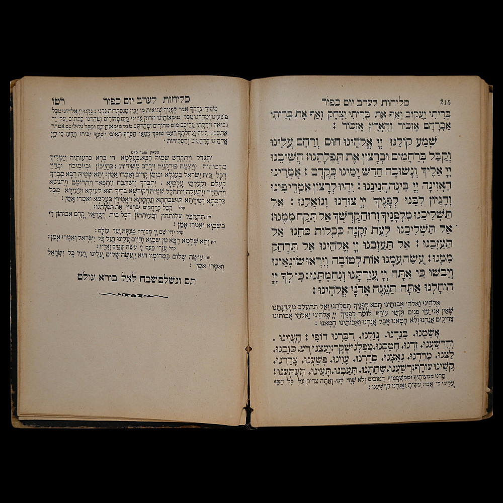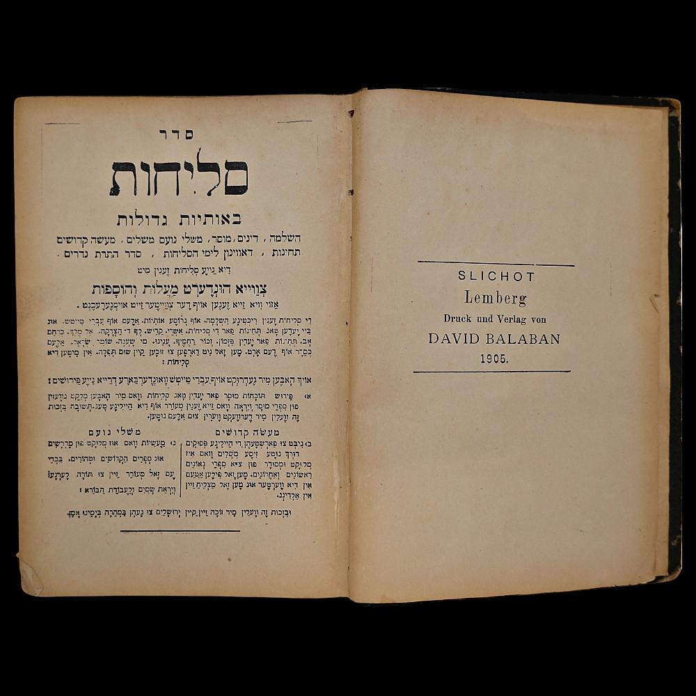 Judaica old Hebrew Book "Seder Selichot", Printed by David Balaban, Lemberg (now Lviv, Ukraine) 1905. An original of the Hebrew prayer book Seder Selichot, printed in Lemberg (now Lviv, Ukraine) by David Balaban in 1905. This volume contains the traditional penitential prayers (Selichot) recited during the High Holy Days and the days leading up to them, including Rosh Hashanah and Yom Kippur. The book is printed in Hebrew script, featuring a decorative title page surrounded by an ornamental border. The interior contains prayers, liturgical poems, and traditional verses used in Ashkenazi Jewish communities, presented in a clear, legible typeface. The accompanying German title page reads: Slichot. Lemberg. Druck und Verlag von David Balaban. 1905. Original black embossed hardcover with period wear. A valuable liturgical and historical artifact from a major center of Jewish publishing in Eastern Europe at the turn of the 20th century. Ideal for collectors of Judaica, rare books, and Hebrew printing. Size 22x16 cm.