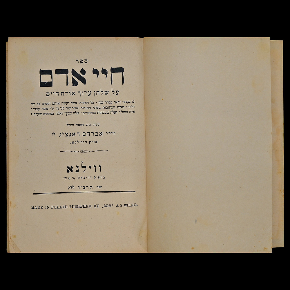 Judaica old Hebrew Book "Sefer Chayei Adam" "Rom" Press, Wilno (Vilna), Poland, Early 20th Century. A rare and complete edition of Sefer Chayei Adam, a foundational halachic work on the Orach Chaim section of the Shulchan Aruch, authored by Rabbi Avraham Danzig (1748–1820). This edition was printed in Vilna (Wilno), Poland, by the renowned publishing house Rom. The Chayei Adam is a classic guide to Jewish daily life and ritual law, particularly focusing on prayer, Sabbath, holidays, and personal conduct, written in a clear and practical style for laypeople. This work played a central role in Jewish halachic education throughout Eastern Europe in the 19th and early 20th centuries. Binding: Original embossed hardcover with decorative emblem. Good condition for age. This is a highly collectible Judaica volume representing the scholarly life of Lithuanian Jewry. Suitable for collectors of rabbinic texts, Eastern European Jewish history, or early 20th-century Hebrew printing. Size 22x16 cm.