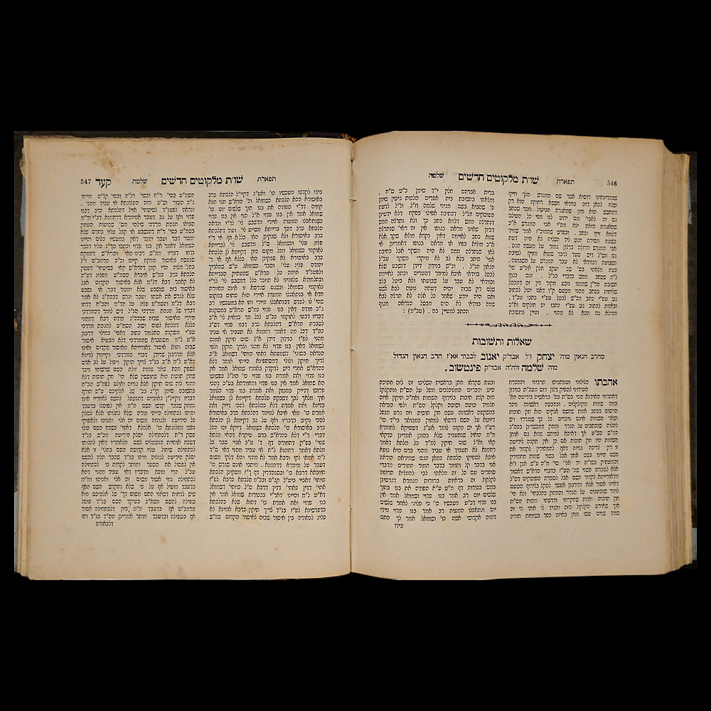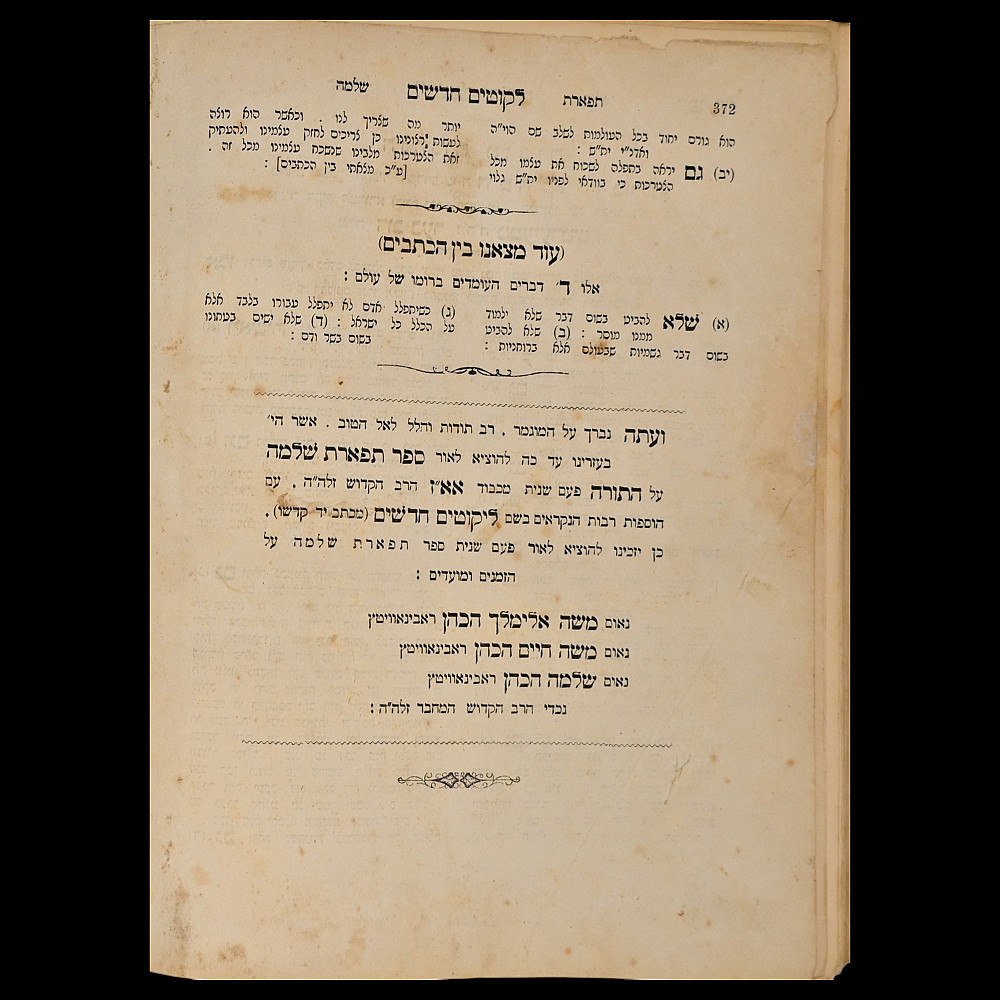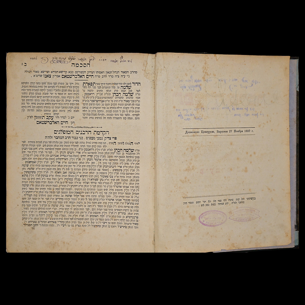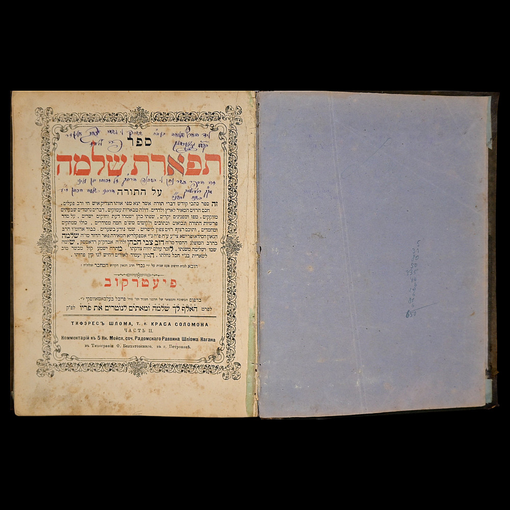 Judaica old Hebrew Book, Tiferet Shelomo, Commentary on the Torah, R. Solomon Rabinowich of Radomsk, Piotrkow 1890. Classic work of Hassidus by R. Solomon ha-Kohen Rabinowich of Radomsk. Printing house of F. Belkhatovsky in Petrokov. Title page with some marginal notations and later ownership descriptions. The volume is bound in a original hardcover with a worn leather spine showing signs of age and wear. R. Solomon ha-Kohen Rabinowich of Radomsk (1803–1866), a hasidic zaddik studied in the yeshivah of Piotrkow under R. Abraham Zevi, author of the responsa Berit Avraham (1819). His father educated him in Hasidism. In 1834 R. Solomon was appointed rabbi of Radomsk, and from 1843 he was accepted as a hasidic rabbi. R. Solomon's teachings were in the spirit of the popular trend of Polish Hasidism. An important piece of Judaica, representing the scholarship and spiritual teachings of the Polish Hasidic tradition in the late 19th century. This work is highly sought after by collectors of rabbinic literature and Jewish history. Minor damage, see photos. Size 27x21cm.