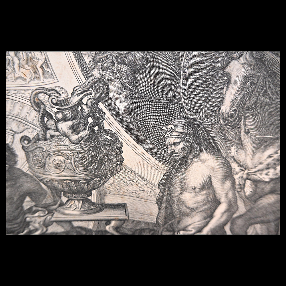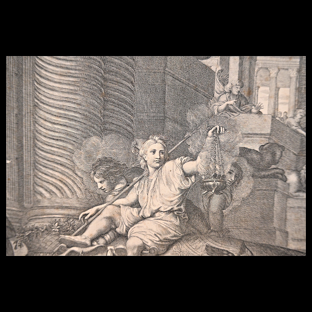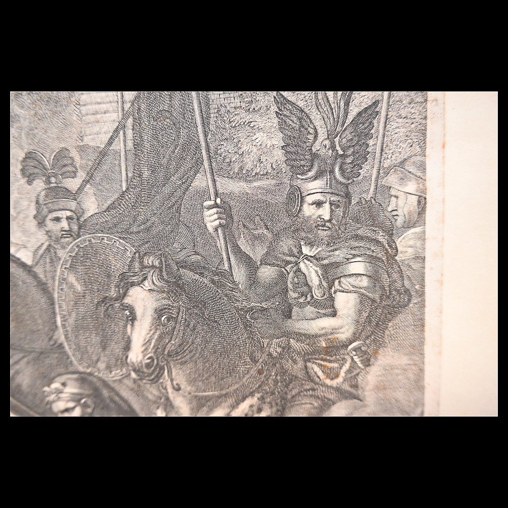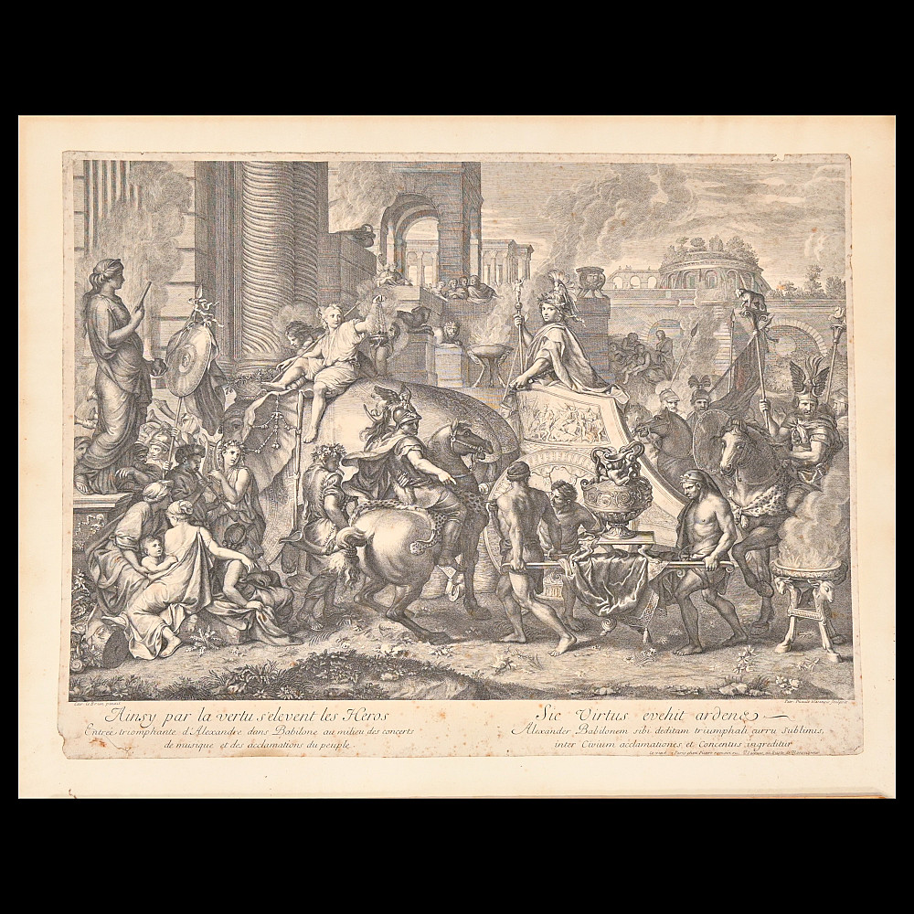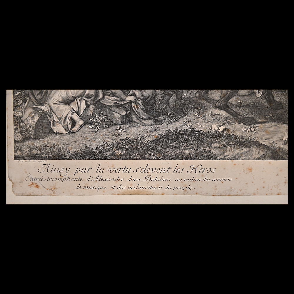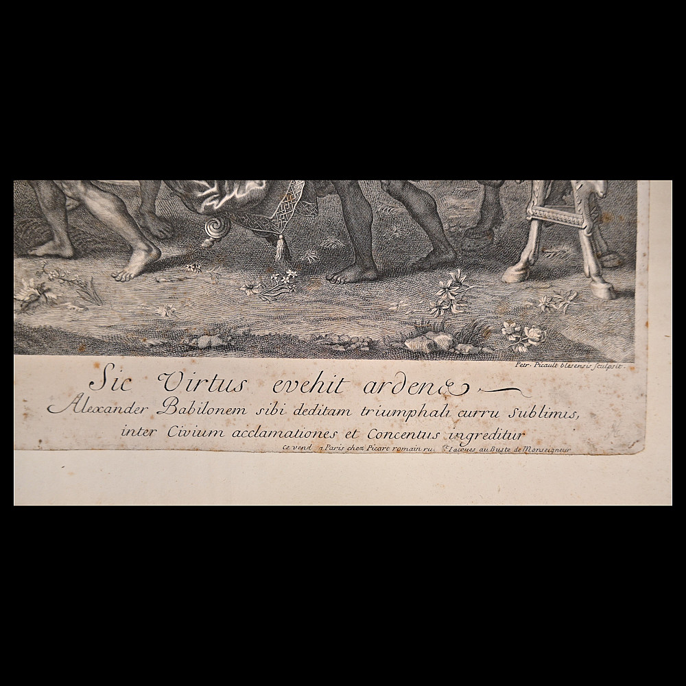 Magnificent, Large, Engraving, Triumphal Entry of Alexander into Babylon, beginning of the 18th century. Engraving by Pierre Picault (1680-1711) and Nicolas Henri Tardieu (1674-1749) after Charles Le Brun (1619-1690). Alexander the Great entered Babylon in 331 BC after defeating the Persian (Achaemenid) empire at the Battle of Gaugamela. He was met with a warm welcome and the city became a major administrative center for his expanding empire. He returned to Babylon in 323 BC, where he later died. A wonderful engraving for collectors and interior decoration. Overall size 47x60 cm.