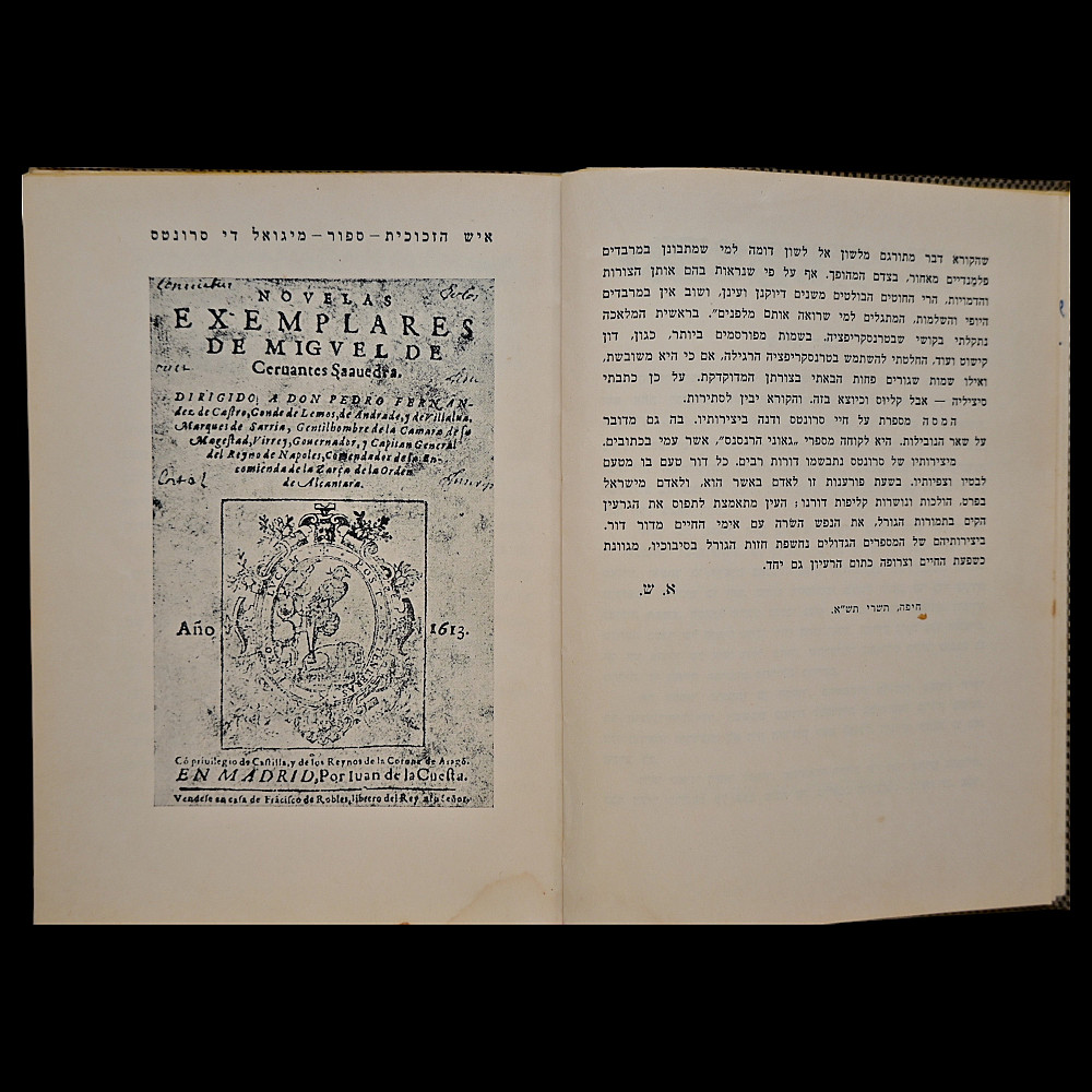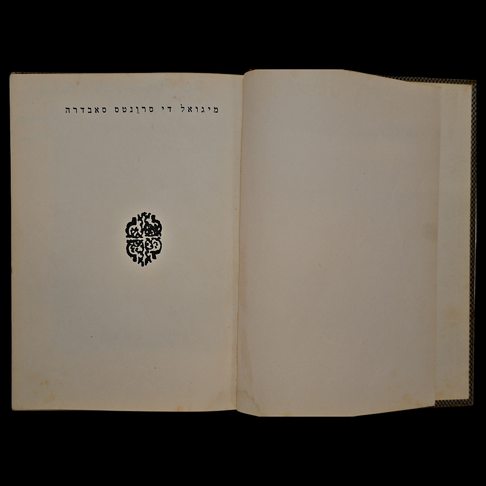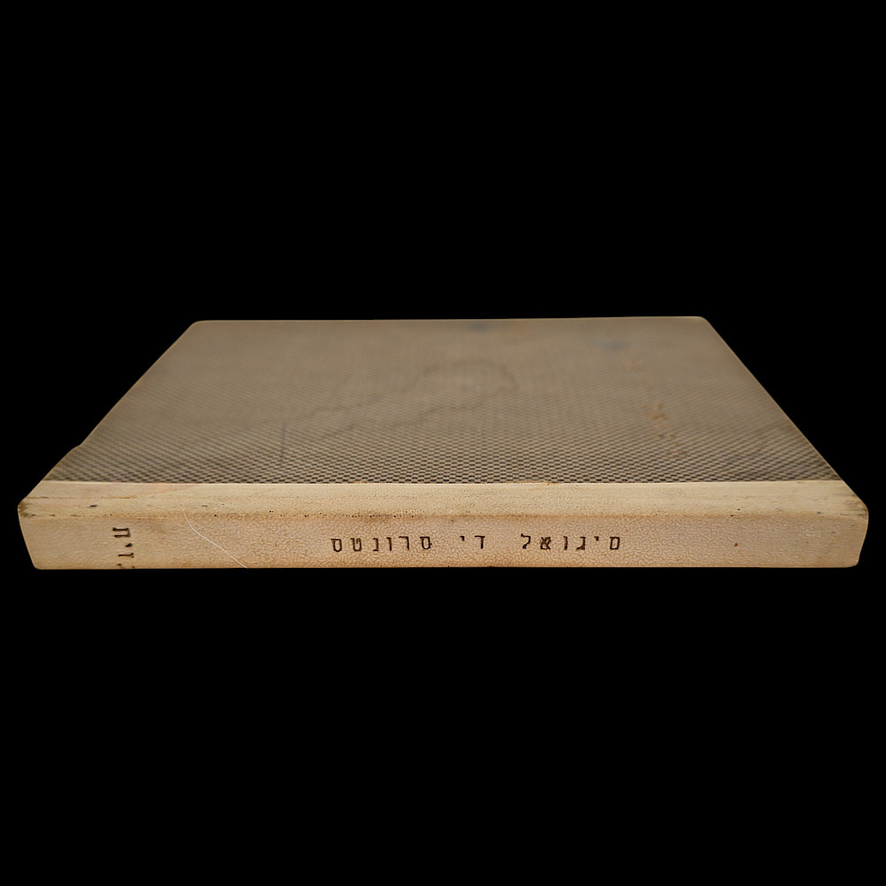 Miguel de Cervantes – "Der Zikorn-Mensch" (The Man of Memory), Yiddish Edition, Tel Aviv, 1940 – With Dedication. A rare Hebrew and Yiddish edition of a story by Miguel de Cervantes, printed by the Gazith publishing house in Tel Aviv in 1940, under the British Mandate of Palestine. This volume is titled in Hebrew and Yiddish and contains an illustrated adaptation of one of Cervantes’ Novelas ejemplares ("Exemplary Novels") translated by Ephraim Shmueli. The book features a printed portrait of Cervantes and an original handwritten dedication in French: "by Edmond Beck for my friend Simon's birthday. 3.7.41, Tel-Aviv" — highlighting its historical and personal significance. Bound in original boards with cloth spine; overall good condition with minor signs of age, including light foxing and wear. A scarce and meaningful piece of Jewish literary history and a testament to the cultural exchange and intellectual engagement of the early Yishuv period in Palestine. Dimensions: approx. 17×13 cm