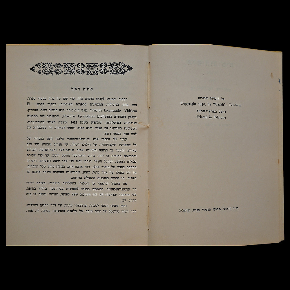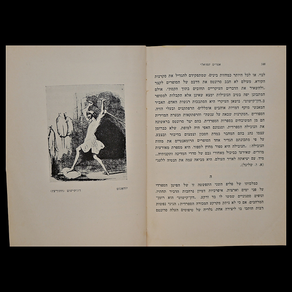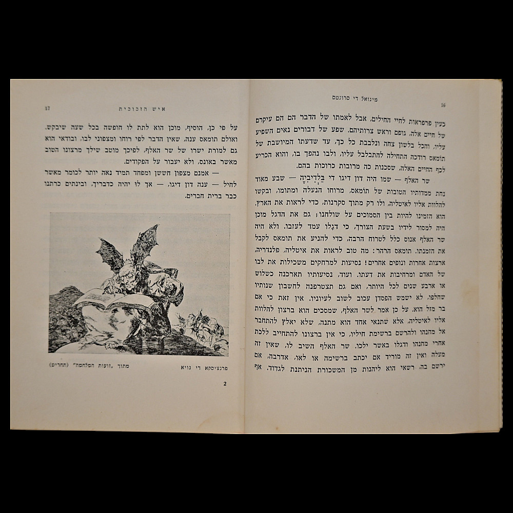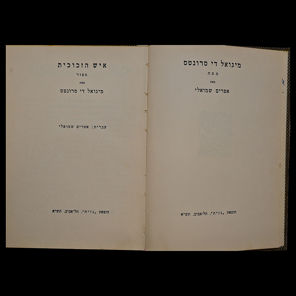 Miguel de Cervantes – "Der Zikorn-Mensch" (The Man of Memory), Yiddish Edition, Tel Aviv, 1940 – With Dedication. A rare Hebrew and Yiddish edition of a story by Miguel de Cervantes, printed by the Gazith publishing house in Tel Aviv in 1940, under the British Mandate of Palestine. This volume is titled in Hebrew and Yiddish and contains an illustrated adaptation of one of Cervantes’ Novelas ejemplares ("Exemplary Novels") translated by Ephraim Shmueli. The book features a printed portrait of Cervantes and an original handwritten dedication in French: "by Edmond Beck for my friend Simon's birthday. 3.7.41, Tel-Aviv" — highlighting its historical and personal significance. Bound in original boards with cloth spine; overall good condition with minor signs of age, including light foxing and wear. A scarce and meaningful piece of Jewish literary history and a testament to the cultural exchange and intellectual engagement of the early Yishuv period in Palestine. Dimensions: approx. 17×13 cm