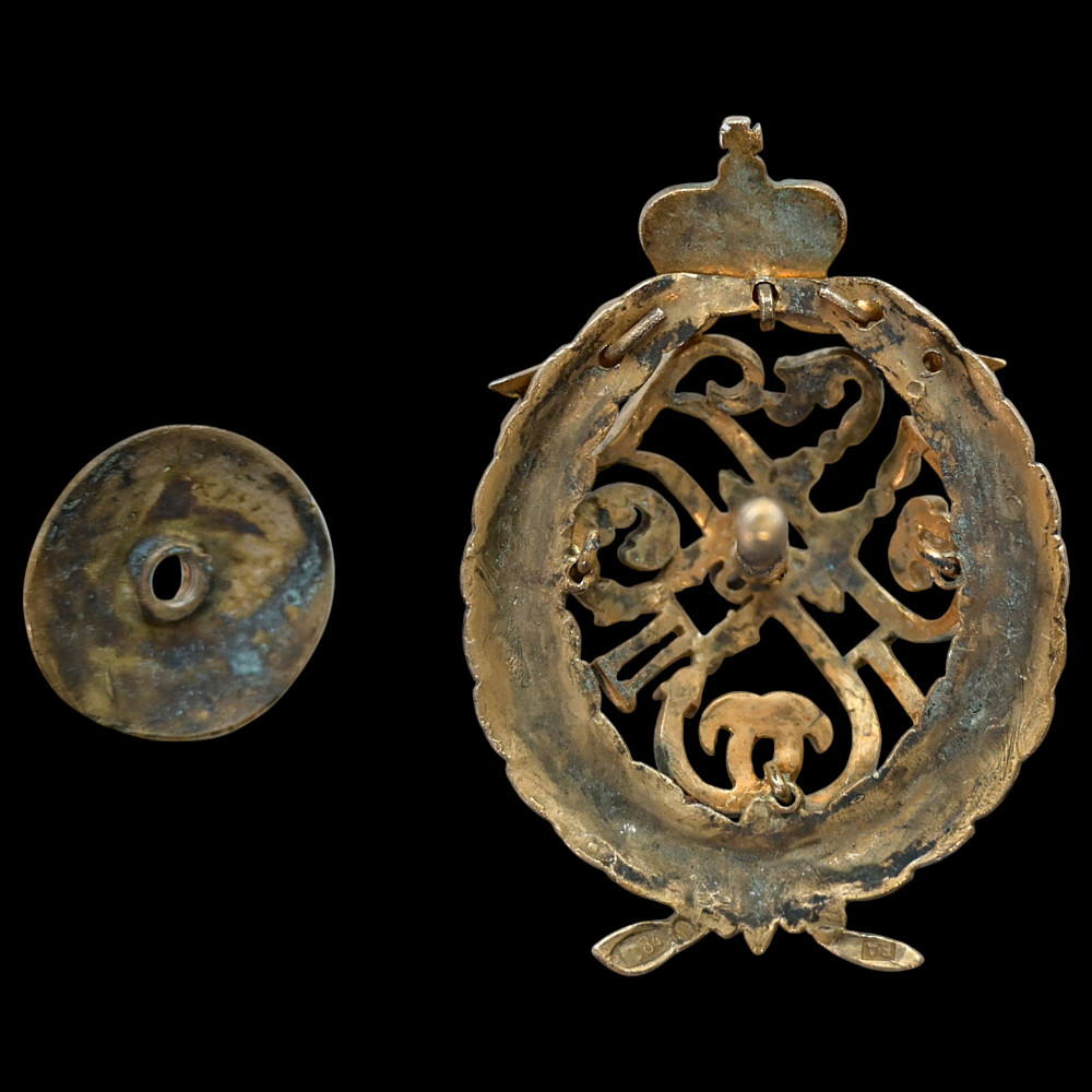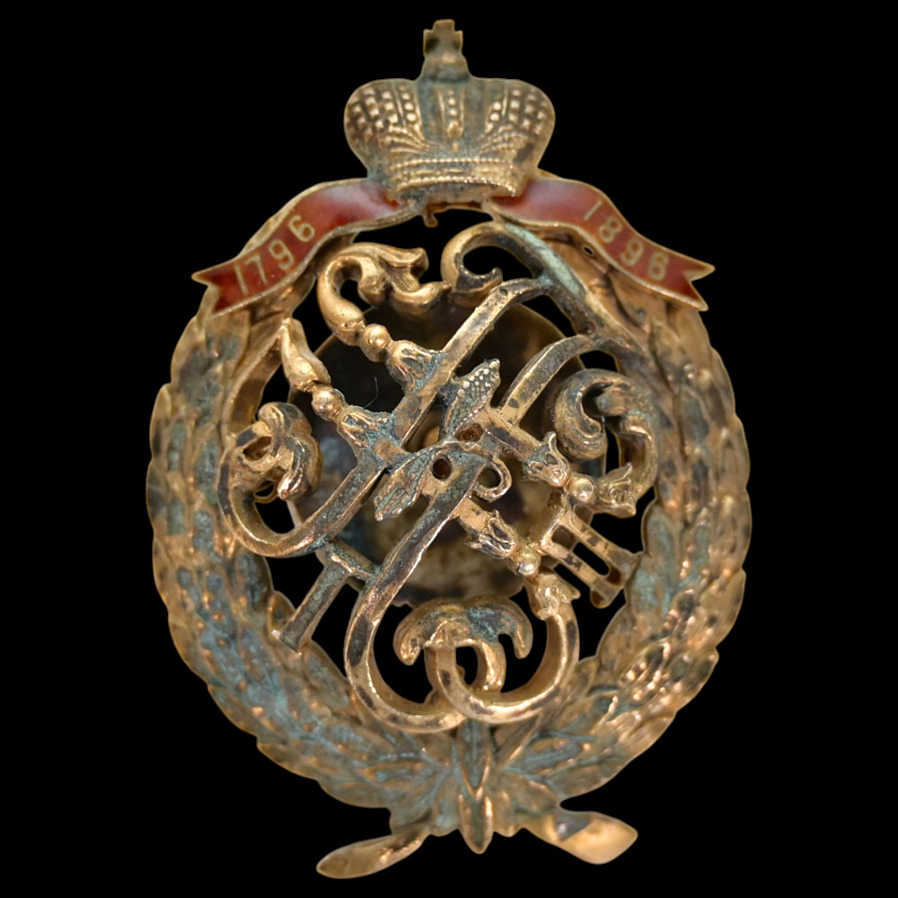Officer’s Badge of the 67th Tarutinsky Infantry Regiment, Russia. An elegant and rare officer’s regimental badge of the 67th Tarutinsky Infantry Regiment, commemorating the regiment’s centenary (1796–1896) during the reign of Emperor Nicholas II. The badge is crafted as an openwork monogram “A I” and “H II” (for Emperor Alexander I and Emperor Nicholas II). Crossed standards, encircled by a laurel and oak wreath symbolizing glory and valor, surmounted by the Imperial crown and a red-enamel ribbon inscribed “1796–1896.” A highly collectible Imperial Russian regimental badge, representing one of the historic infantry units of the Russian Imperial Army. Good condition. Height: 5 cm.