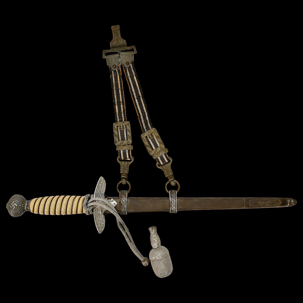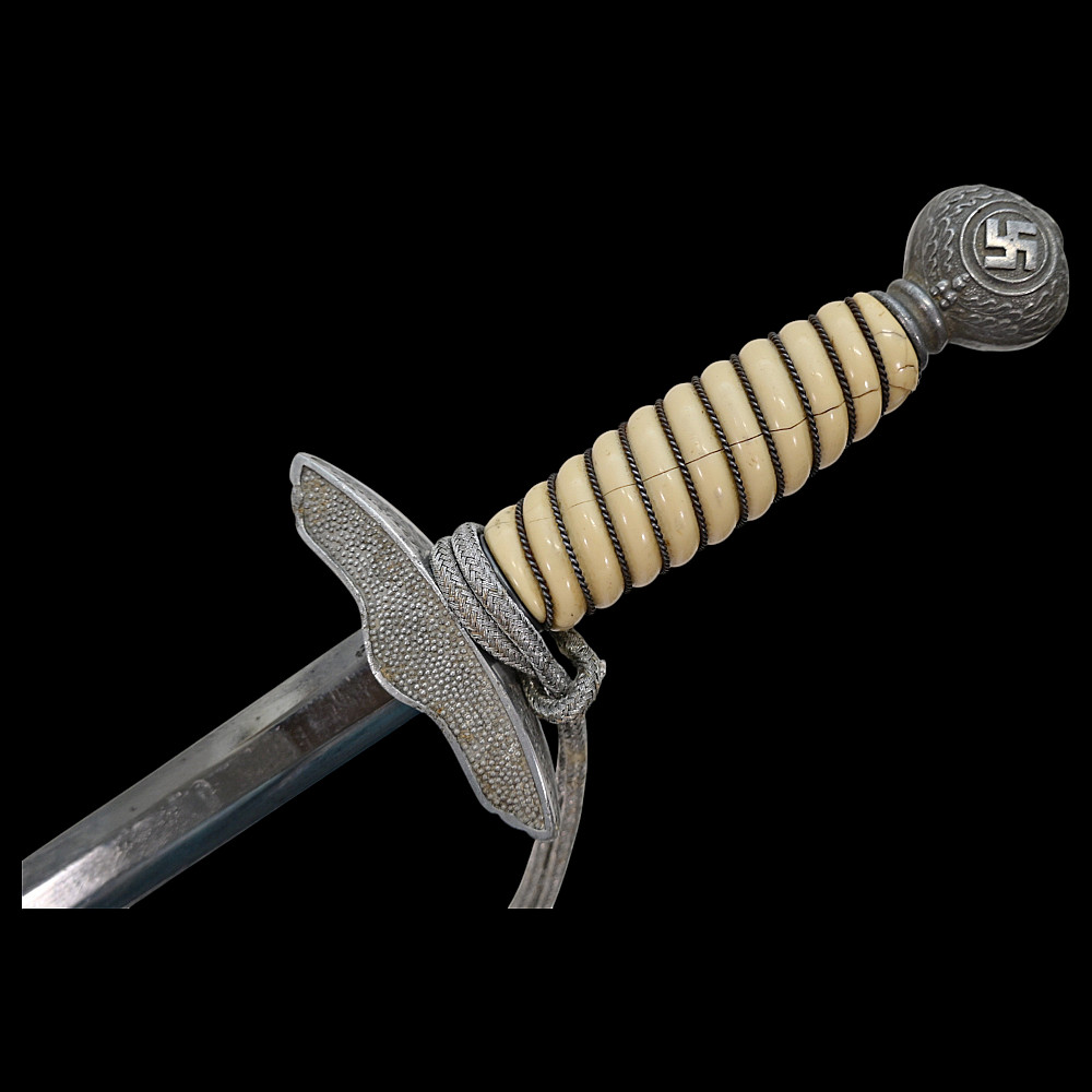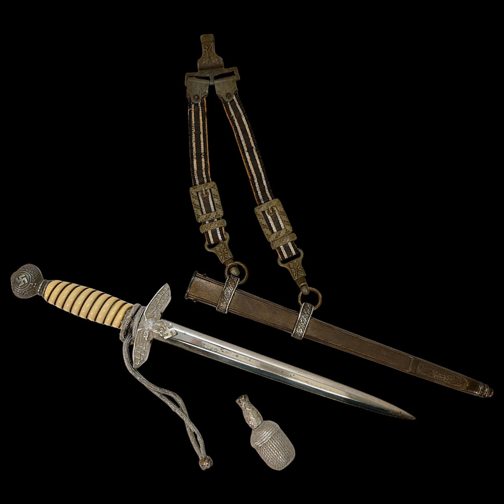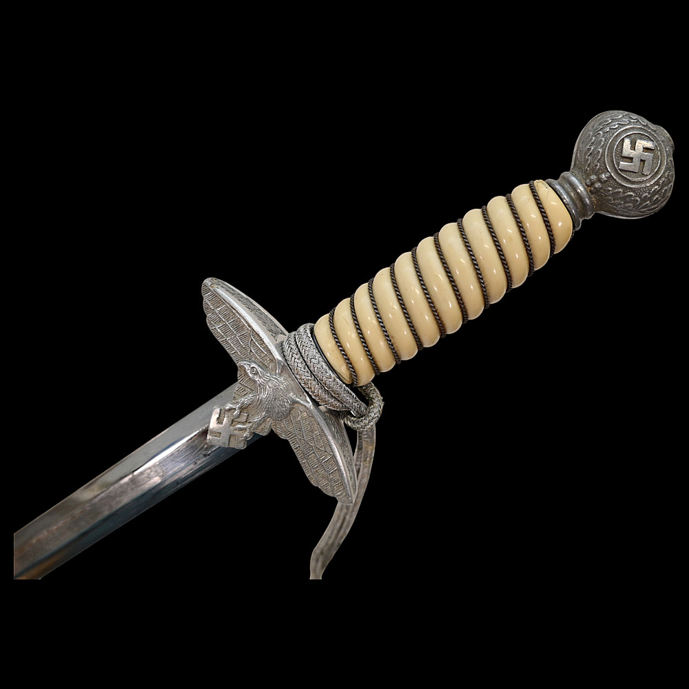 Original WWII German Luftwaffe Officer's Dress Dagger (2nd Model), circa 1937–1945. A regulation Luftwaffe officer’s dagger, second pattern (Luftwaffendolch, 2. Modell), complete with its original scabbard, silver bullion portepee, and hangars (suspension straps). The hilt features an ivory-colored celluloid grip with spiral grooves, bound by twisted wire. The crossguard depicts the Luftwaffe eagle with outstretched wings, finely cast and detailed, clutching a swastika (the national emblem used at the time). The pommel bears the same emblem within oak-leaf borders, with a matte finish. The blade is bright and double-edged, remains well-preserved, showing minor oxidation typical of age. The scabbard, of alloy, retains its mounts and two suspension rings, decorated with oak-leaf reliefs. The hangers are of woven fabric with silver/aluminum bullion stripes on a dark background, backed with velvet, fitted with decorative oak-leaf buckles and clips stamped D.R.G.M. (Deutsches Reichsgebrauchsmuster - registered design). The lanyard is damaged, see photo. This pattern was introduced in 1937 to replace the heavier first model and remained the standard ceremonial weapon for Luftwaffe officers throughout the Second World War. The present example retains all its period accessories and is a representative and complete example of the type. Dimensions: Total length: approx. 43 cm. Condition: Good. Suspension straps show moderate wear to velvet backing. The lanyard is damaged.