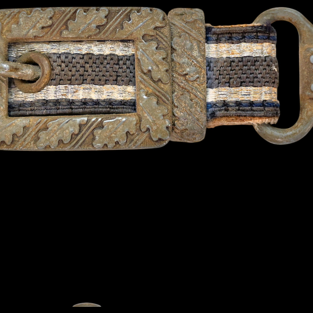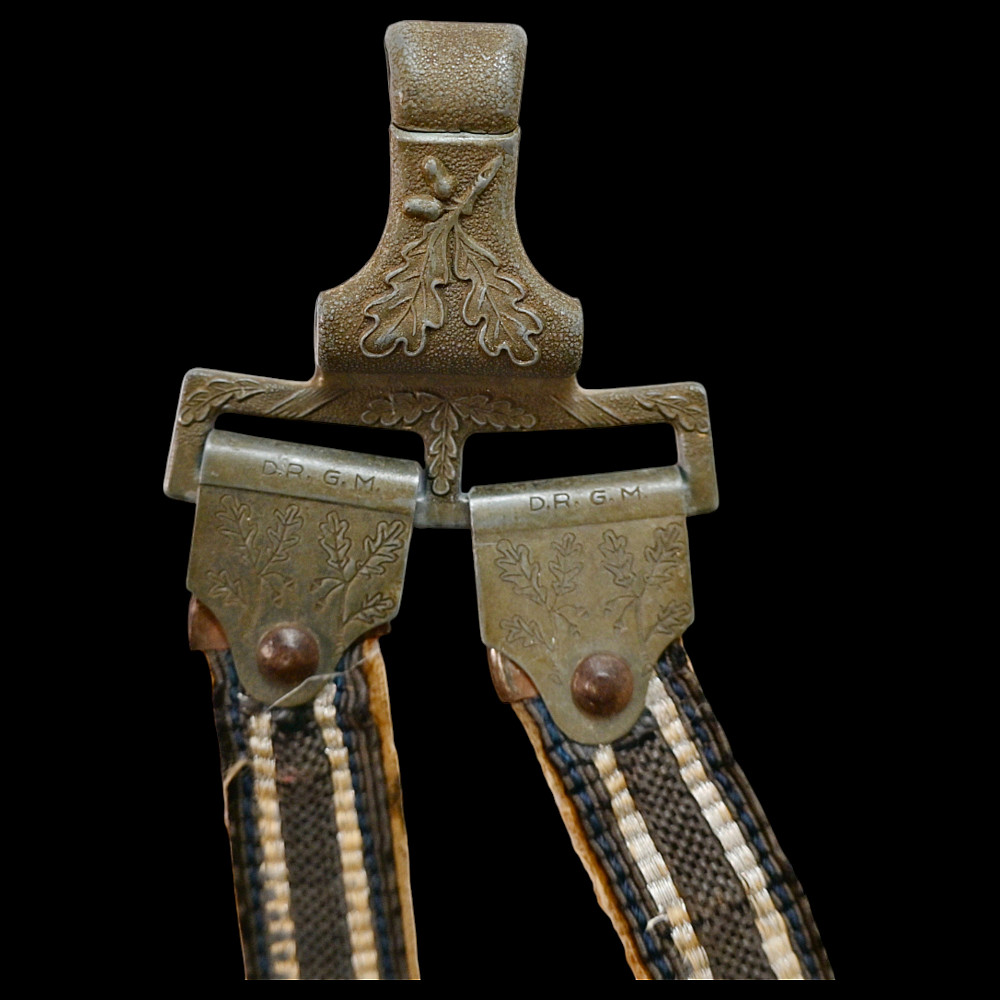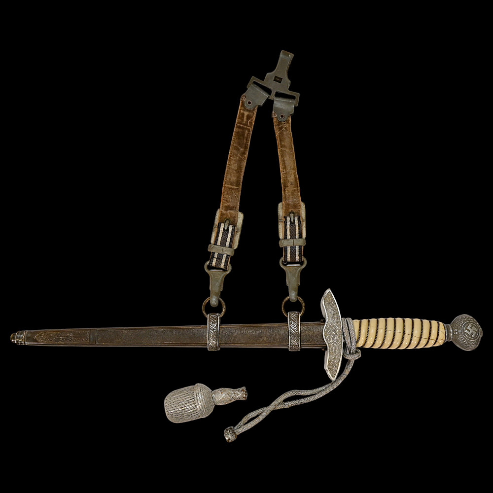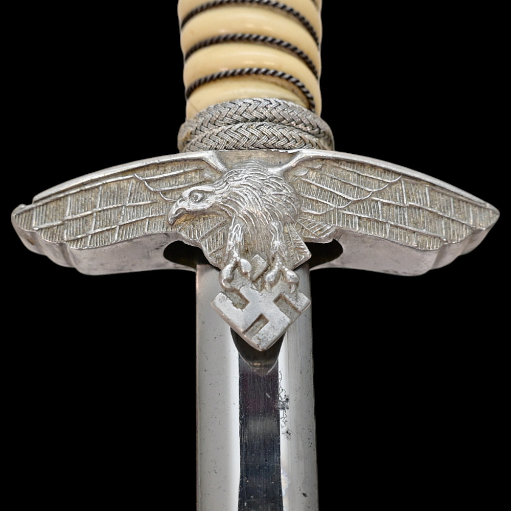 Original WWII German Luftwaffe Officer's Dress Dagger (2nd Model), circa 1937–1945. A regulation Luftwaffe officer’s dagger, second pattern (Luftwaffendolch, 2. Modell), complete with its original scabbard, silver bullion portepee, and hangars (suspension straps). The hilt features an ivory-colored celluloid grip with spiral grooves, bound by twisted wire. The crossguard depicts the Luftwaffe eagle with outstretched wings, finely cast and detailed, clutching a swastika (the national emblem used at the time). The pommel bears the same emblem within oak-leaf borders, with a matte finish. The blade is bright and double-edged, remains well-preserved, showing minor oxidation typical of age. The scabbard, of alloy, retains its mounts and two suspension rings, decorated with oak-leaf reliefs. The hangers are of woven fabric with silver/aluminum bullion stripes on a dark background, backed with velvet, fitted with decorative oak-leaf buckles and clips stamped D.R.G.M. (Deutsches Reichsgebrauchsmuster - registered design). The lanyard is damaged, see photo. This pattern was introduced in 1937 to replace the heavier first model and remained the standard ceremonial weapon for Luftwaffe officers throughout the Second World War. The present example retains all its period accessories and is a representative and complete example of the type. Dimensions: Total length: approx. 43 cm. Condition: Good. Suspension straps show moderate wear to velvet backing. The lanyard is damaged.