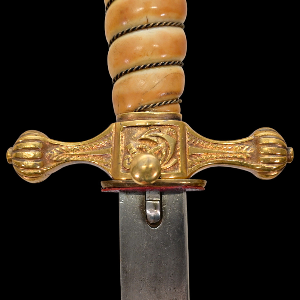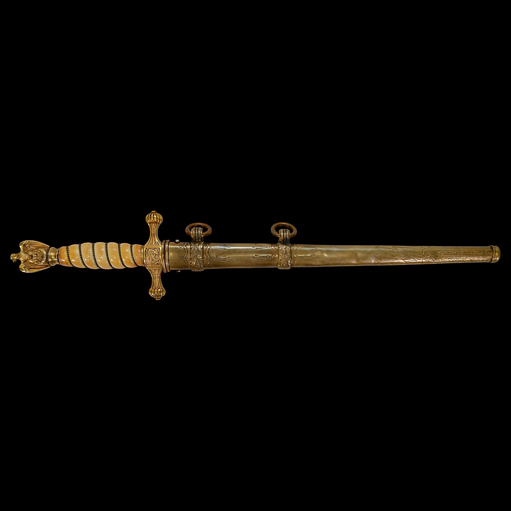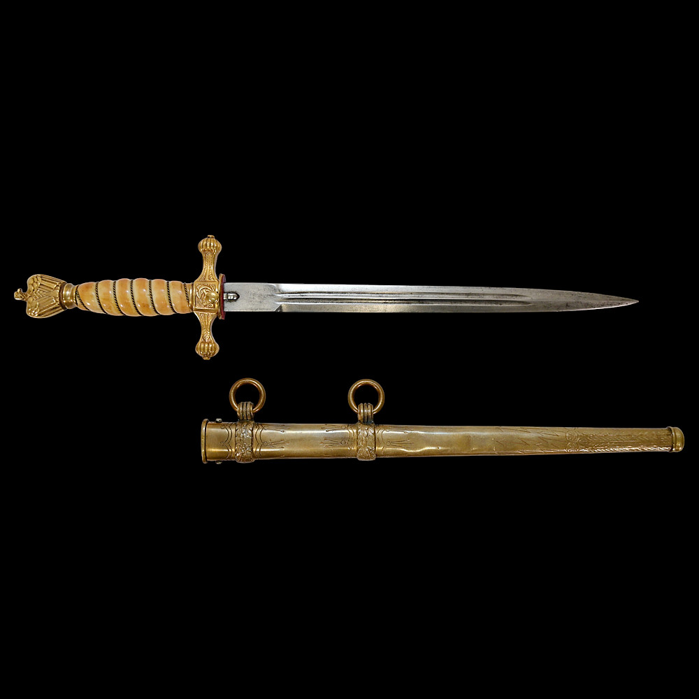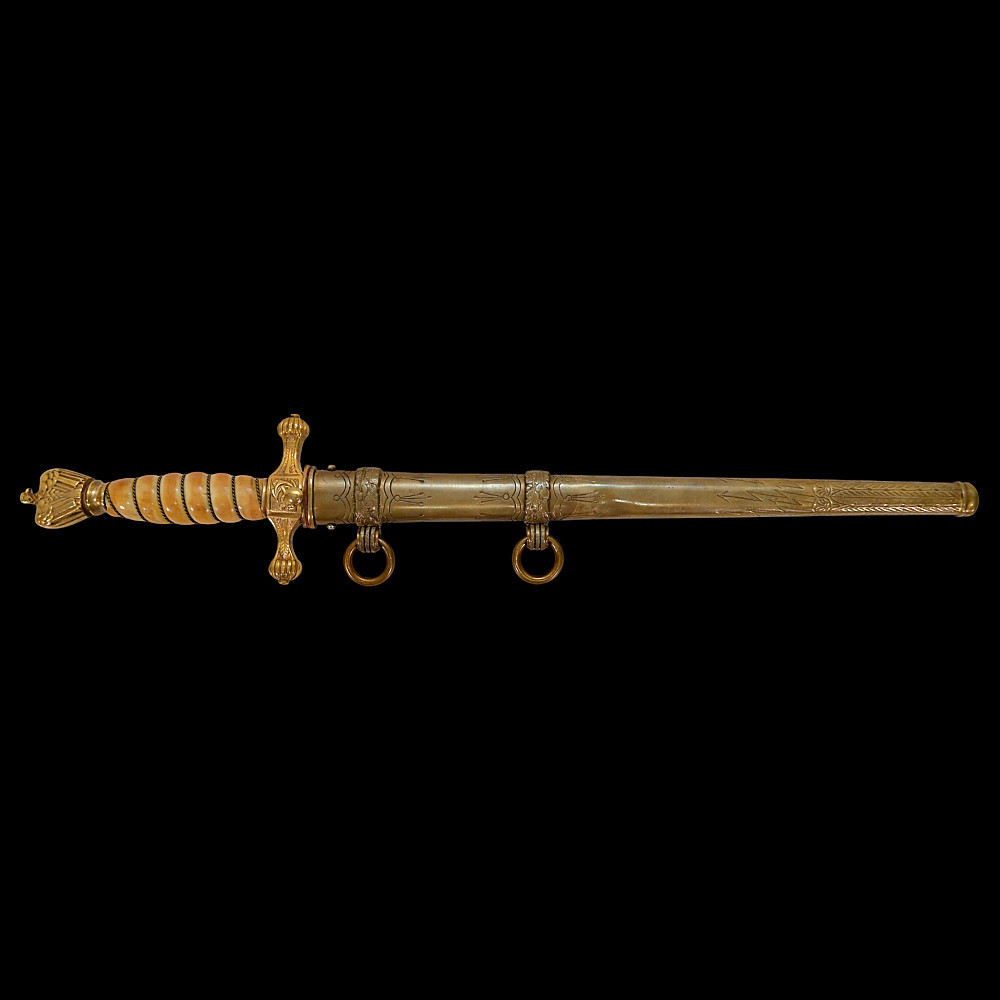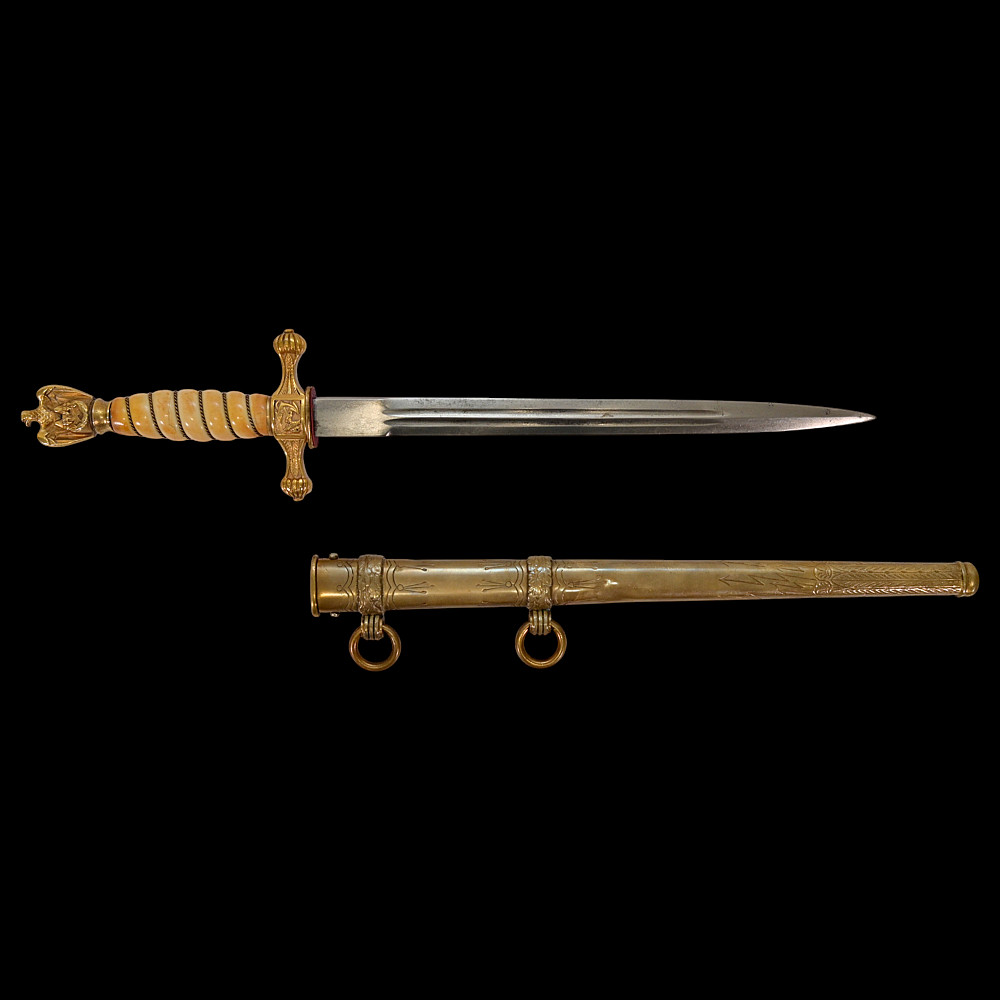 Original WWII German, Naval Officer's Dress Dagger (Kriegsmarine), circa 1938–1944. A regulation Kriegsmarine officer’s dagger (Dolch für Offiziere der Kriegsmarine), complete with its original brass scabbard. The hilt features a twisted celluloid grip in imitation of ivory, bound with brass wire, terminating in a pommel cast as a spread-winged eagle. The crossguard bears the anchor motif within a roped border, typical of naval symbolism. The double-edged blade, of polished steel, displays twin fullers and remains in very good condition with minor oxidation consistent with age. The scabbard is finely engraved with oak-leaf and marine motifs, fitted with two suspension rings for uniform wear. Such daggers were carried by commissioned officers of the Kriegsmarine (German Navy) as part of their dress uniform from 1938 onward. A fine and complete example of the Third Reich naval officer’s dress dagger, illustrating the ornate ceremonial tradition of the German Navy before and during the Second World War. Condition: Good. Length 41.5 cm.