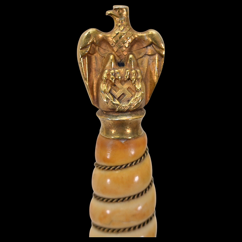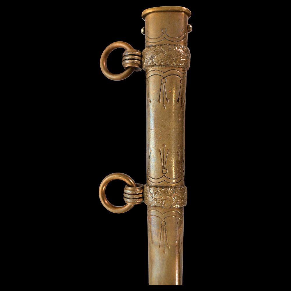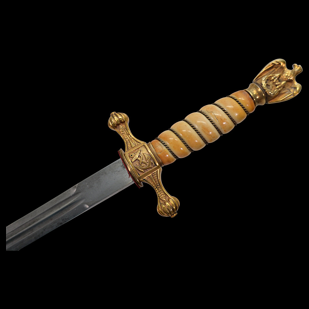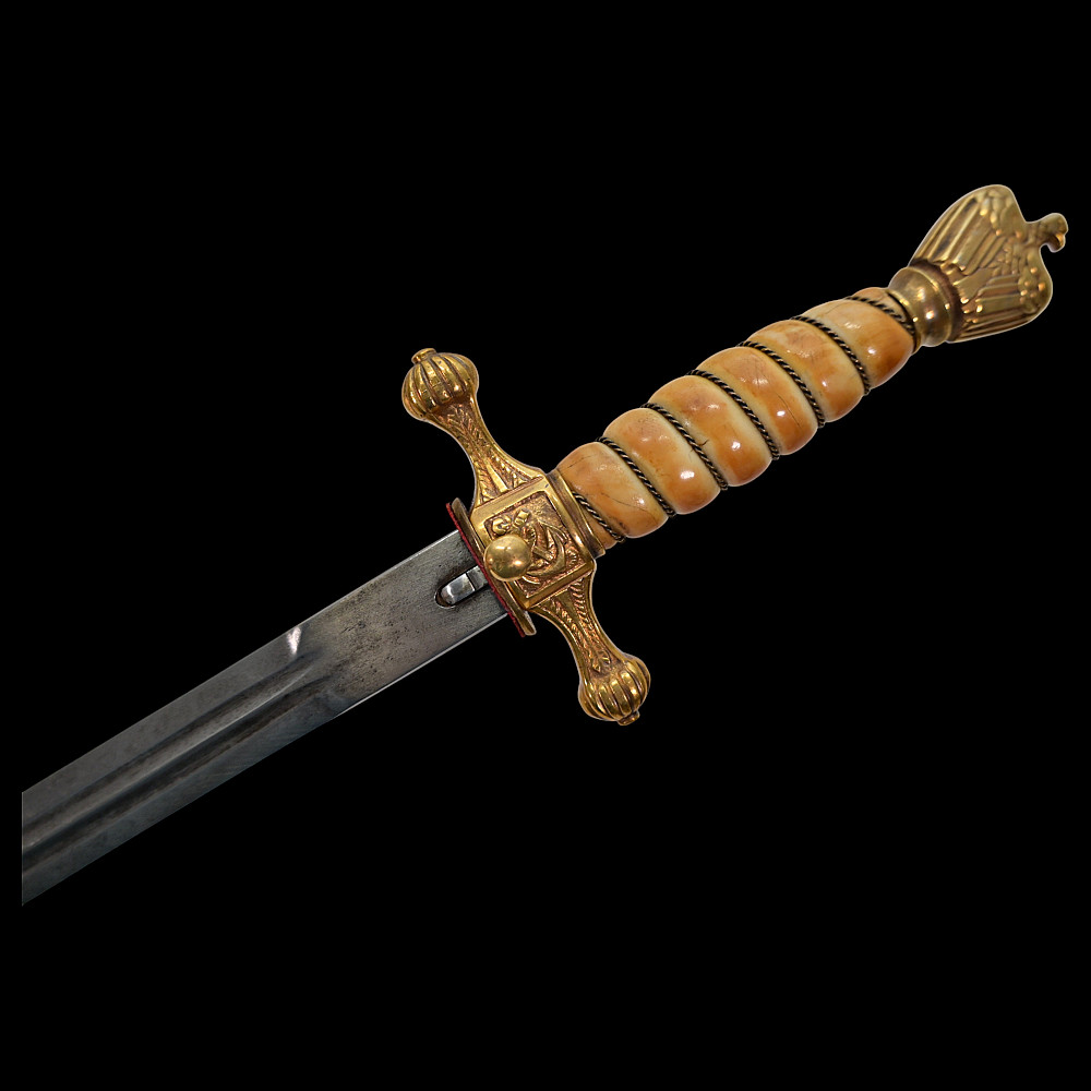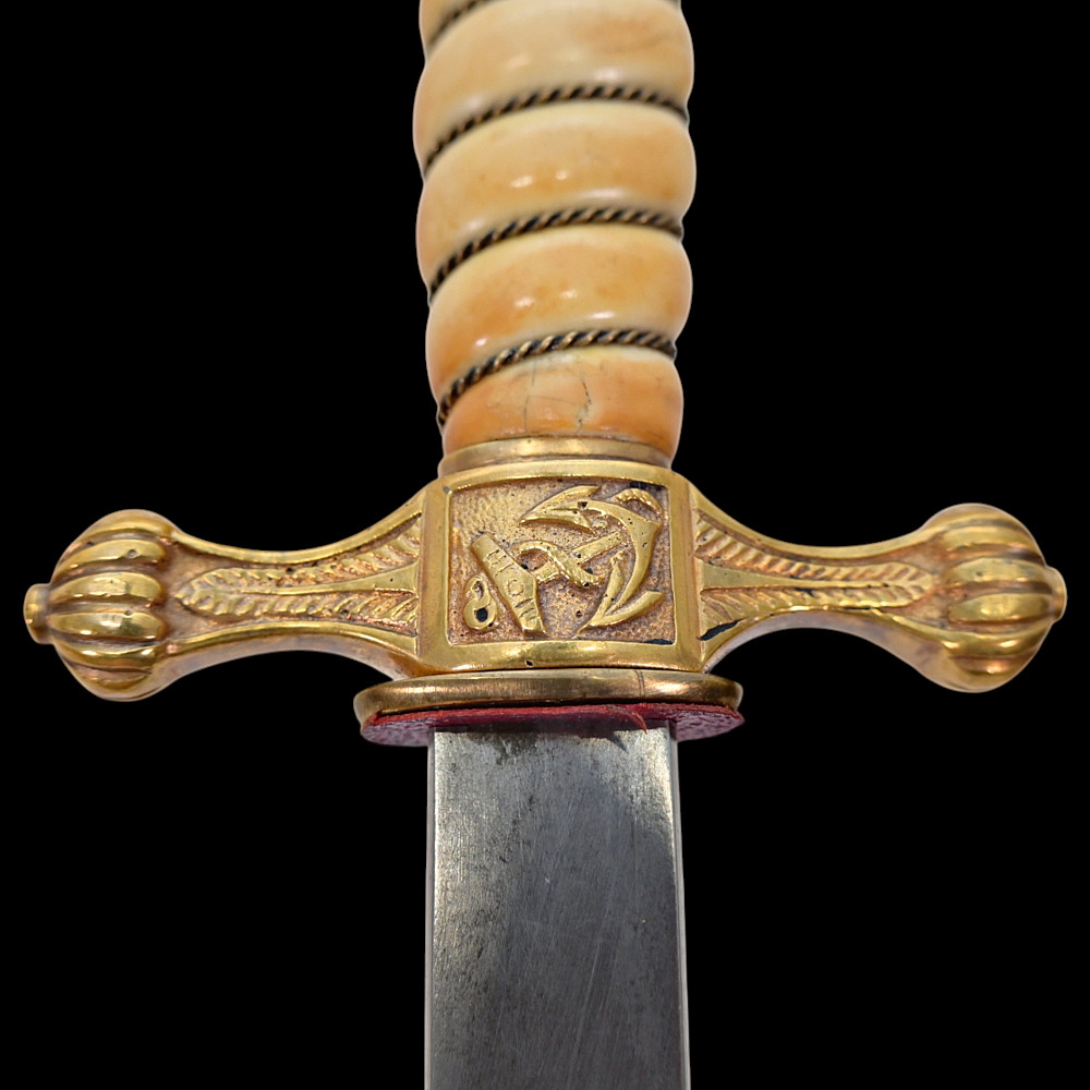 Original WWII German, Naval Officer's Dress Dagger (Kriegsmarine), circa 1938–1944. A regulation Kriegsmarine officer’s dagger (Dolch für Offiziere der Kriegsmarine), complete with its original brass scabbard. The hilt features a twisted celluloid grip in imitation of ivory, bound with brass wire, terminating in a pommel cast as a spread-winged eagle. The crossguard bears the anchor motif within a roped border, typical of naval symbolism. The double-edged blade, of polished steel, displays twin fullers and remains in very good condition with minor oxidation consistent with age. The scabbard is finely engraved with oak-leaf and marine motifs, fitted with two suspension rings for uniform wear. Such daggers were carried by commissioned officers of the Kriegsmarine (German Navy) as part of their dress uniform from 1938 onward. A fine and complete example of the Third Reich naval officer’s dress dagger, illustrating the ornate ceremonial tradition of the German Navy before and during the Second World War. Condition: Good. Length 41.5 cm.